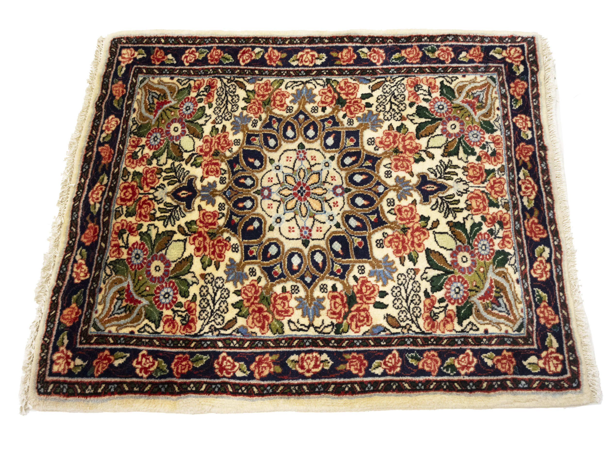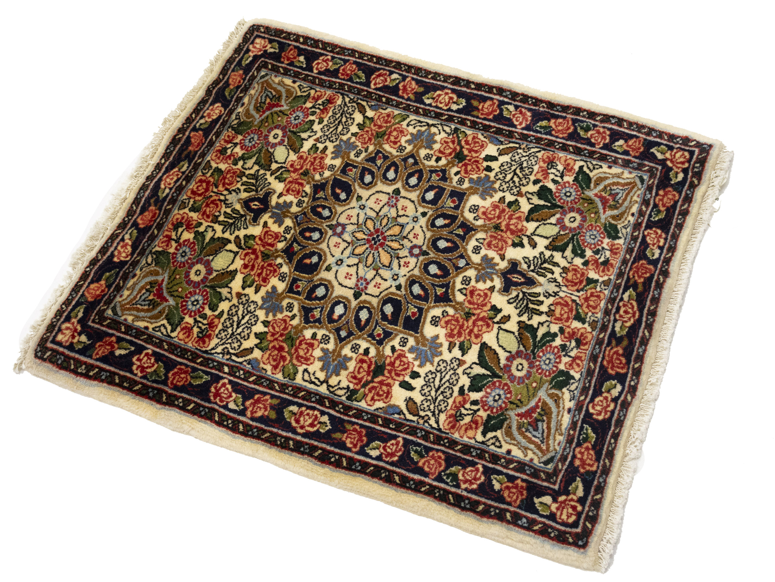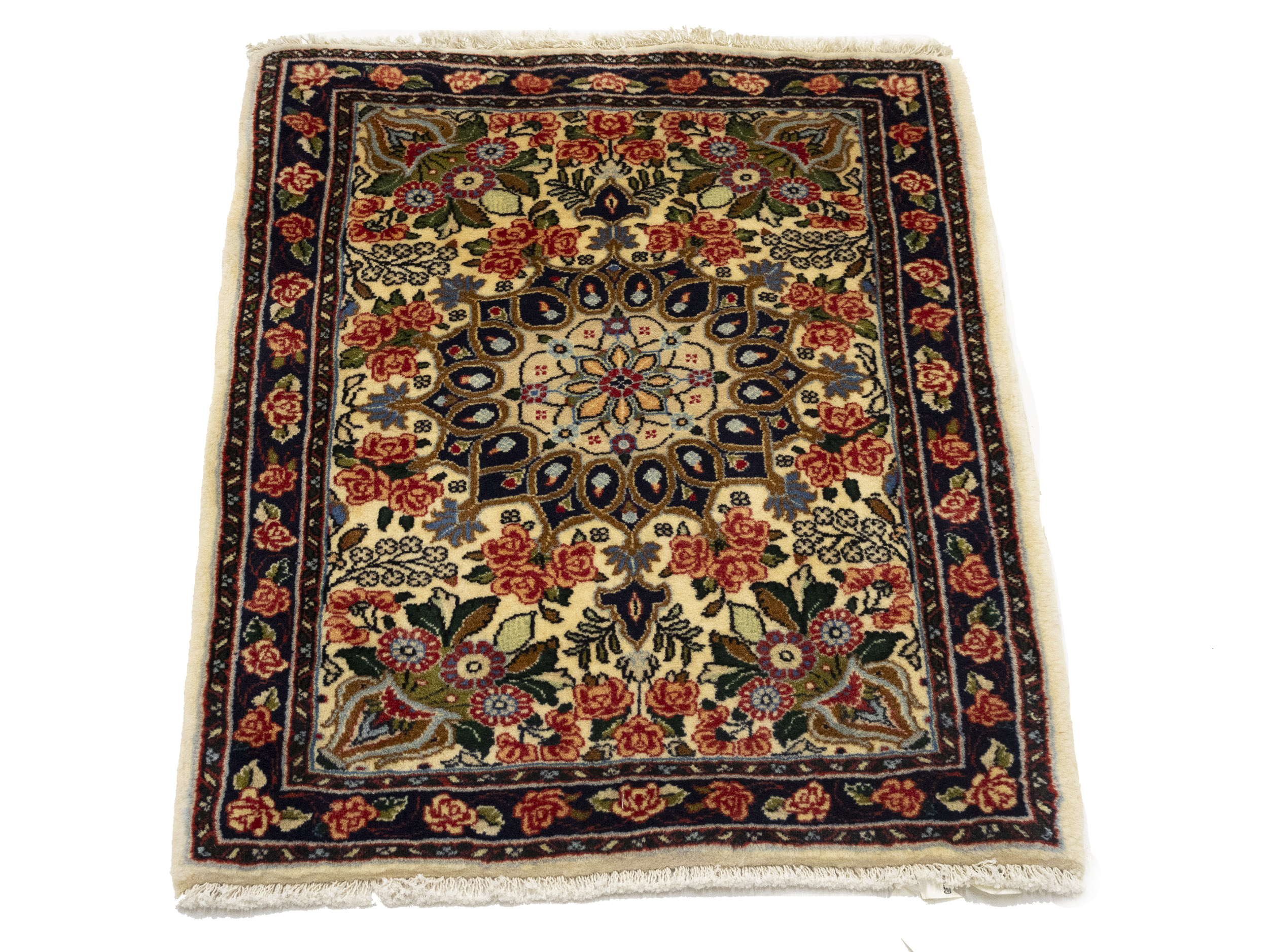 Handmade 2'3X2'7 cream oriental rug made with vegetable dyes (fine wool pile and cotton foundation), exceptional knot count, and appealing ancient designs. This Oriental rug never will go out of style and would be among your most valuable treasures.