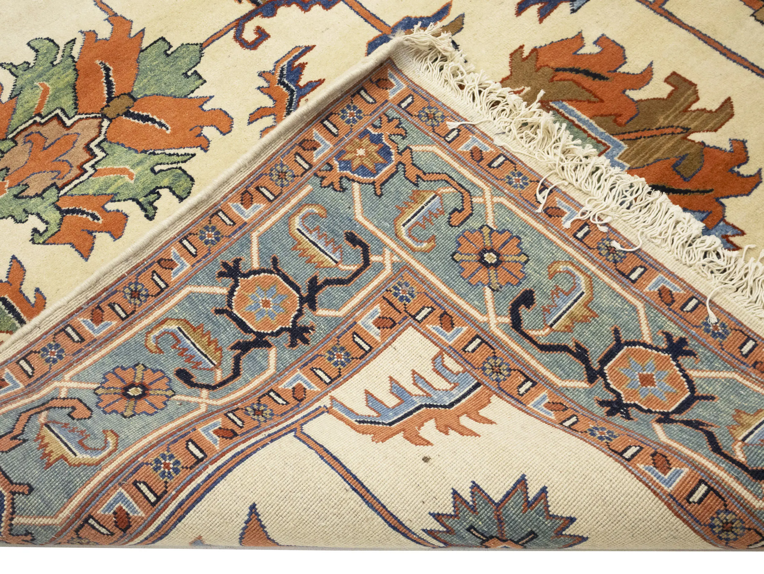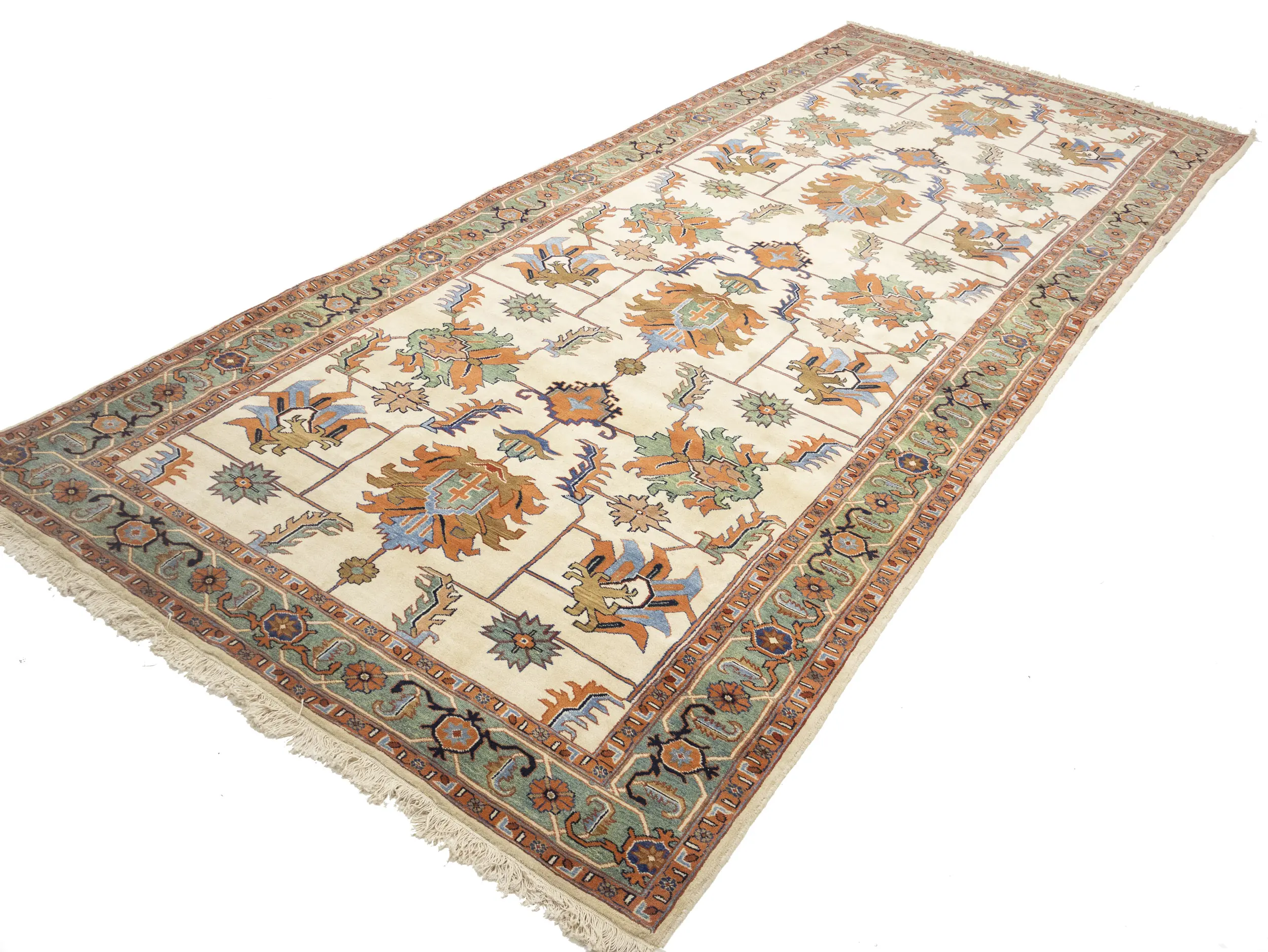 Handmade 7X17 cream Persian rug made with natural dyes (fine wool pile and cotton foundation), superior knot count, and appealing ancient designs. This Oriental rug never will go out of style and would be among your most valuable treasures.