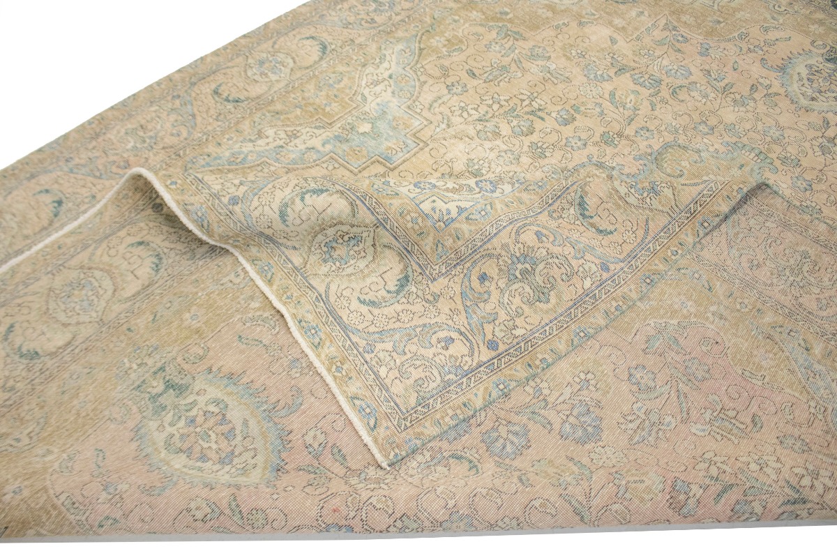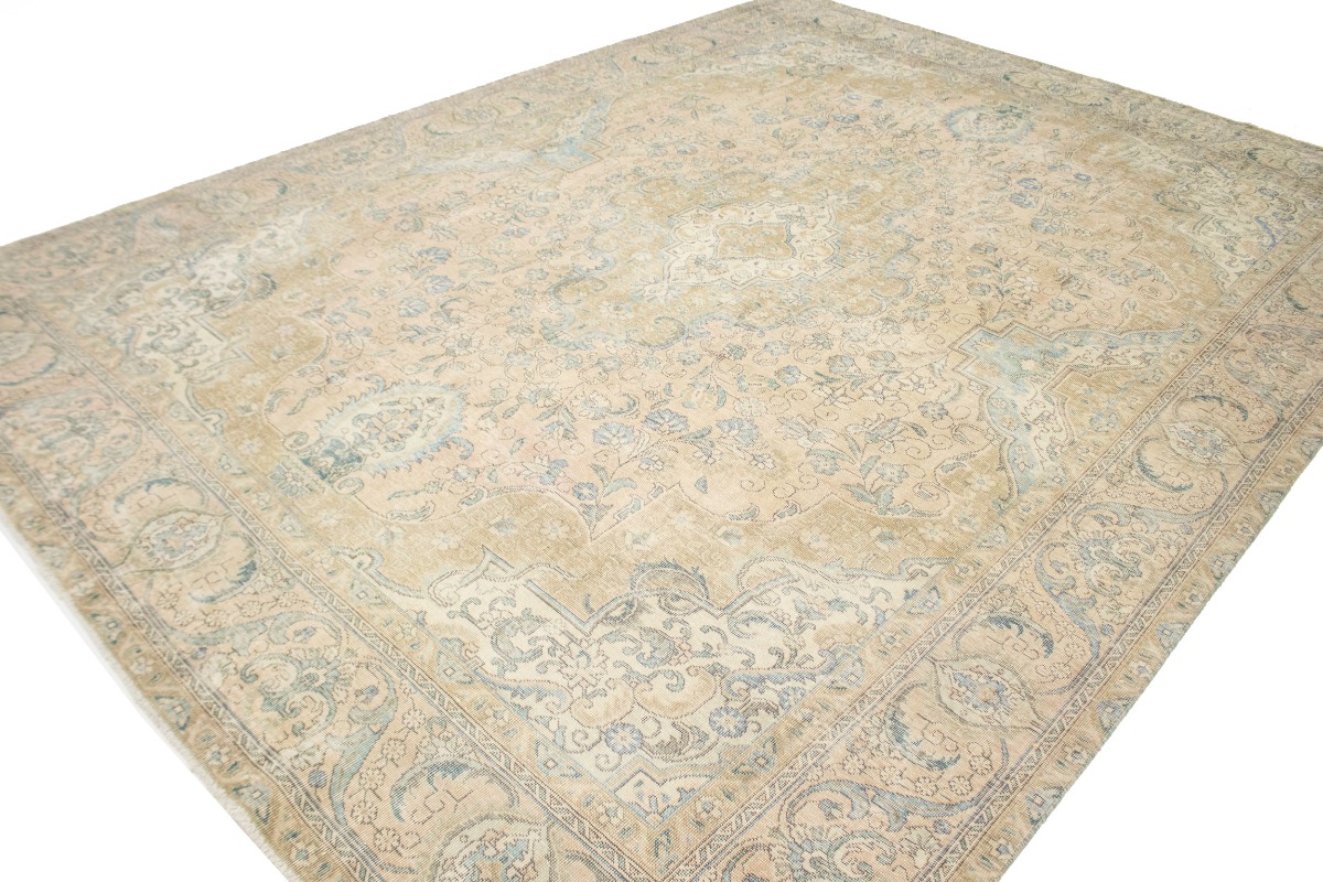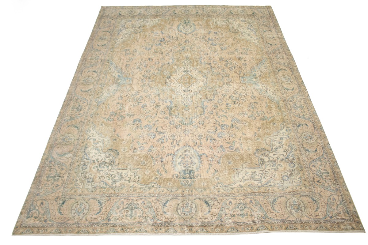 This authentic 10X13 light peach vintage Persian rug was masterly knotted by the hands of weavers inspired by a variety of wonderful artistic designs, to recreate the aged look of the original piece with a richness of color and intricate patterned floral background field. What set this traditional Oriental area rug from the others are the material and dye used (wool pile and cotton foundation), knot count, antique designs, fantastic grades, and its regional historical connection: it has deep roots, from the story of the people who produced it to the meaning of the symbols and colors displayed across its canvas that have been praised for centuries. This classic home décor carpet will be completely cozy and inviting that never will go out of style! Also, this Oriental rug would be among your most valuable treasures, it is a great investment that accrues value over time, and it will last for generations because was woven with high-quality, all-natural wool; it won’t rip, tear, or shed. Environmentally friendly, opulent yet affordable; this Persian rug will give you a thorough amount of character to help define your living space with luxury and warmth that will capture the eyes and attention of your audience (homeowners, designers, decorators, family and friends). EB-4753