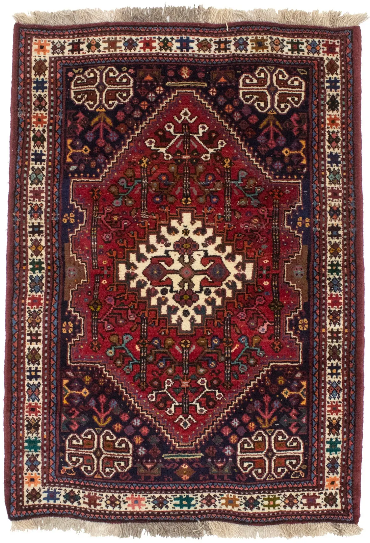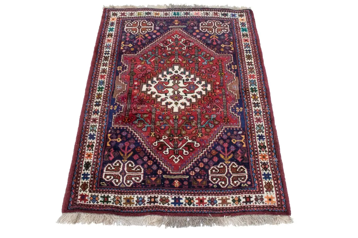Hand Knotted vintage 3'5X5'0 red tribal Persian rug made with natural dyes (fine wool pile and cotton foundation), superior knot count, and appealing ancient designs. This Oriental rug never will go out of style and would be among your most valuable treasures.