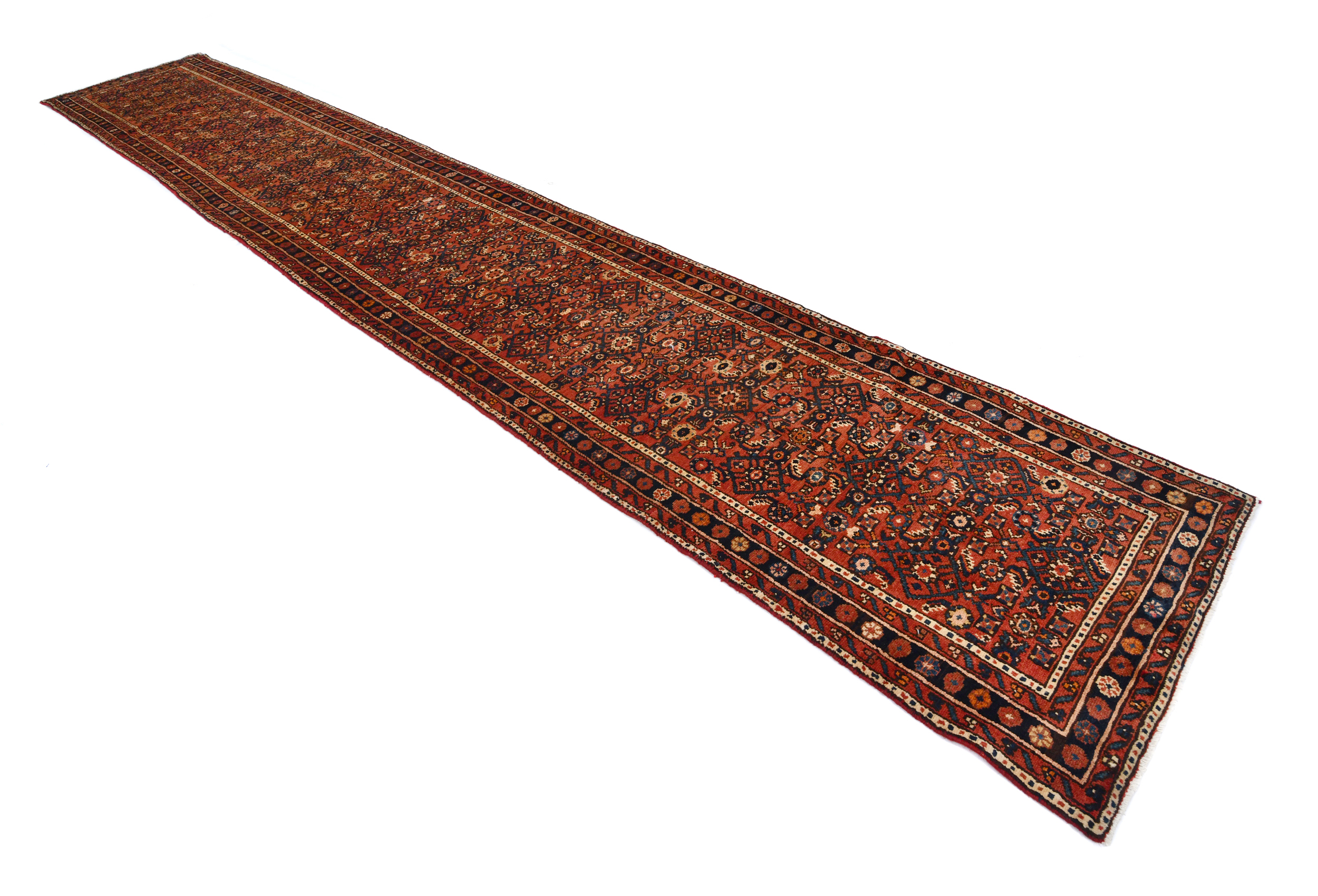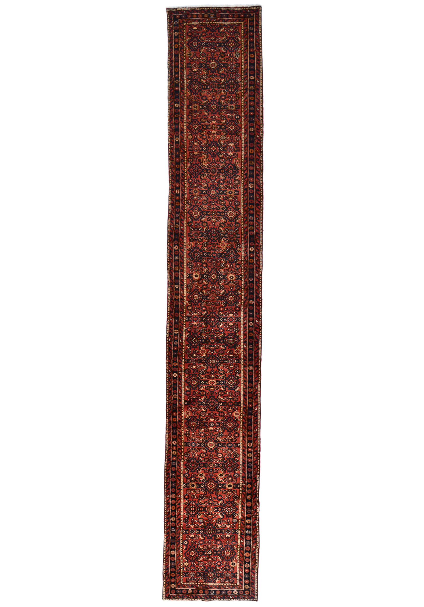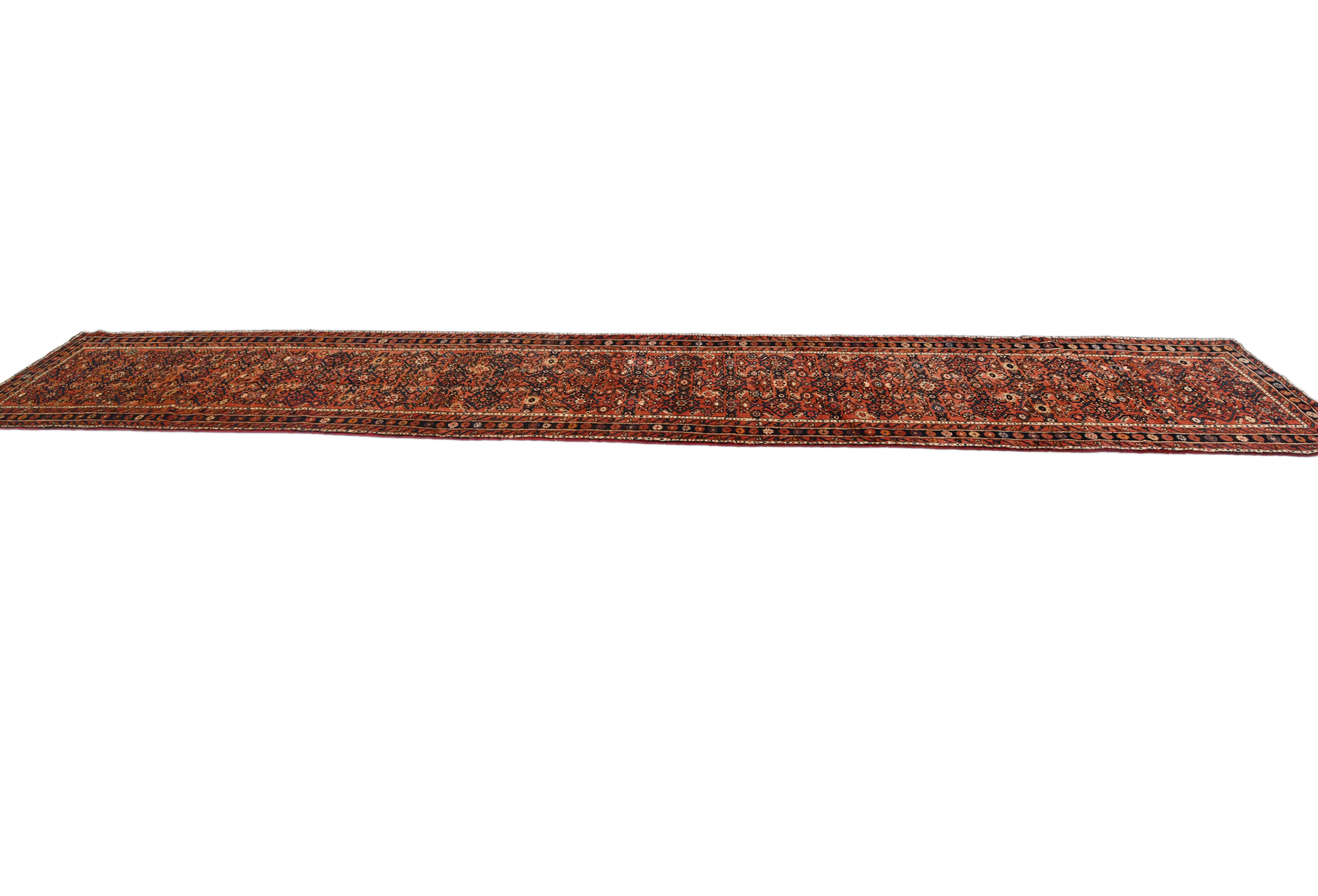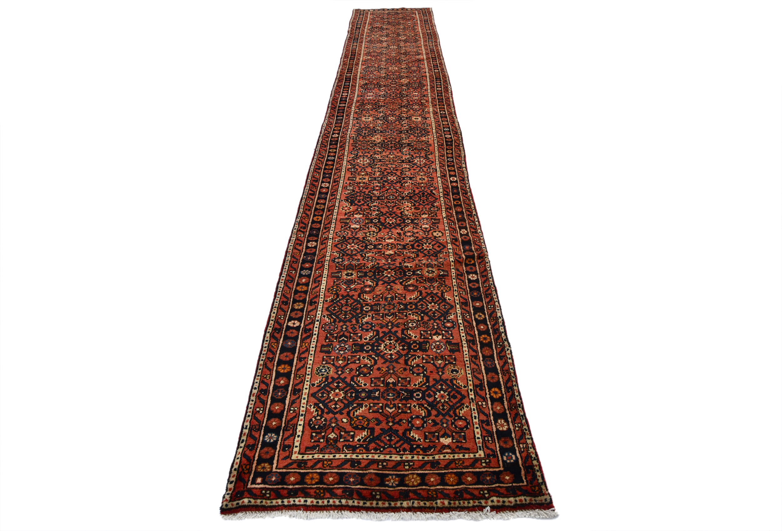 Handmade vintage 3X17 rusty red Persian runner made with vegetable dyes (fine wool pile and cotton foundation), superior knot count, and alluring ancient designs. This Oriental runner never will go out of style and would be among your most valuable treasures.