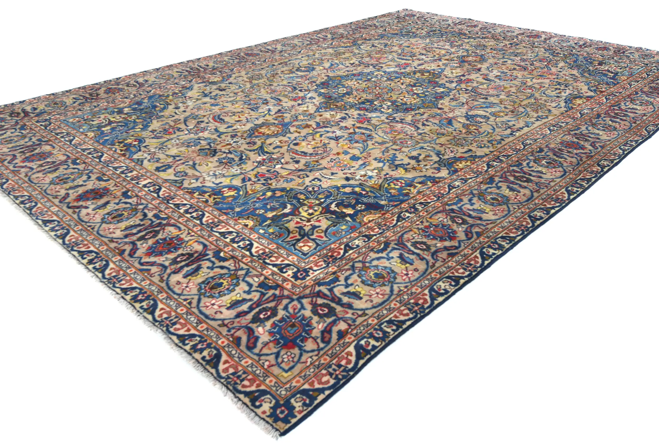 This authentic 9X13 beige vintage Persian rug was finely knotted by the hands of weavers influenced by a variety of amazing artistic designs, to recreate the aged look of the exceptional piece with a richness of color and embellished floral background field. What set this traditional Oriental area rug from the others are the material and dye used (wool pile and cotton foundation), knot count, antique designs, fantastic grades, and its regional historical connection: it has deep roots, from the story of the people who produced it to the meaning of the symbols and colors displayed across its canvas that have been praised for centuries. This classic home décor carpet will be completely cozy and inviting that never will go out of style! Also, this Oriental rug would be among your most valuable treasures, it is a great investment that increase in value over time, and it will last a lifetime because was woven with high-quality, all-natural wool; it won’t rip, tear, or shed. Eco-friendly, opulent yet affordable; this Persian rug will give you an extra pop of character to help define your home environment with luxury and warmth that will capture the eyes and attention of your audience (homeowners, designers, decorators, family and friends). EB-7677