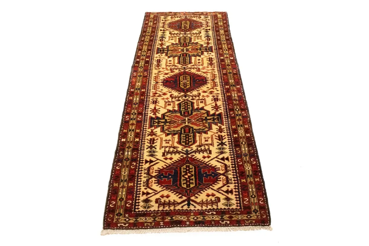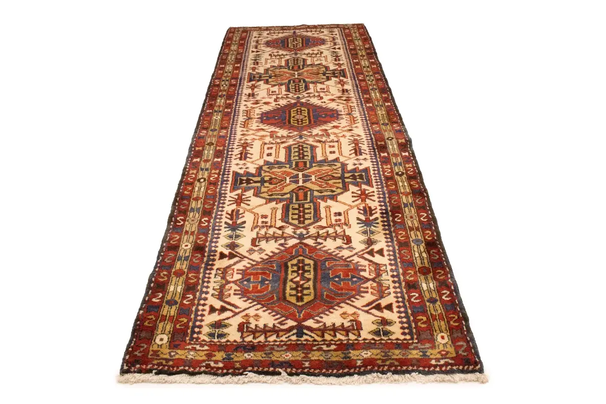 Hand Knotted semi antique 4X11 cream Persian runner made with vegetable dyes (fine wool pile and cotton foundation), superior knot count, and appealing ancient designs. This Oriental runner never will go out of style and would be among your most valuable treasures.
