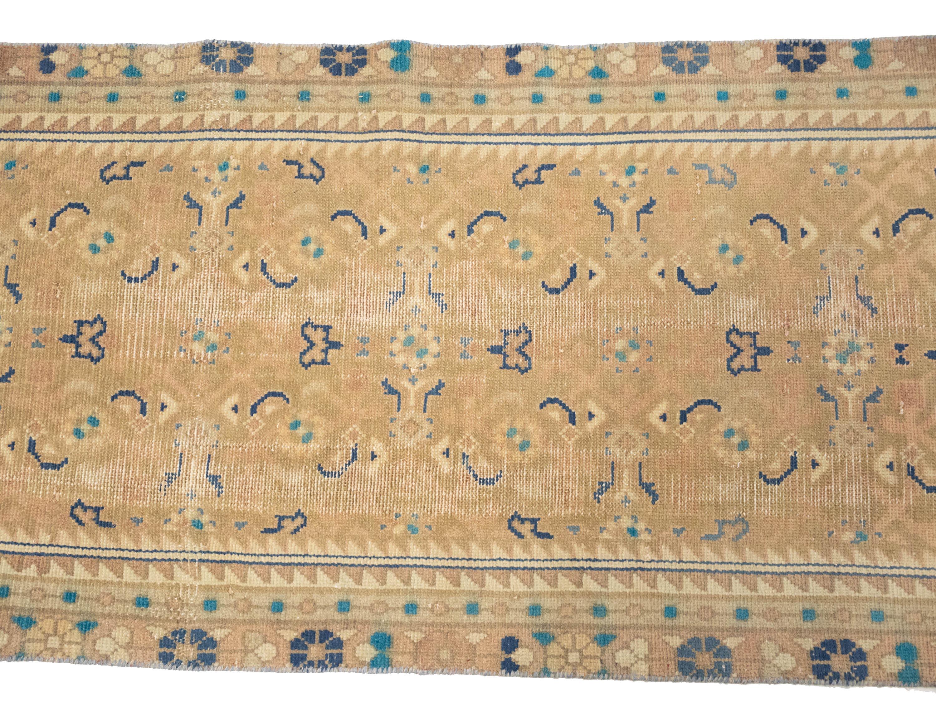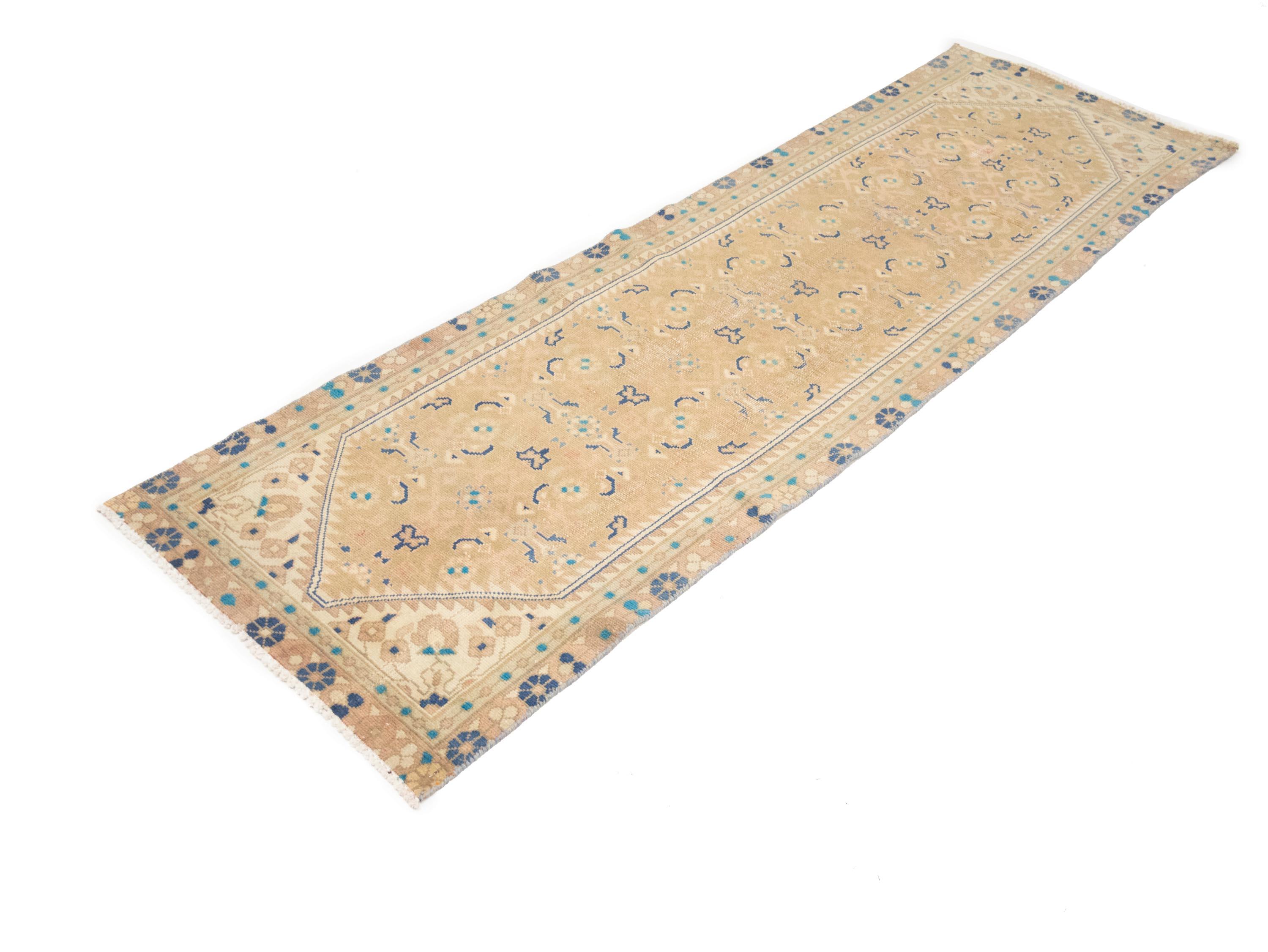 This original 3X9 beige vintage Persian runner was crafted by the hands of skilled weavers enthused by a variety of lovely artistic designs, to recreate the aged look of the unique piece with a richness of color and beautifully elaborated background field. What set this tribal Oriental area runner from the others are the material and dye used (wool pile and cotton foundation), knot count, ancient designs, fantastic grades, and its regional historical connection: it has deep roots, from the story of the people who produced it to the meaning of the symbols and colors displayed across its canvas that have been praised for centuries. This home décor carpet will be completely cozy and inviting that never will go out of style! Also, this Oriental runner would be among your most valuable treasures, it is a great investment that increase in value over time, and it will last for generations because was woven with high-quality, all-natural wool; it won’t rip, tear, or shed. Environmentally friendly, opulent yet affordable; this Persian rug will give you a thorough amount of character to help define your living space with sophistication and warmth that will capture the eyes and attention of your audience (homeowners, designers, decorators, family and friends). EB-7945
