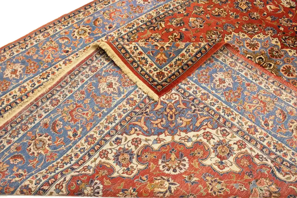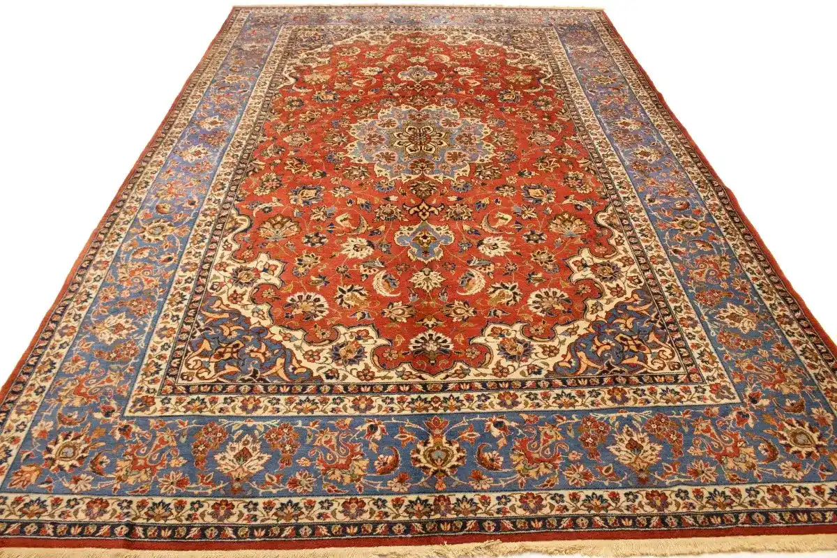 This authentic 9X13 orange-red vintage Persian rug was finely knotted by the hands of weavers influenced by a variety of amazing artistic designs, to recreate the aged look of the exceptional piece with a richness of color and embellished floral background field. What set this traditional Oriental area rug from the others are the material and dye used (wool pile and cotton foundation), knot count, antique designs, fantastic grades, and its regional historical connection: it has deep roots, from the story of the people who produced it to the meaning of the symbols and colors displayed across its canvas that have been praised for centuries. This classic home décor carpet will be completely cozy and inviting that never will go out of style!