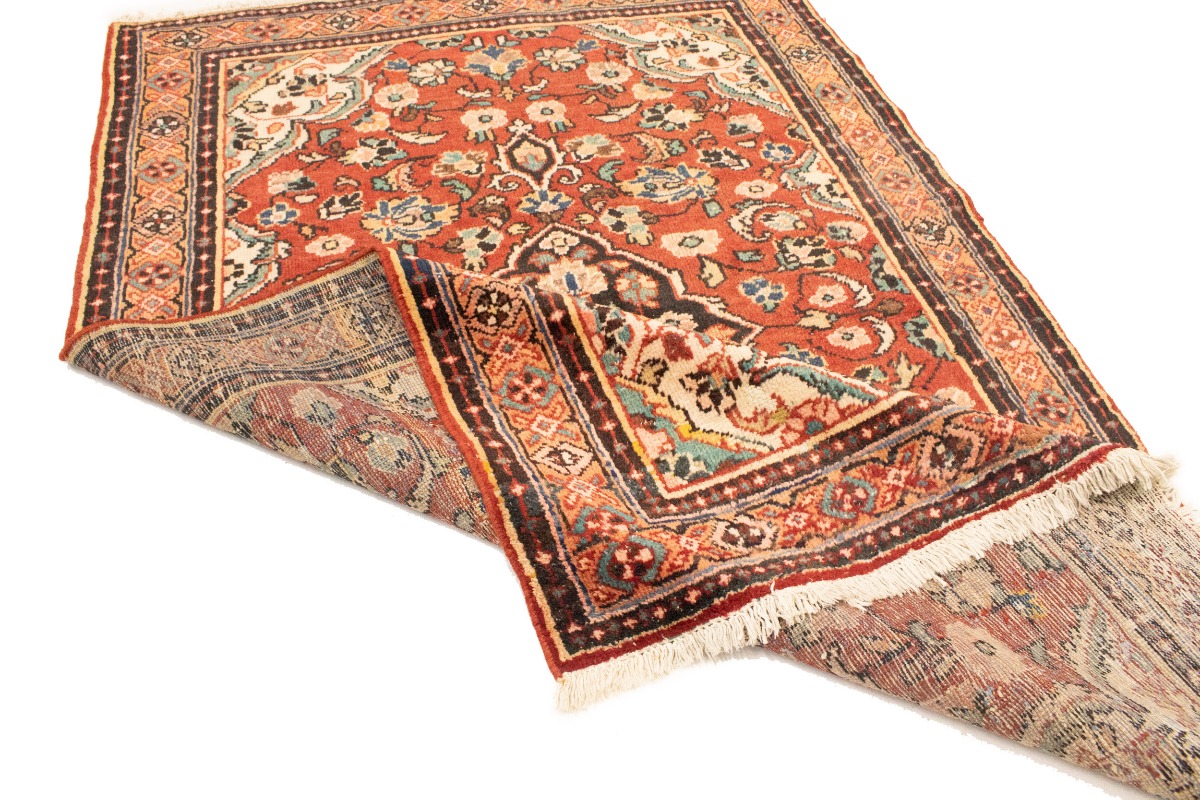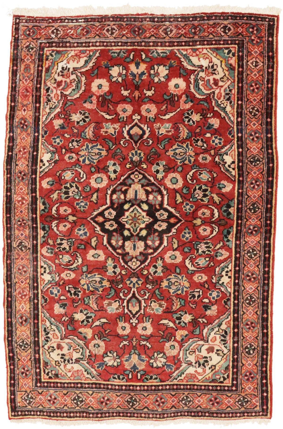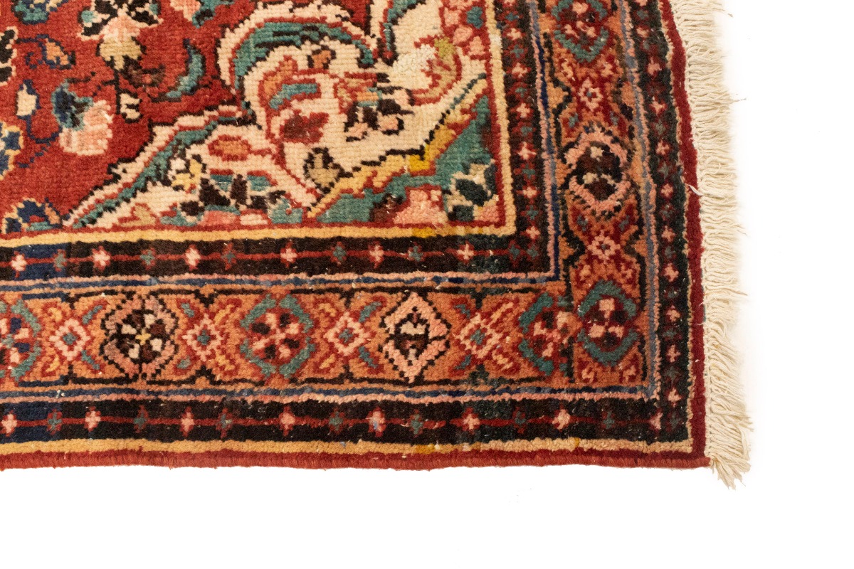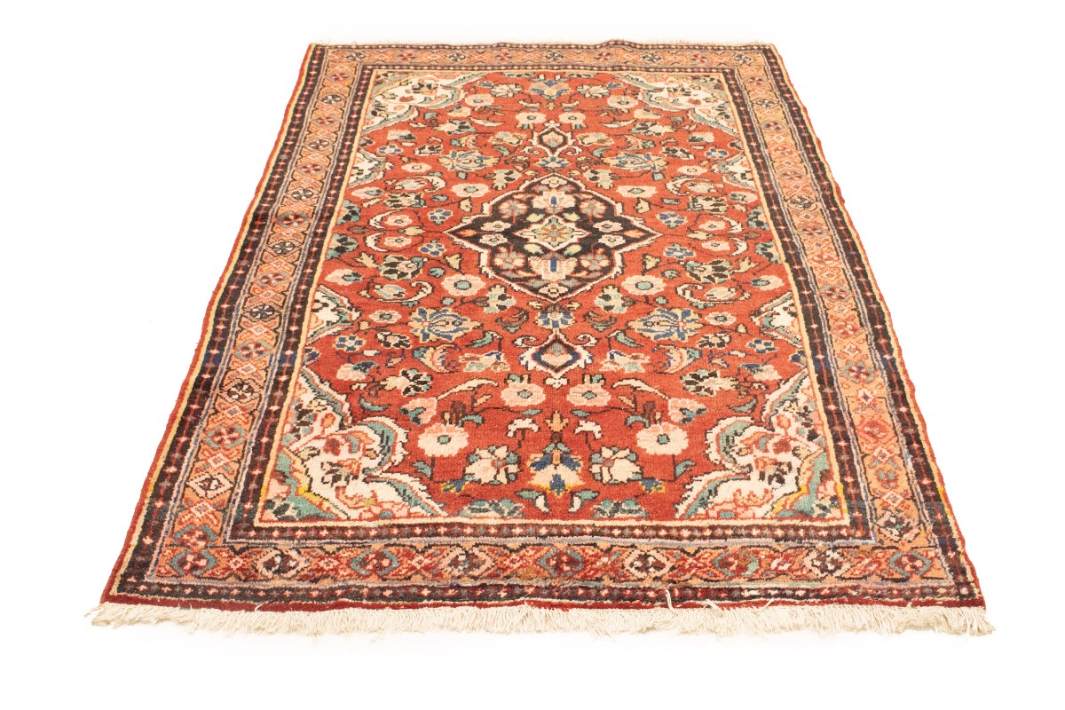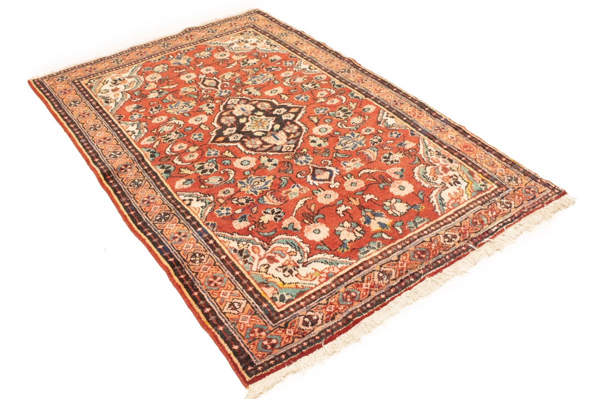 Handmade semi antique 4'3X6'5 red Persian rug made with vegetable dyes (fine wool pile and cotton foundation), superior knot count, and appealing ancient designs. This Oriental rug never will go out of style and would be among your most valuable treasures.