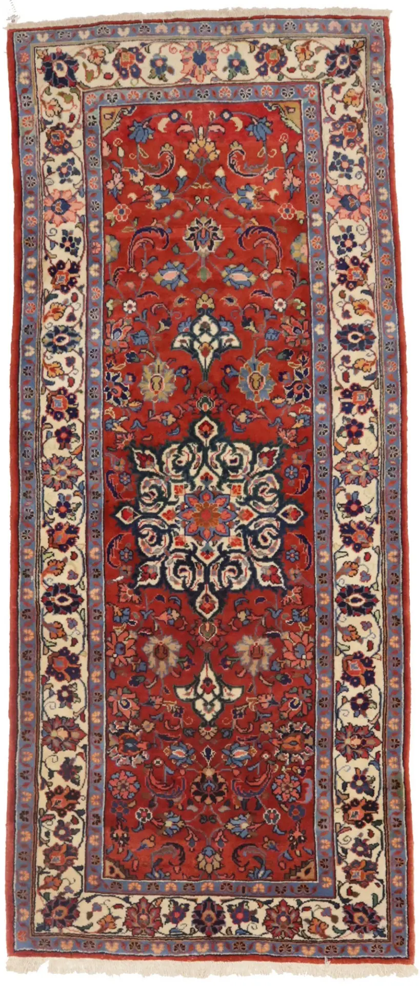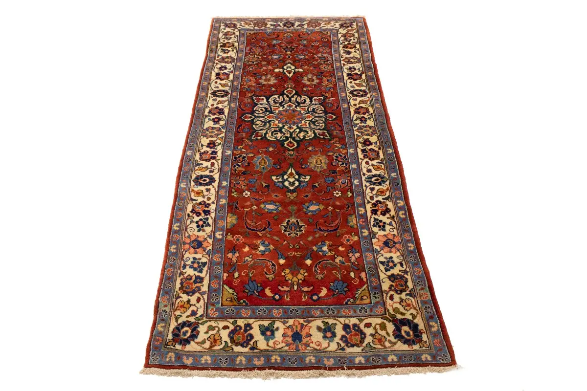 Hand Knotted semi antique 4'5X10'8 red Persian runner made with vegetable dyes (fine wool pile and cotton foundation), exceptional knot count, and appealing ancient designs. This Oriental runner never will go out of style and would be among your most valuable treasures.