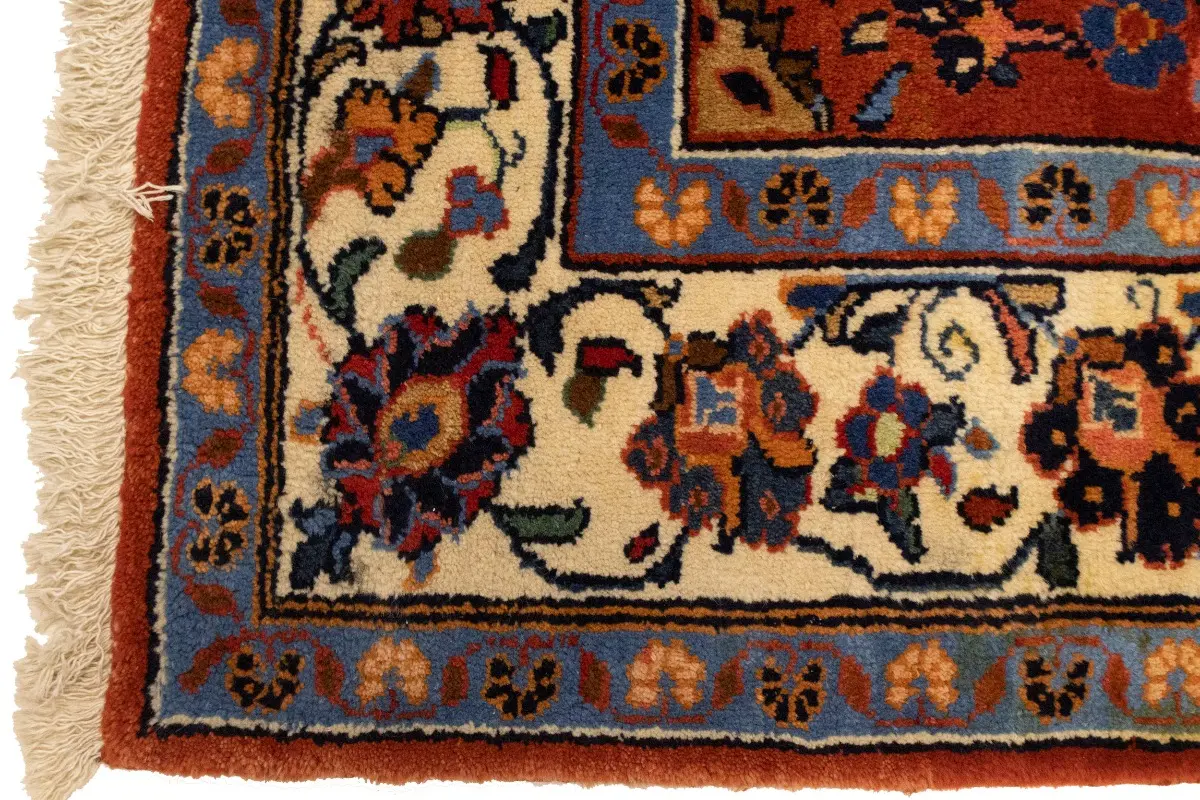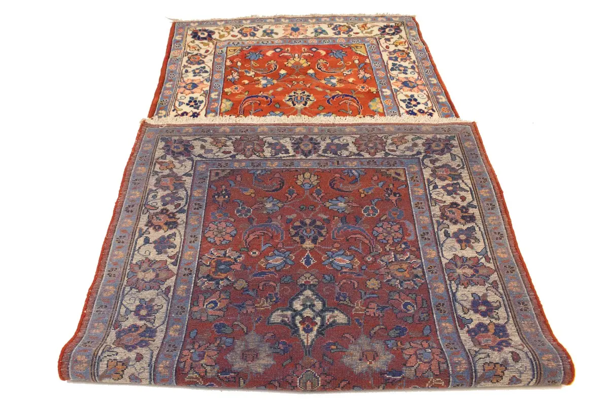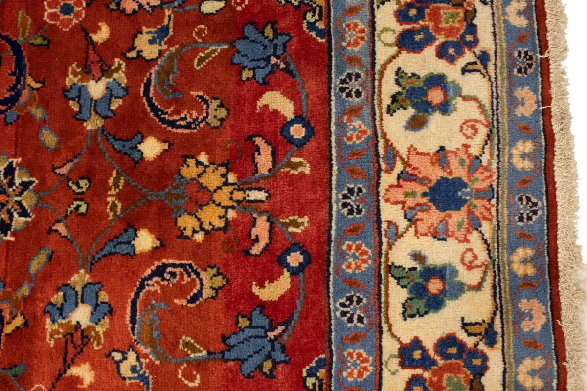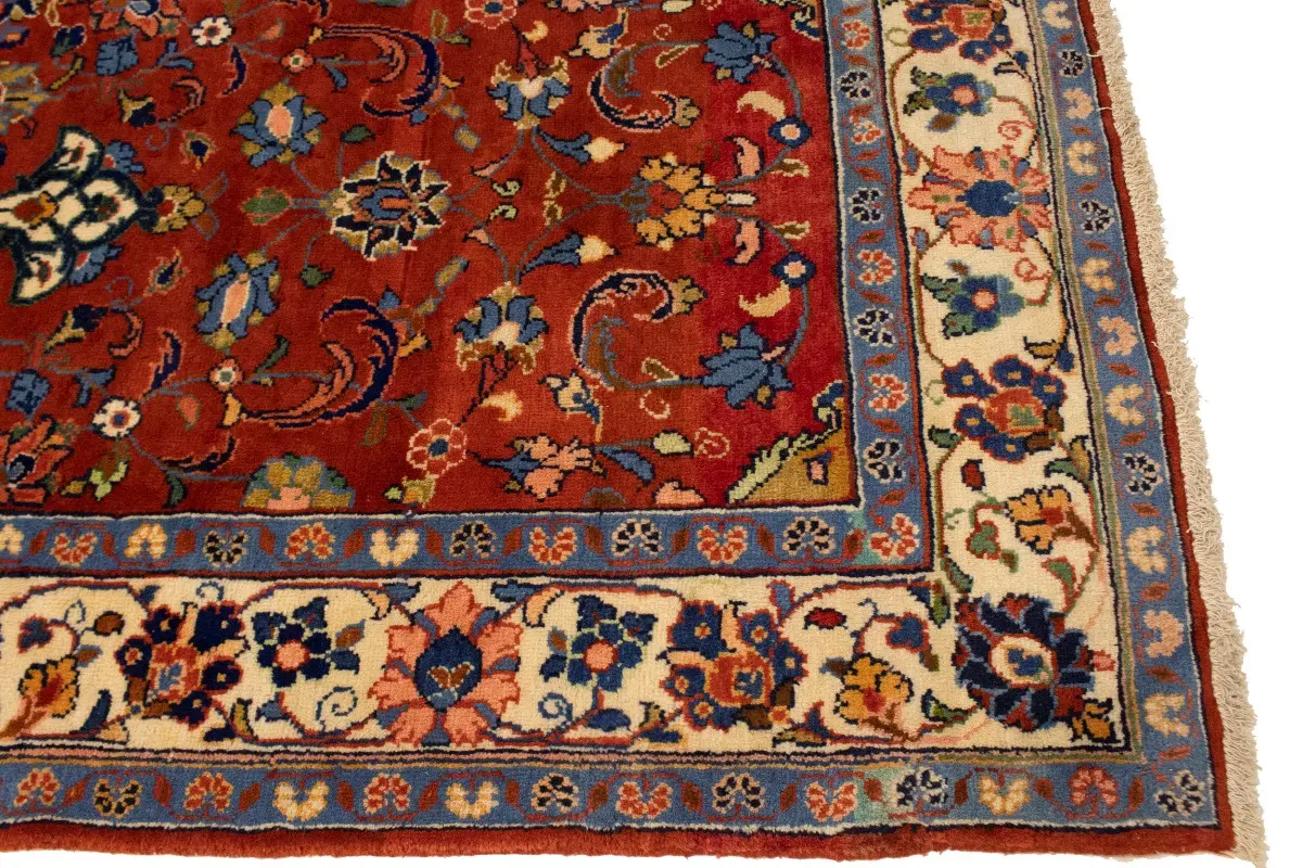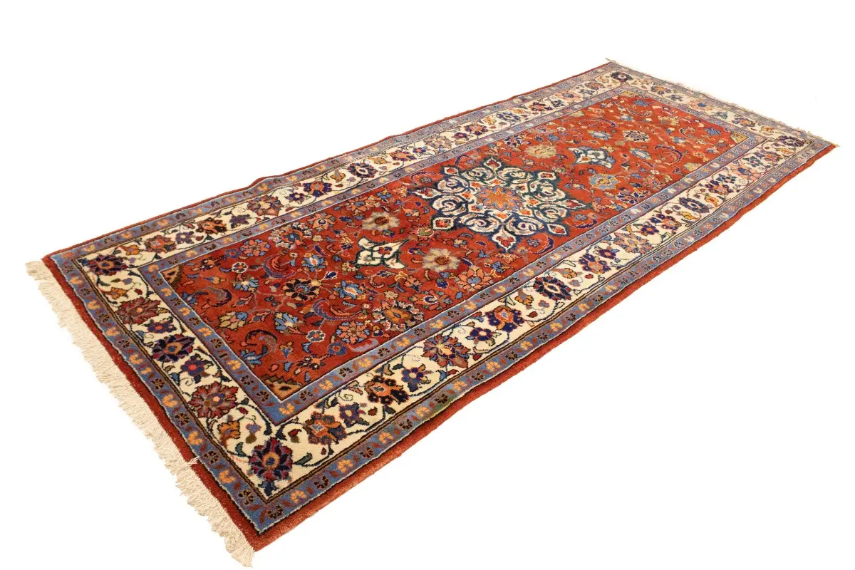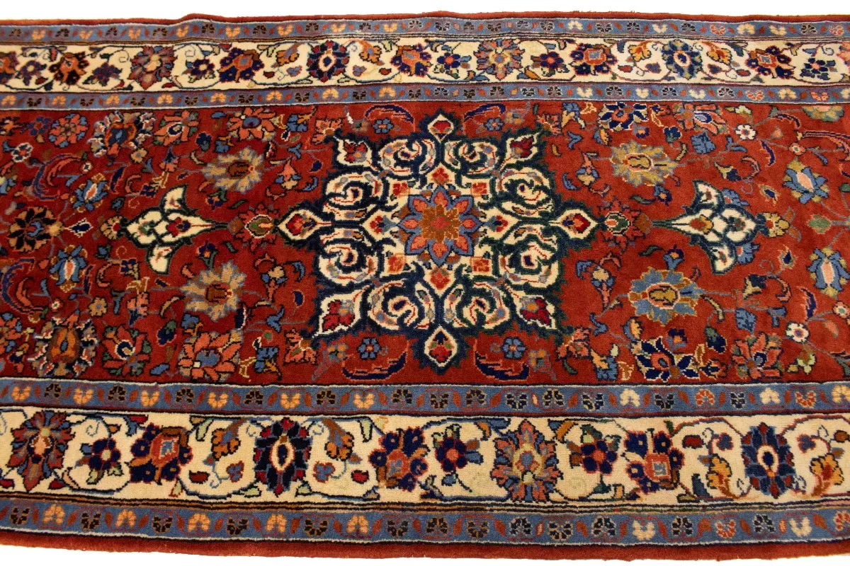 This genuine 4'5X10'8 red vintage Persian runner was made by the hands of talented weavers influenced by a variety of gorgeous symmetrical artistic designs, to recreate the aged look of the unique piece with a richness of color and very balanced floral background field. What set this traditional Oriental area runner from the others are the material and dye used (wool pile and cotton foundation), knot count, antique designs, fantastic grades, and its regional historical connection: it has deep roots, from the story of the people who produced it to the meaning of the symbols and colors displayed across its canvas that have been praised for centuries. This classic home décor carpet will be completely cozy and inviting that never will go out of style! Also, this Oriental rug would be among your most valuable treasures, it is a great investment that accrues value over time, and it will last a lifetime because was woven with high-quality, all-natural wool; it won’t rip, tear, or shed. Eco-friendly, opulent yet affordable; this Persian rug will give you an extra pop of character to help define your home environment with sophistication and warmth that will capture the eyes and attention of your audience (homeowners, designers, decorators, family and friends). EB-5582