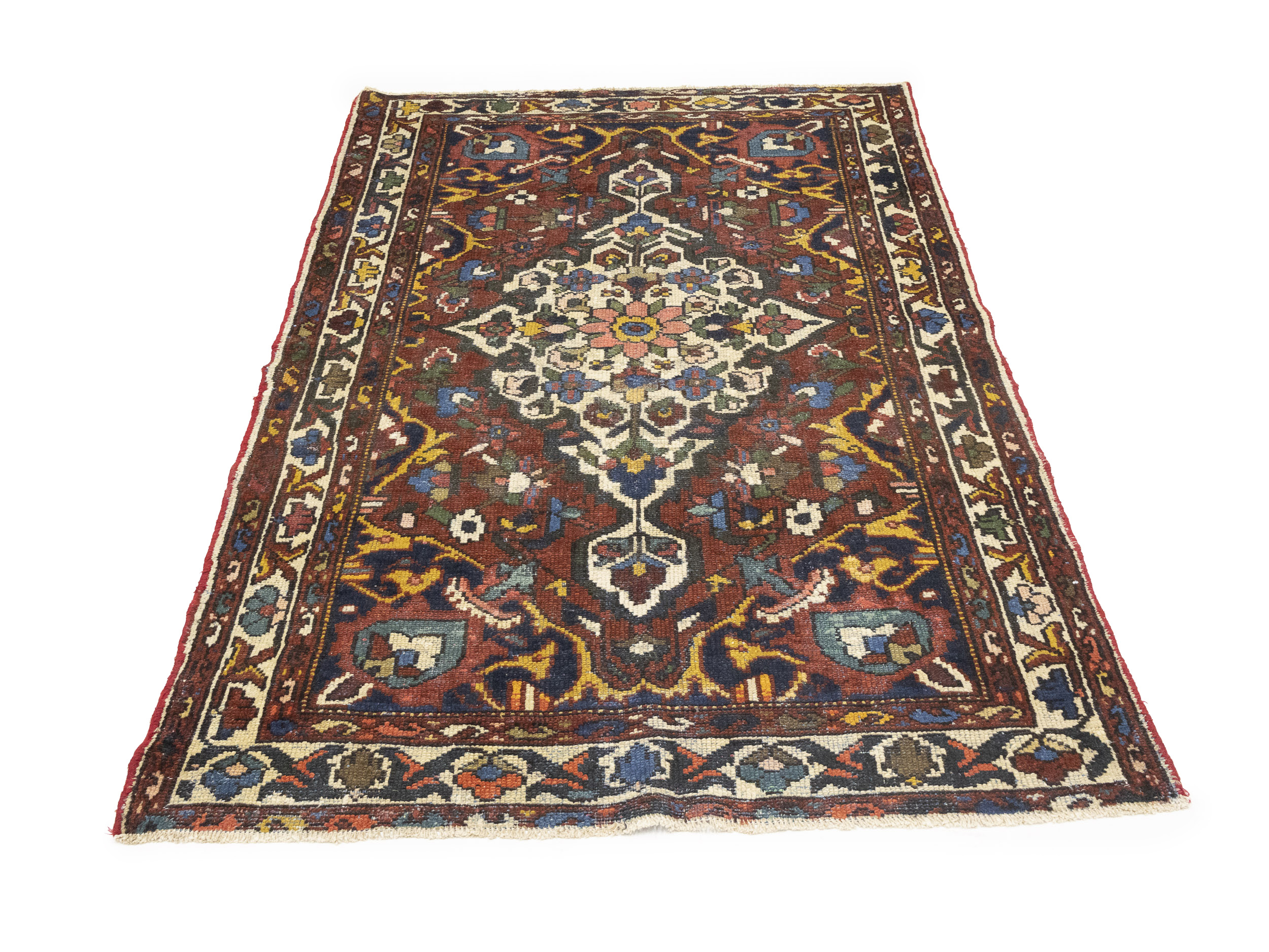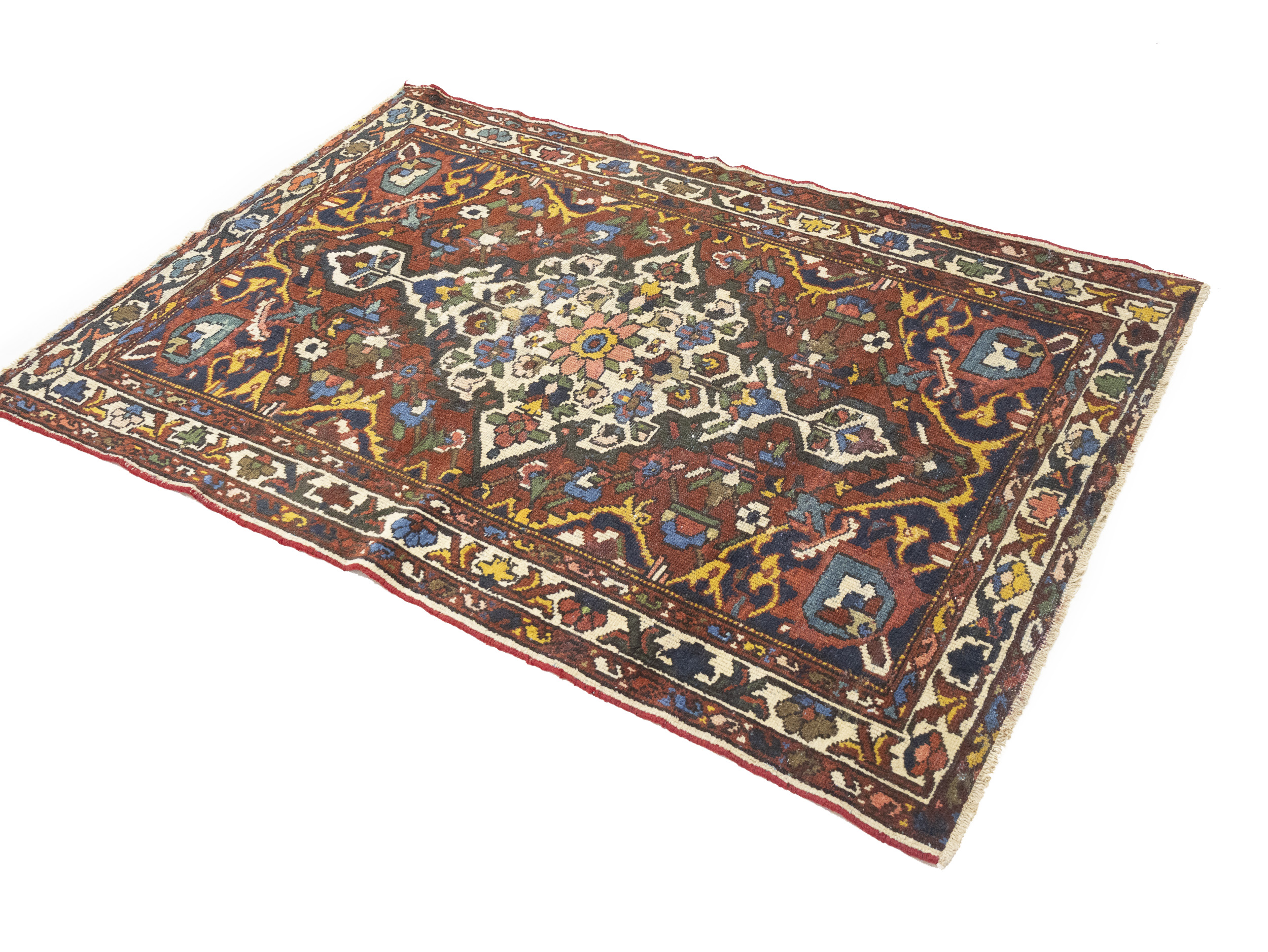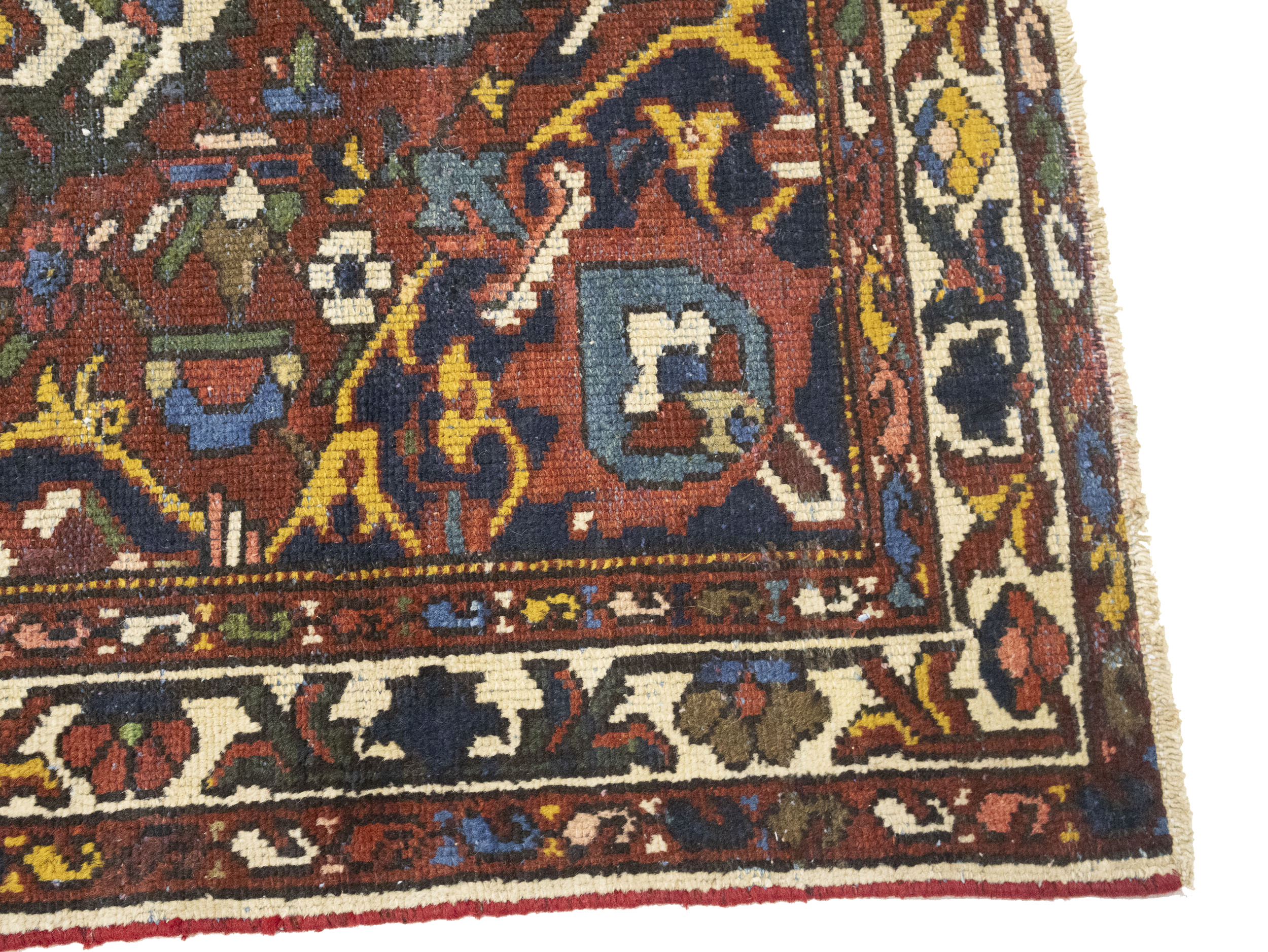 Handmade semi antique 4'5X6'5 red Persian rug made with vegetable dyes (fine wool pile and cotton foundation), superior knot count, and appealing ancient designs. This Oriental rug never will go out of style and would be among your most valuable treasures.