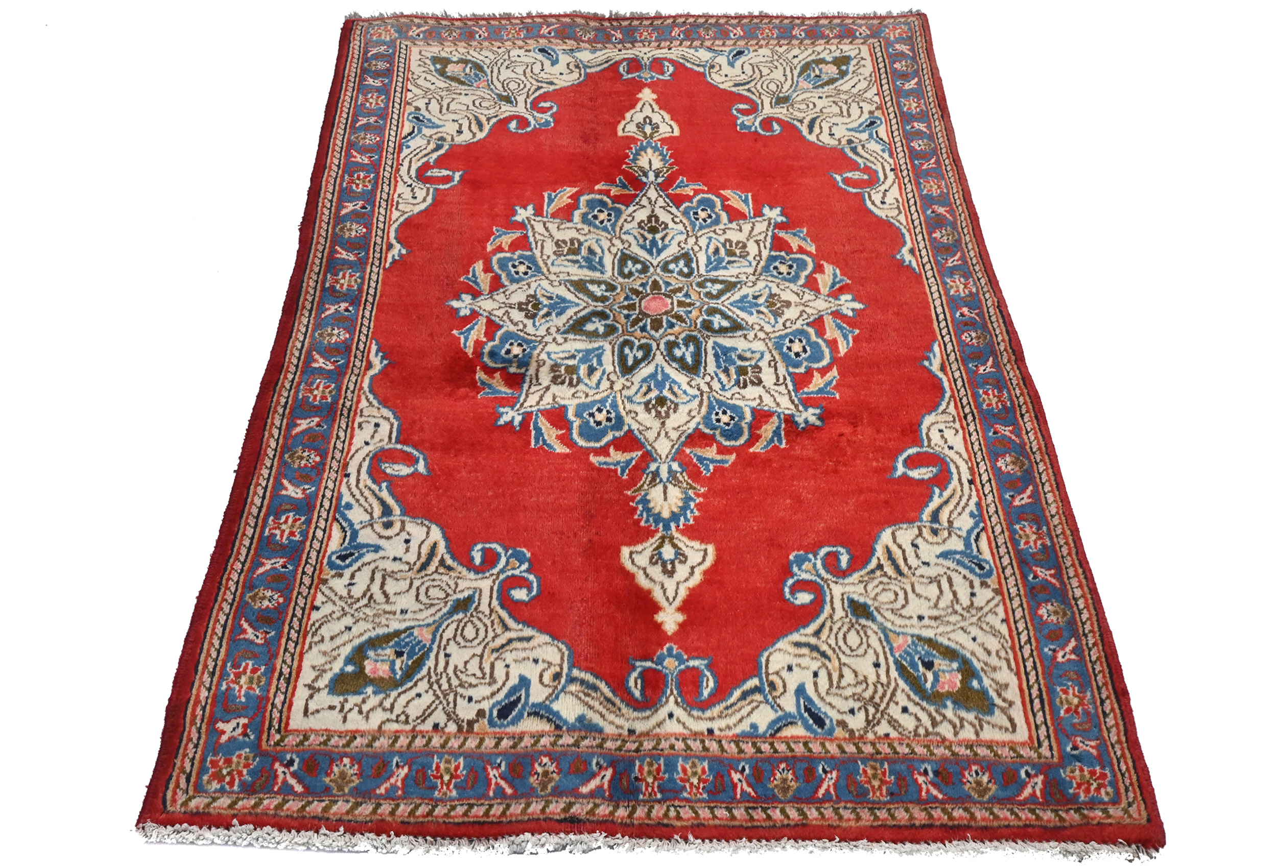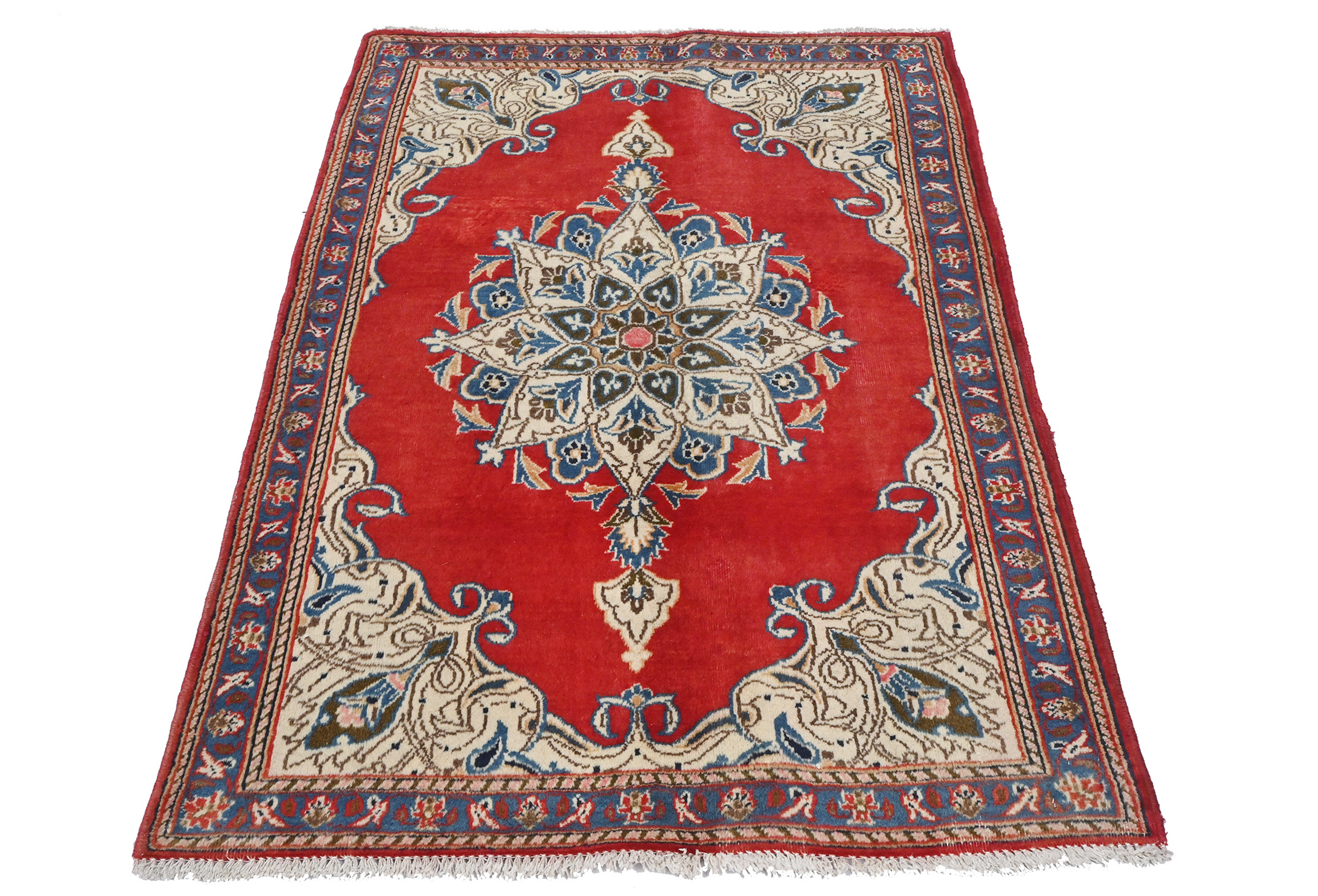 Handmade semi antique 3X5 red Persian rug made with vegetable dyes (fine wool pile and cotton foundation), superior knot count, and alluring ancient designs. This Oriental rug never will go out of style and would be among your most valuable treasures.