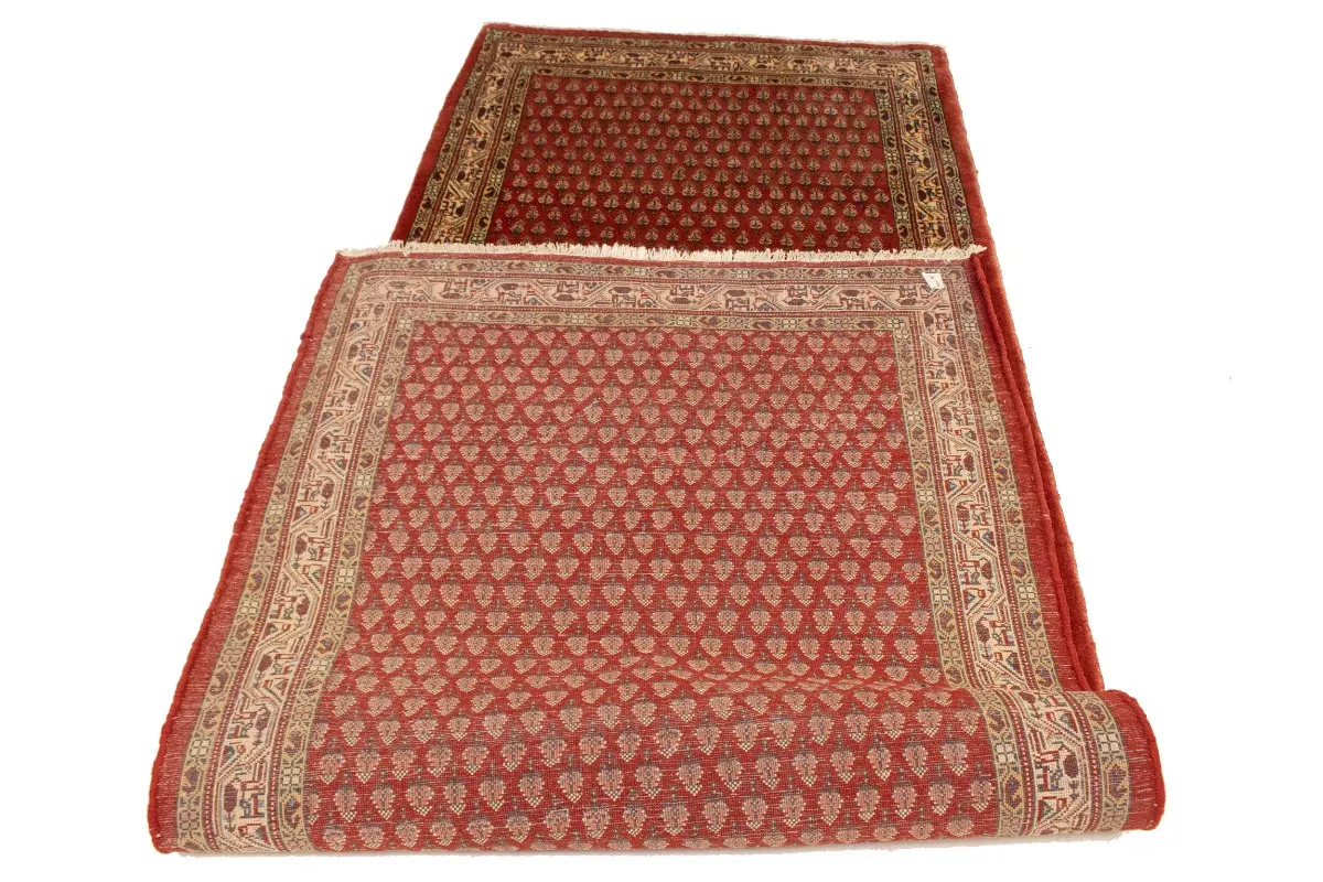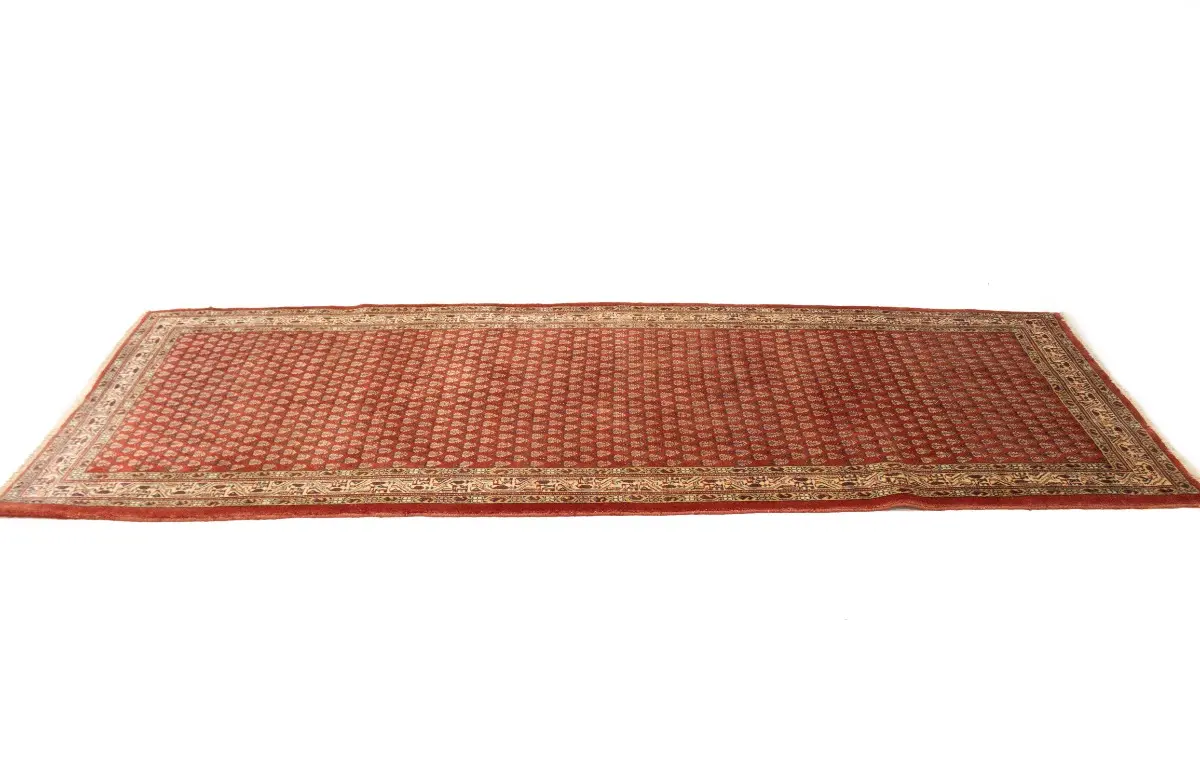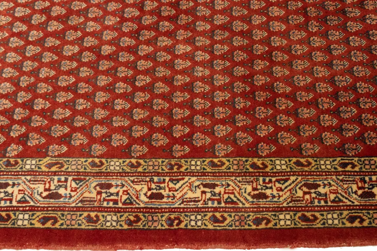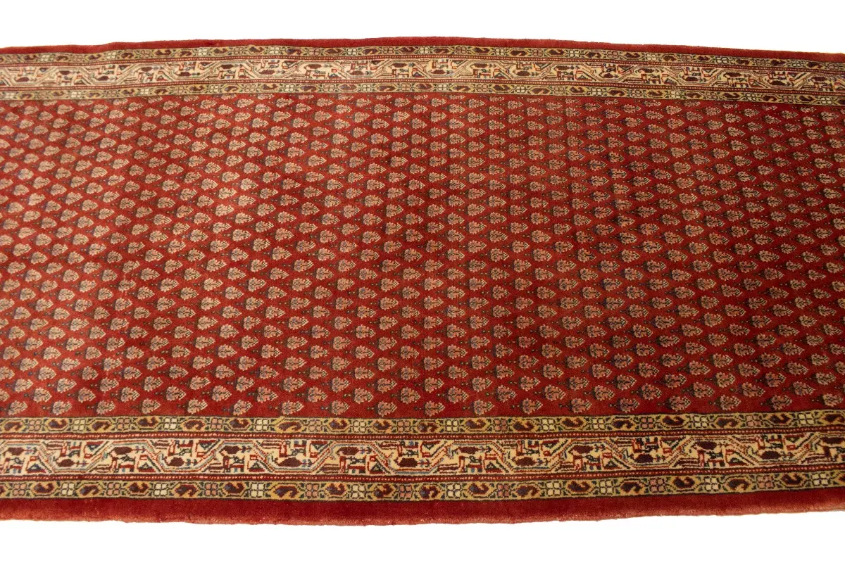 Hand Knotted semi antique 4X10 red Persian runner made with vegetable dyes (fine wool pile and cotton foundation), exceptional knot count, and appealing ancient designs. This Oriental runner never will go out of style and would be among your most valuable treasures.