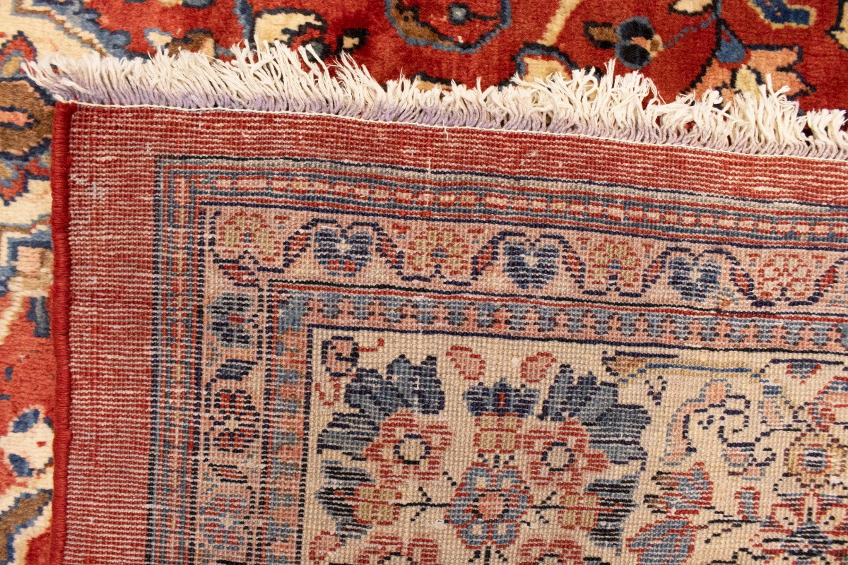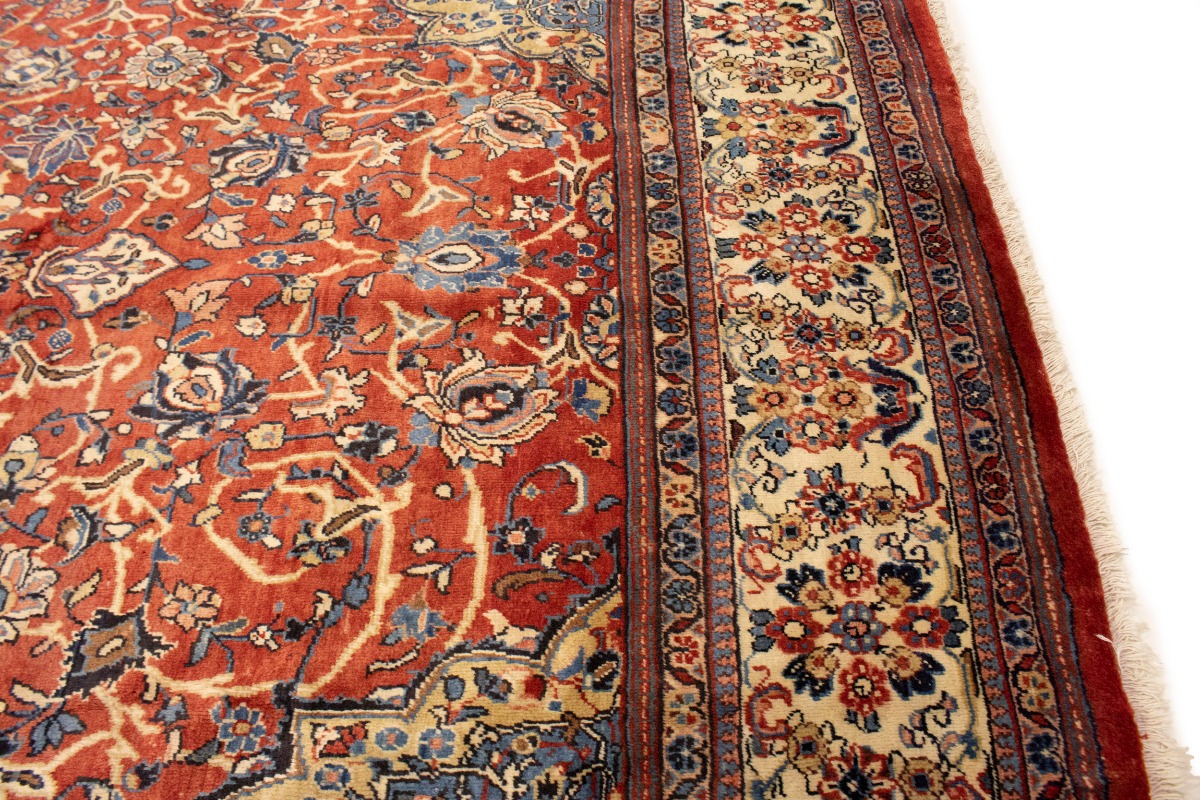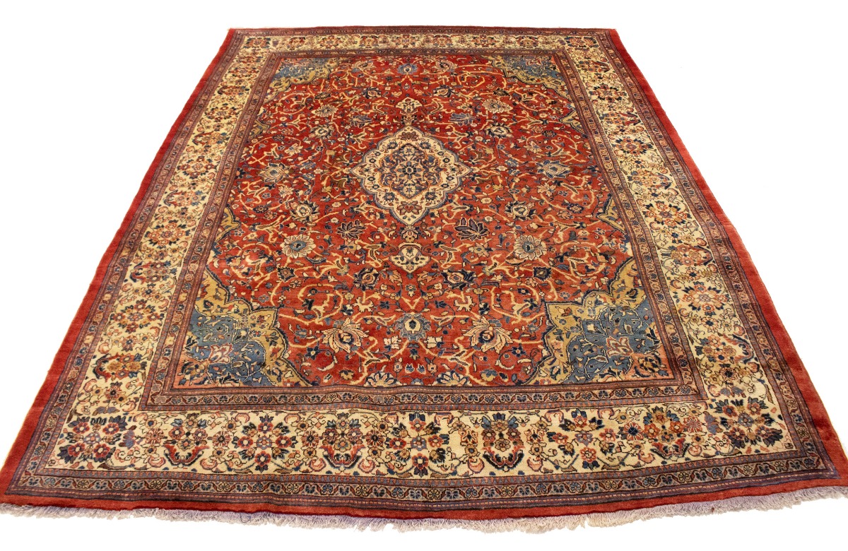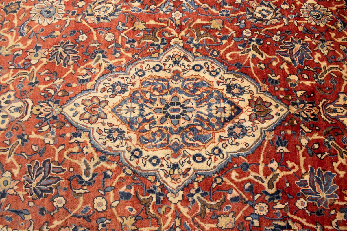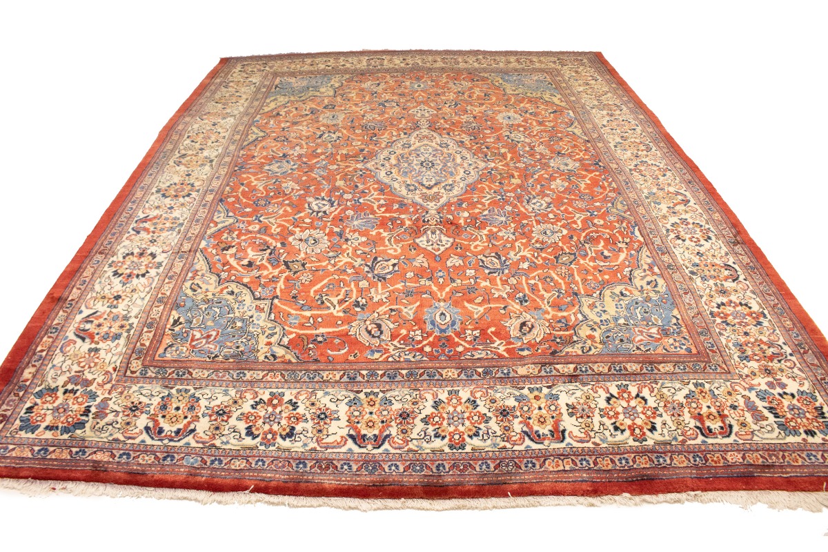 Handmade semi antique 10X14 red Persian rug made with vegetable dyes (fine wool pile and cotton foundation), superior knot count, and appealing ancient designs. This Oriental rug never will go out of style and would be among your most valuable treasures.
