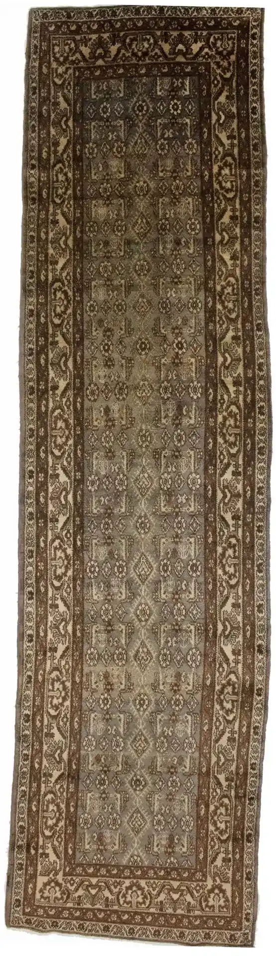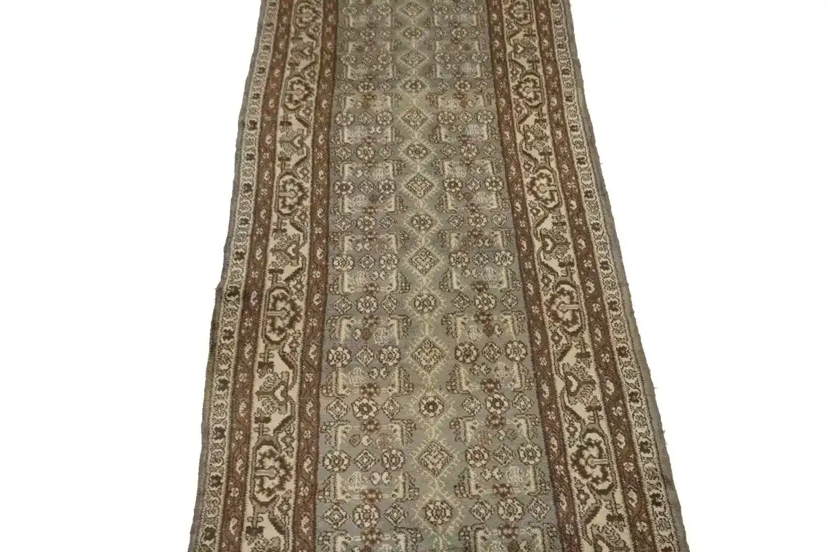 Hand Knotted semi antique 4X15 Persian palace runner made with vegetable dyes (fine wool pile and cotton foundation), exceptional knot count, and appealing ancient designs. This Oriental palace runner never will go out of style and would be among your most valuable treasures.