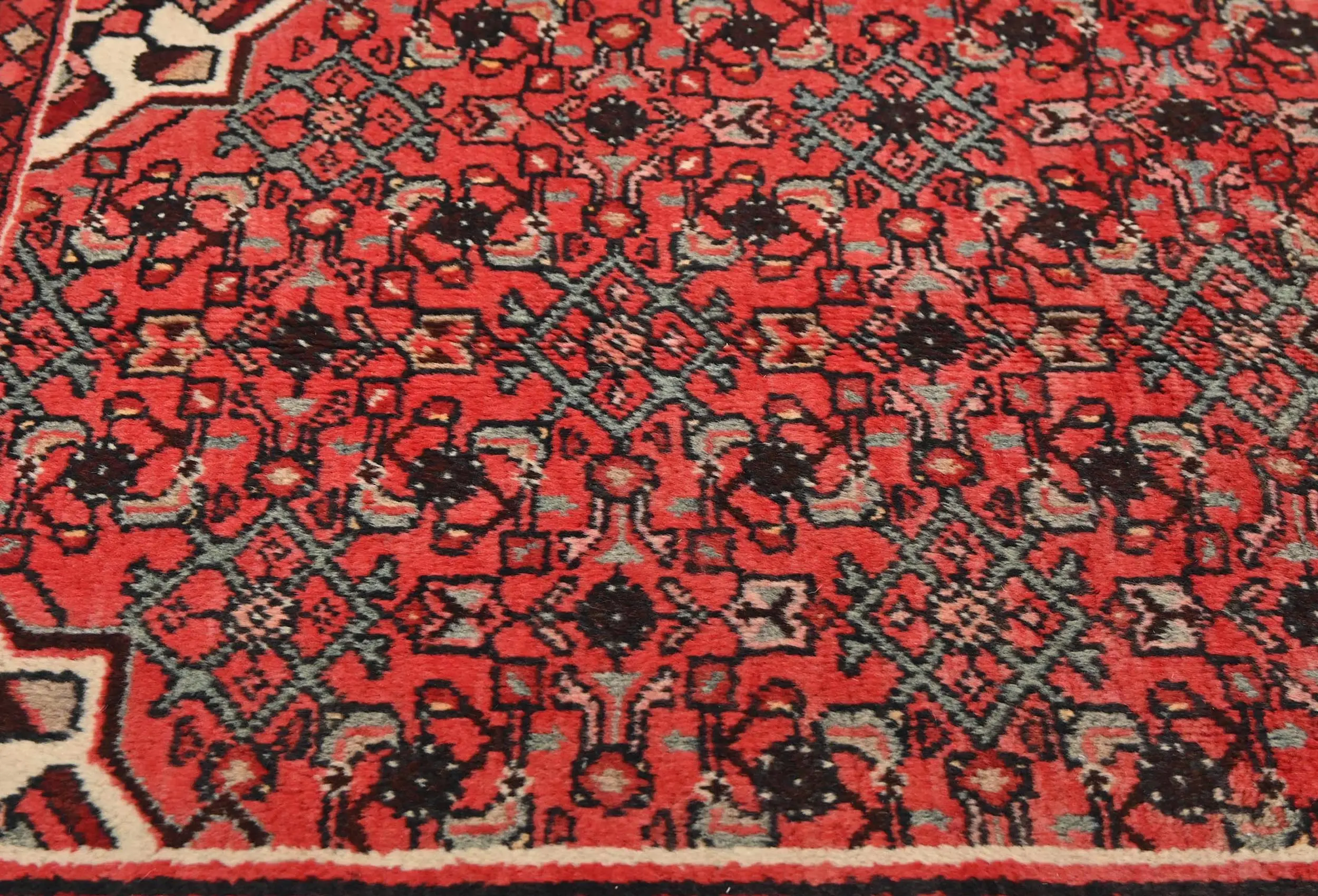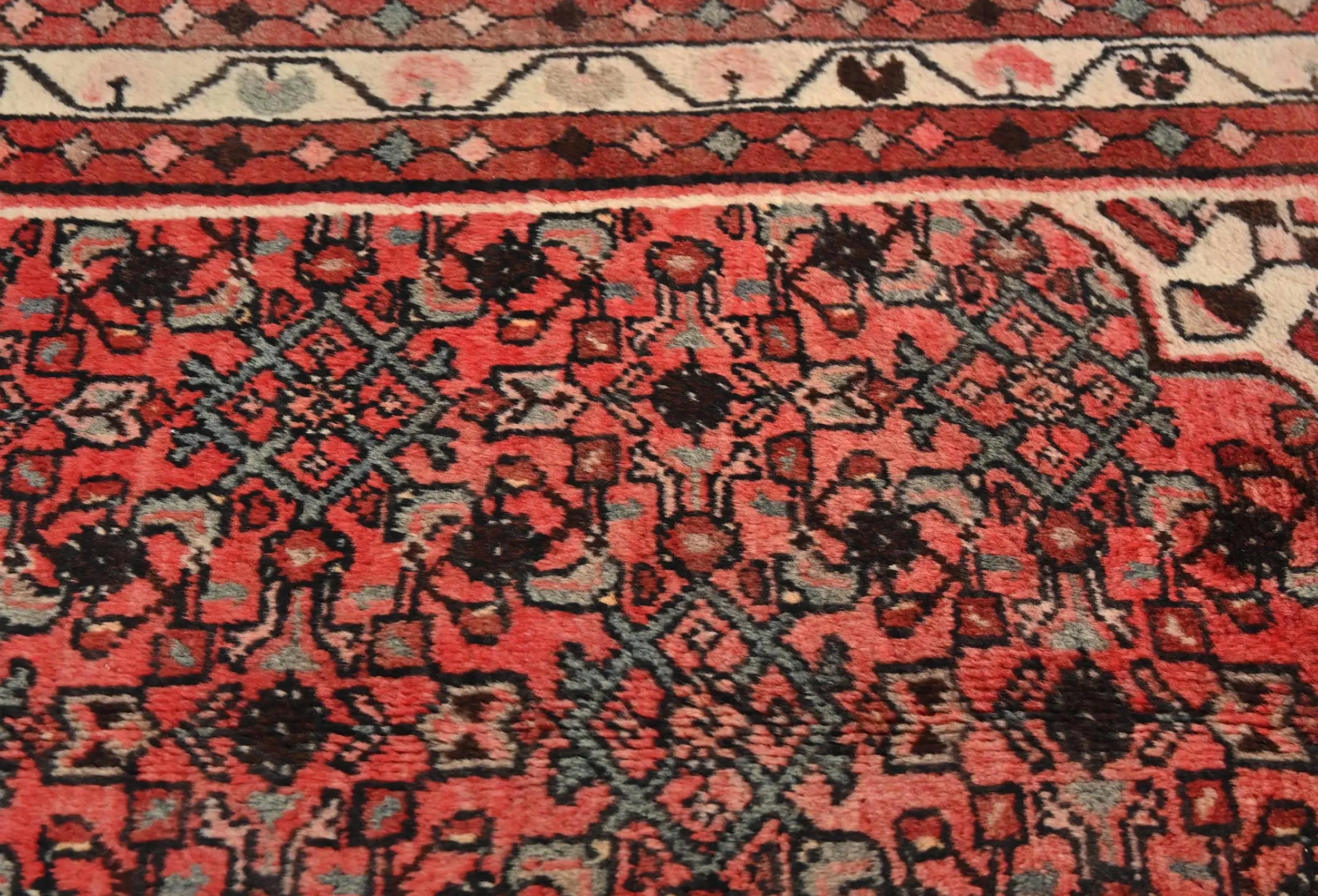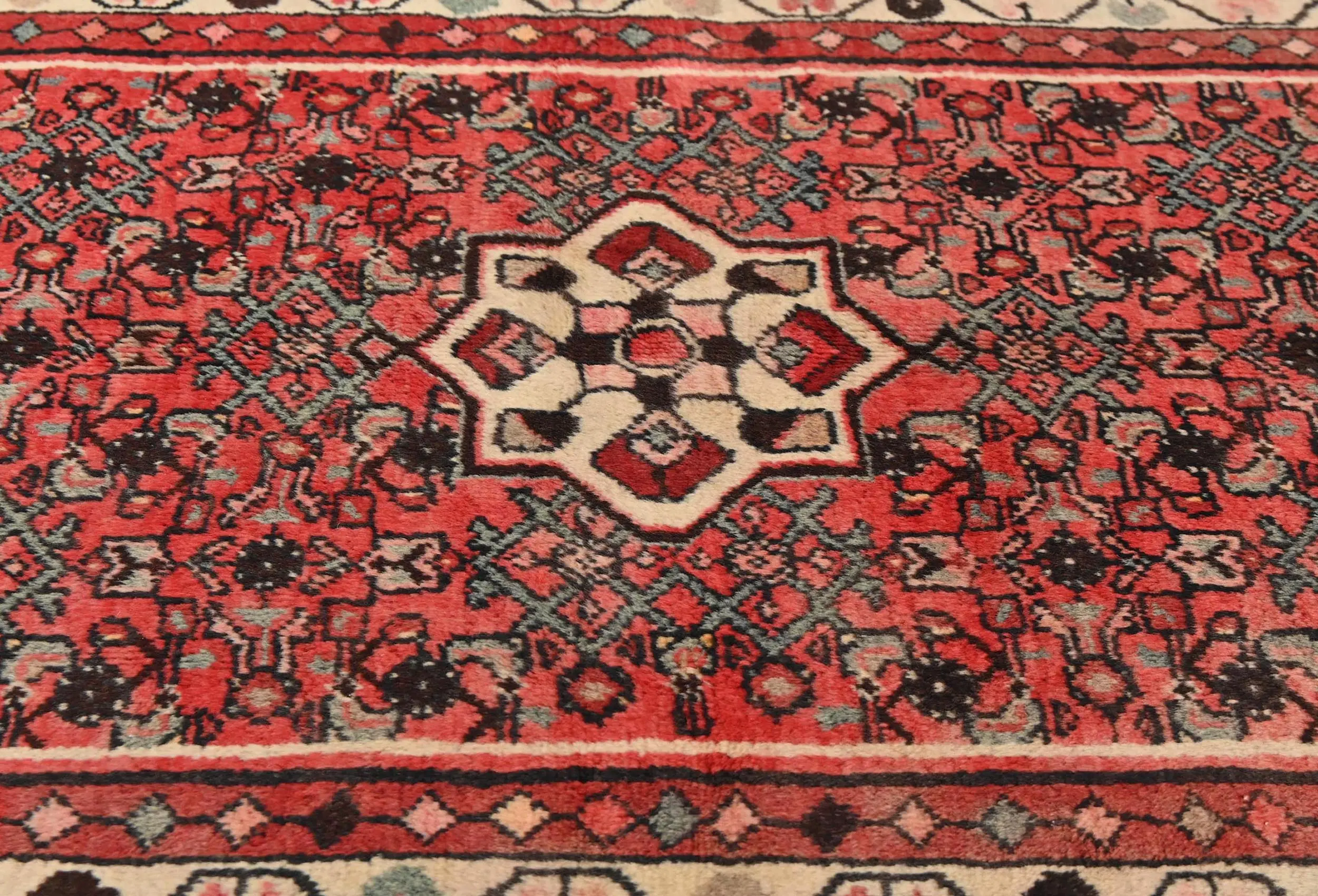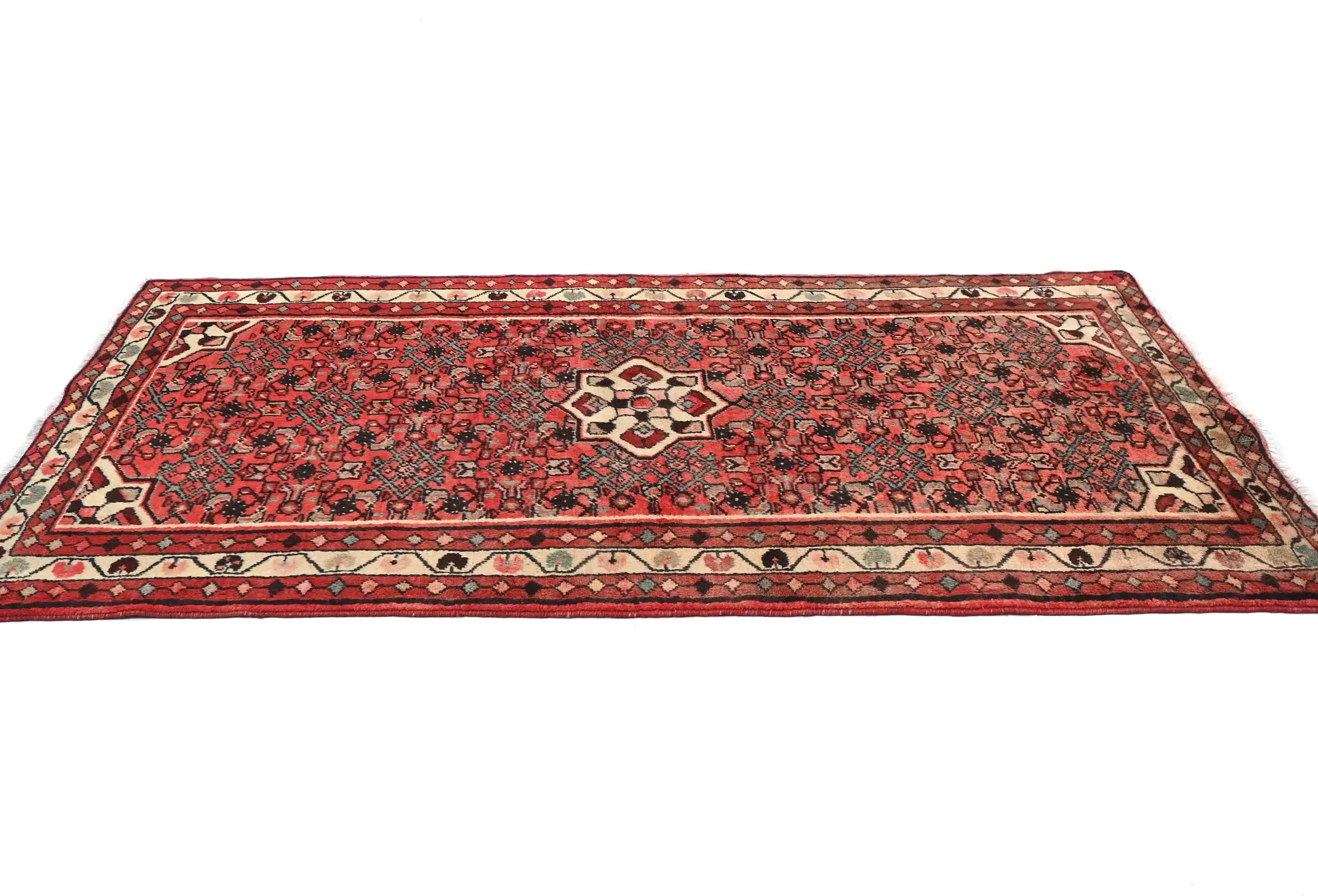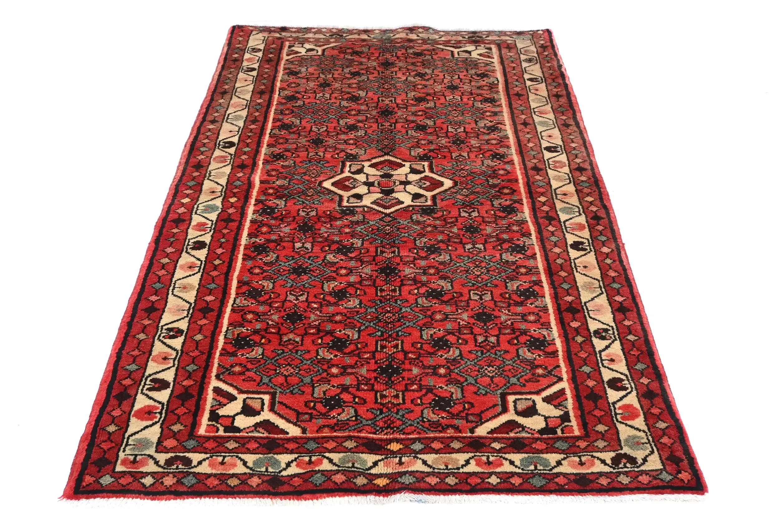 Handmade vintage 3'7 X 6'0 red Persian rug made with vegetable dyes (fine wool pile and cotton foundation), exceptional knot count, and appealing ancient designs. This Oriental rug never will go out of style and would be among your most valuable treasures.