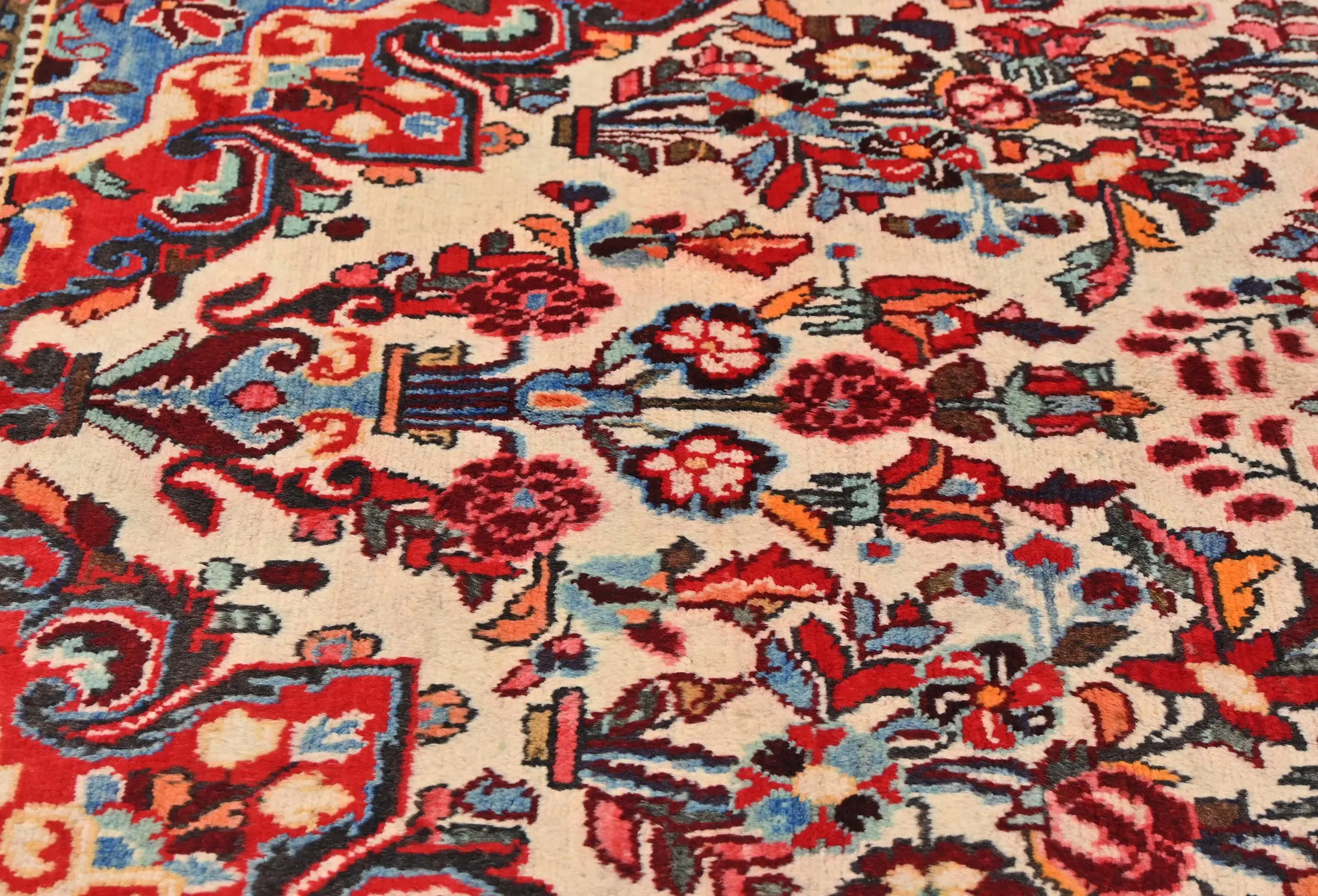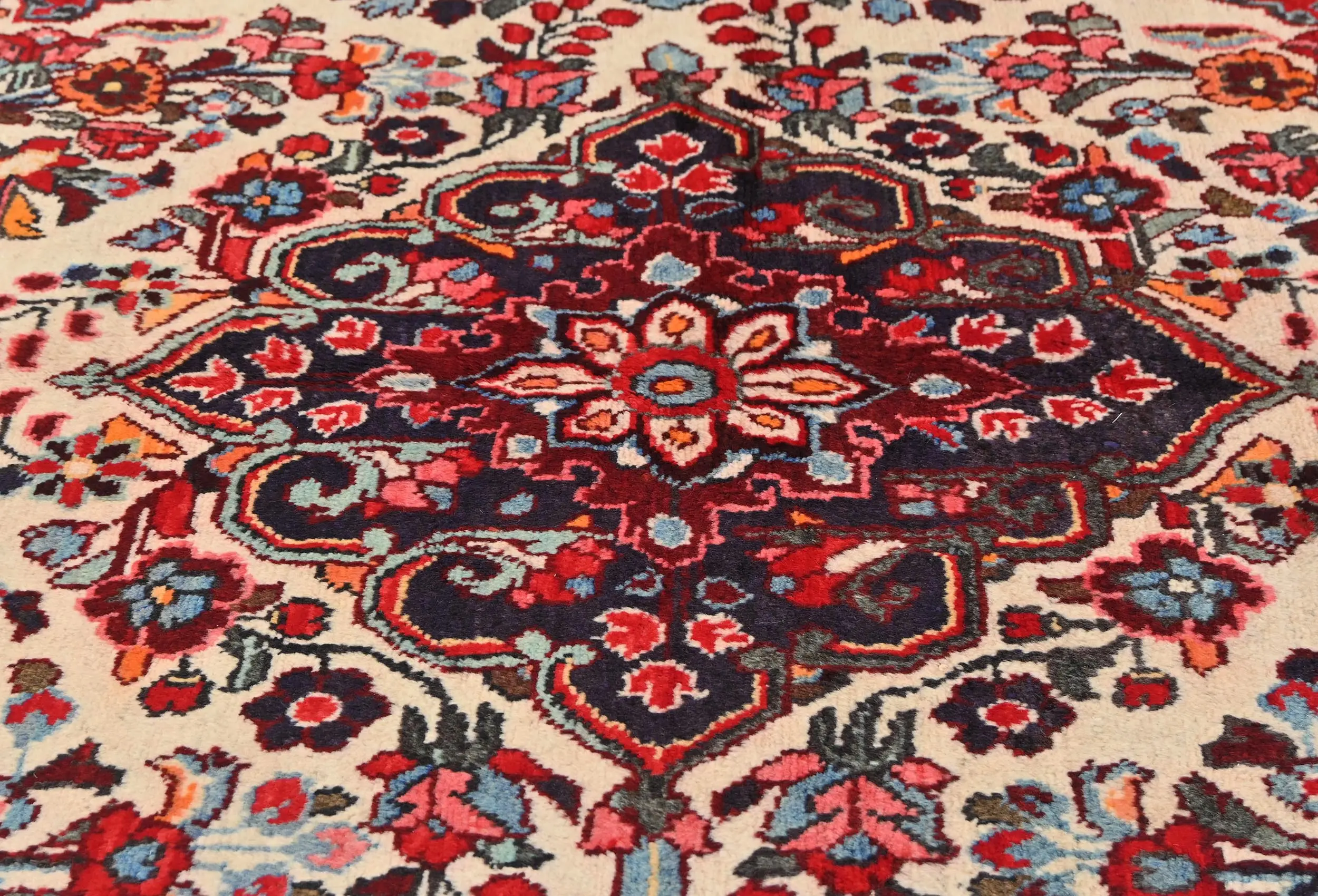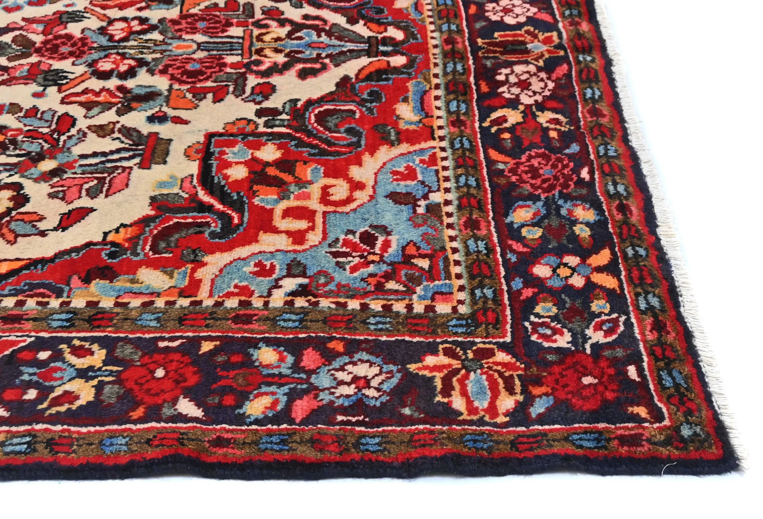Handmade vintage 5X9 cream Persian rug made with vegetable dyes (fine wool pile and cotton foundation), exceptional knot count, and appealing ancient designs. This Oriental rug never will go out of style and would be among your most valuable treasures.
