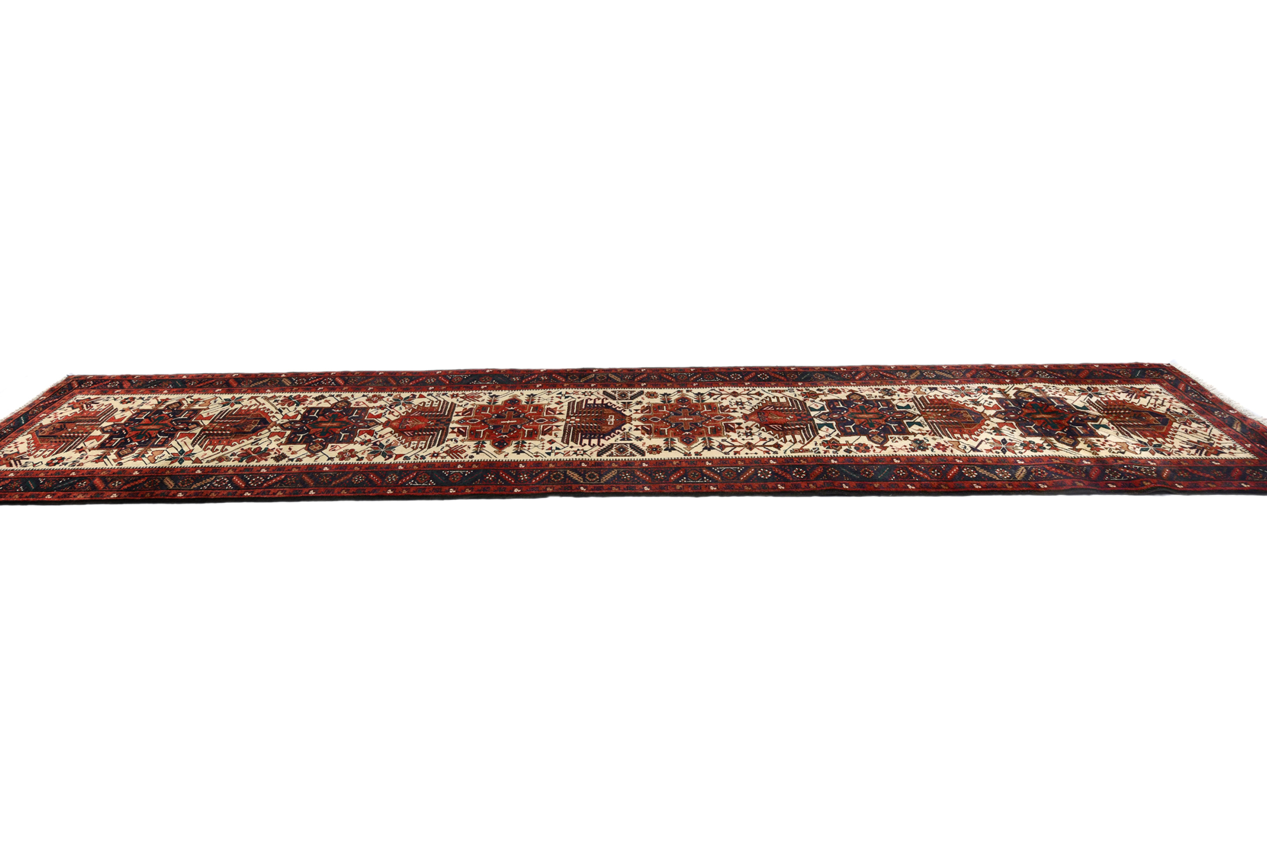 Handmade vintage 3X15 cream Persian runner made with vegetable dyes (fine wool pile and cotton foundation), superior knot count, and alluring ancient designs. This Oriental runner never will go out of style and would be among your most valuable treasures.
