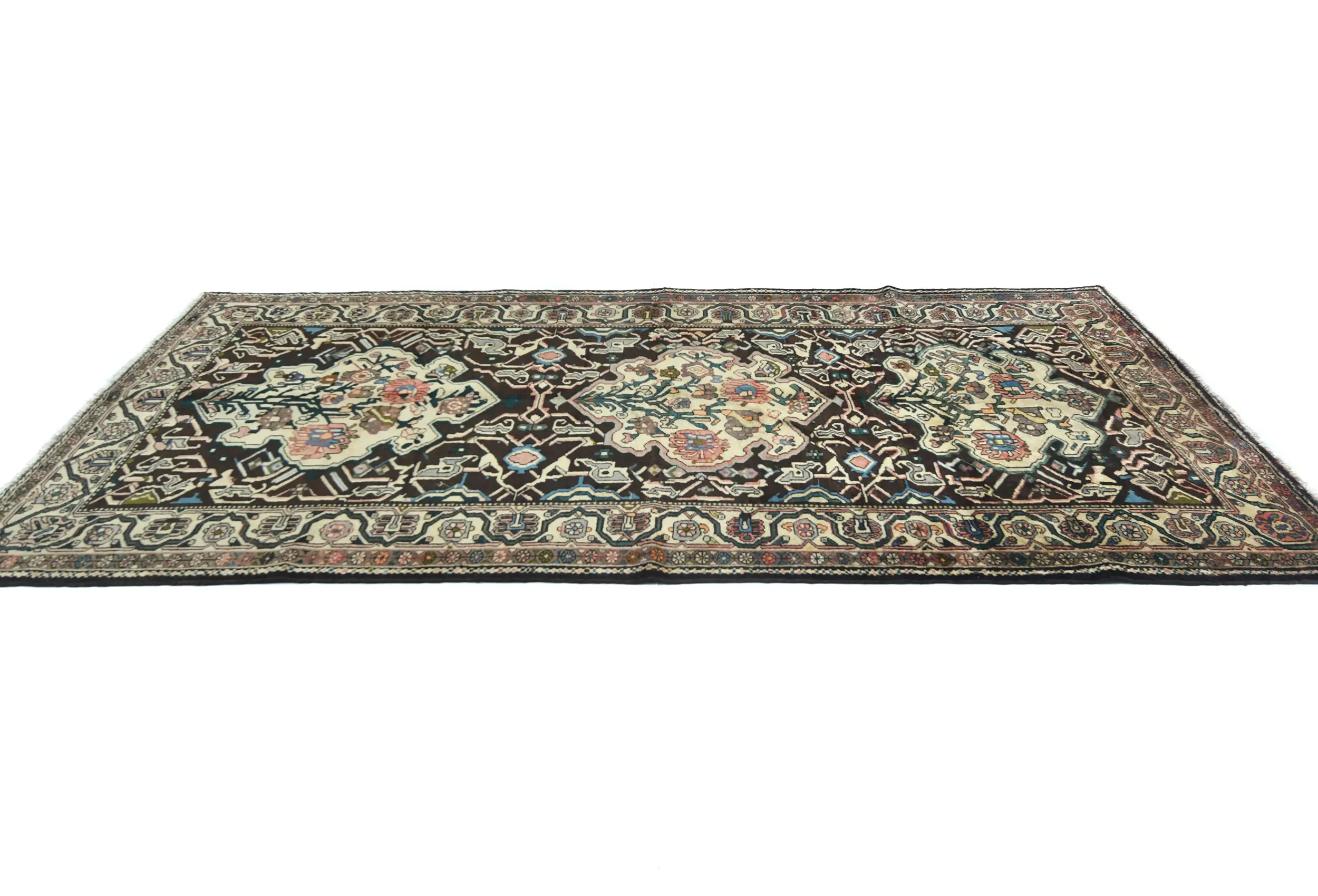 This original 5'5X10'2 dark brown vintage Persian runner was well-constructed by the hands of master weavers motivated by a variety of stunning artistic designs, to recreate the aged look of the exceptional piece with a richness of color and developed decorative floral background field. What set this traditional Oriental area runner from the others are the material and dye used (wool pile and cotton foundation), knot count, ancient designs, fantastic grades, and its regional historical connection: it has deep roots, from the story of the people who produced it to the meaning of the symbols and colors displayed across its canvas that have been praised for centuries. This classic home décor carpet will be completely cozy and inviting that never will go out of style! Also, this Oriental runner would be among your most valuable treasures, it is a great investment that increase in value over time, and it will last a lifetime because was woven with high-quality, all-natural wool; it won’t rip, tear, or shed. Eco-friendly, opulent yet affordable; this Persian rug will give you an extra pop of character to help define your home environment with elegance and warmth that will capture the eyes and attention of your audience (homeowners, designers, decorators, family and friends).