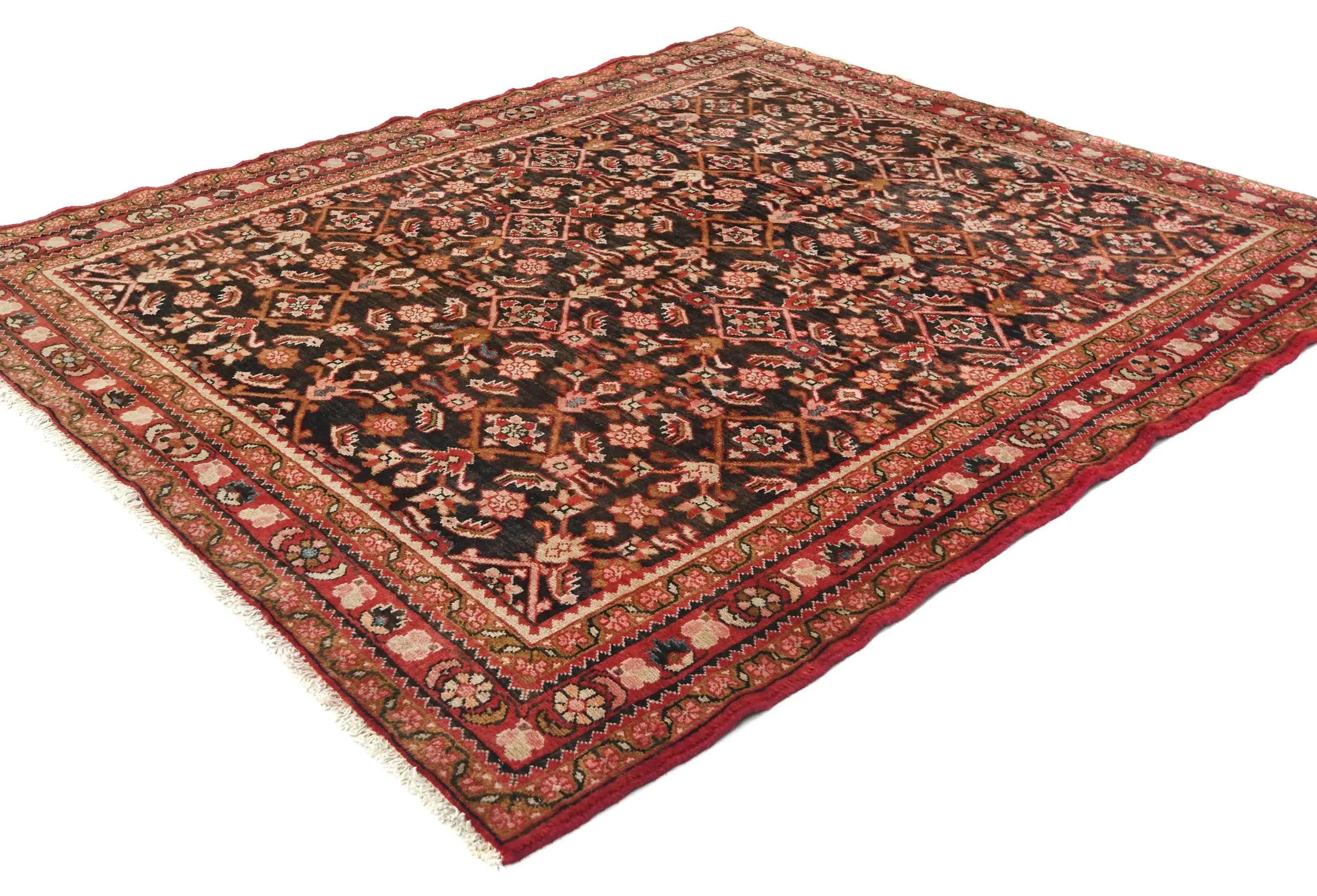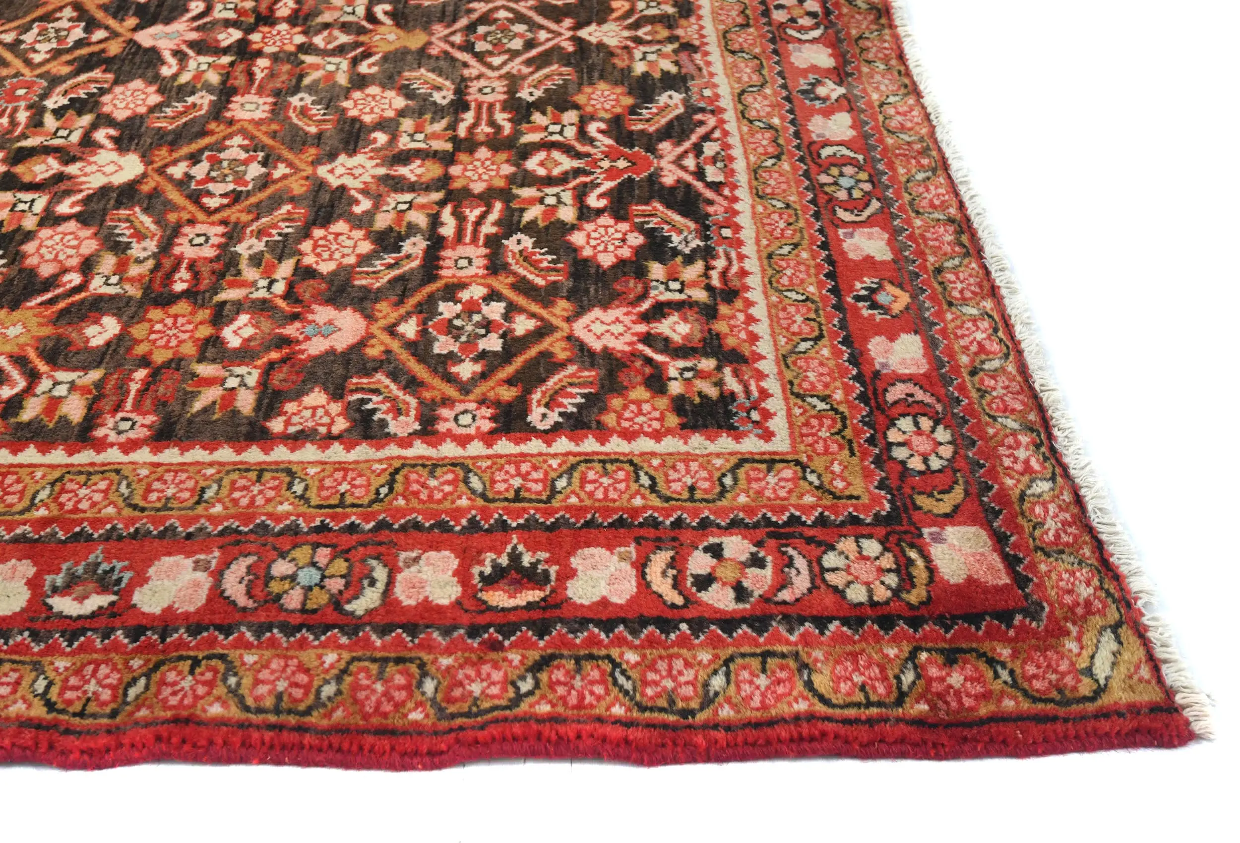 This original 5'8X6'8 Dark Brown vintage Persian rug was crafted by the hands of skilled weavers enthused by a variety of lovely artistic designs, to recreate the aged look of the unique piece with a richness of color and beautifully elaborated background field. What set this tribal Oriental area rug from the others are the material and dye used (wool pile and cotton foundation), knot count, ancient designs, fantastic grades, and its regional historical connection: it has deep roots, from the story of the people who produced it to the meaning of the symbols and colors displayed across its canvas that have been praised for centuries. This home décor carpet will be completely cozy and inviting that never will go out of style! Also, this Oriental rug would be among your most valuable treasures, it is a great investment that increase in value over time, and it will last for generations because was woven with high-quality, all-natural wool; it won’t rip, tear, or shed. Environmentally friendly, opulent yet affordable; this Persian rug will give you a thorough amount of character to help define your living space with sophistication and warmth that will capture the eyes and attention of your audience (homeowners, designers, decorators, family and friends). EB-7401