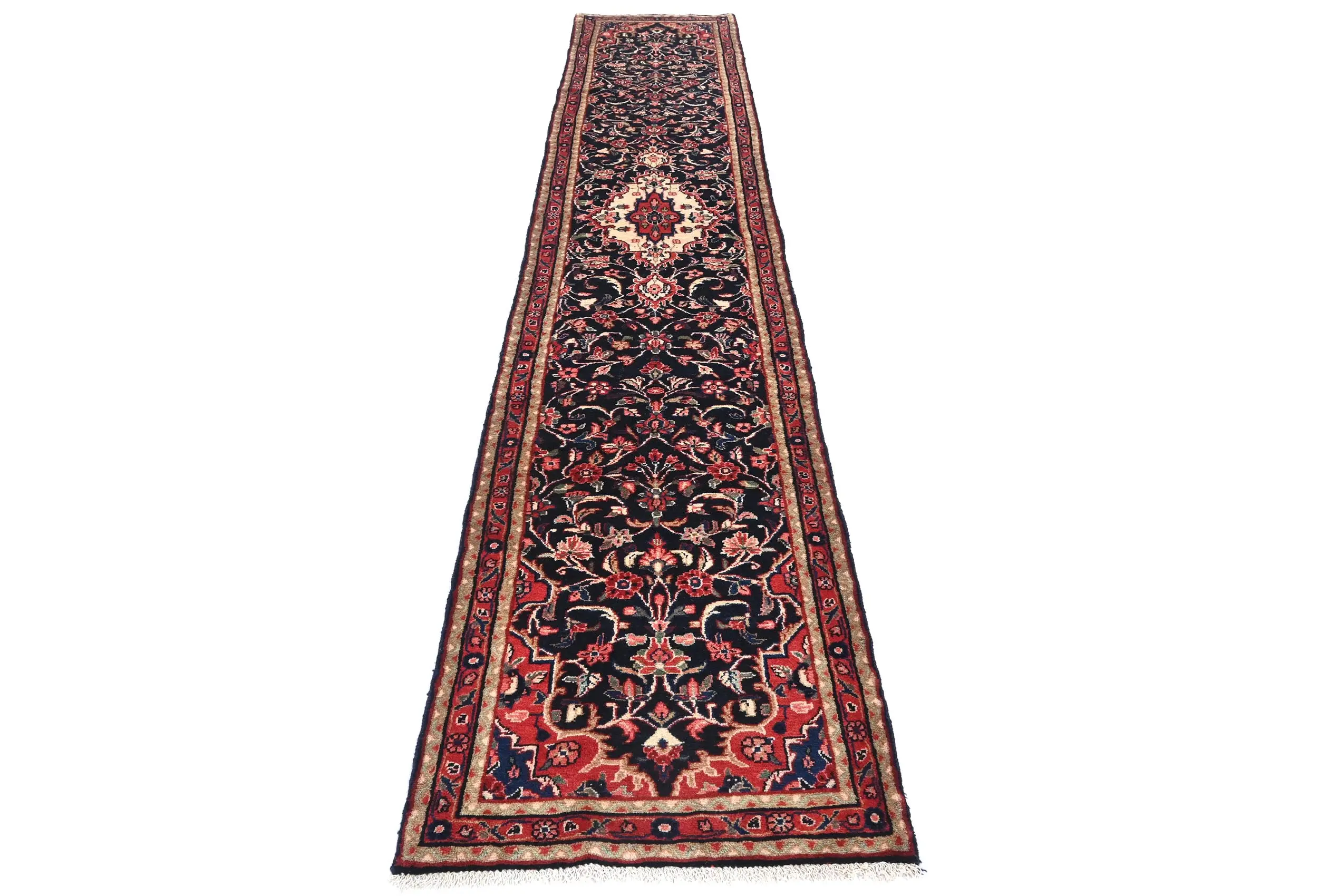 Handmade vintage 3X13 dark purple-navy Persian runner made with vegetable dyes (fine wool pile and cotton foundation), exceptional knot count, and appealing ancient designs. This Oriental runner never will go out of style and would be among your most valuable treasures.