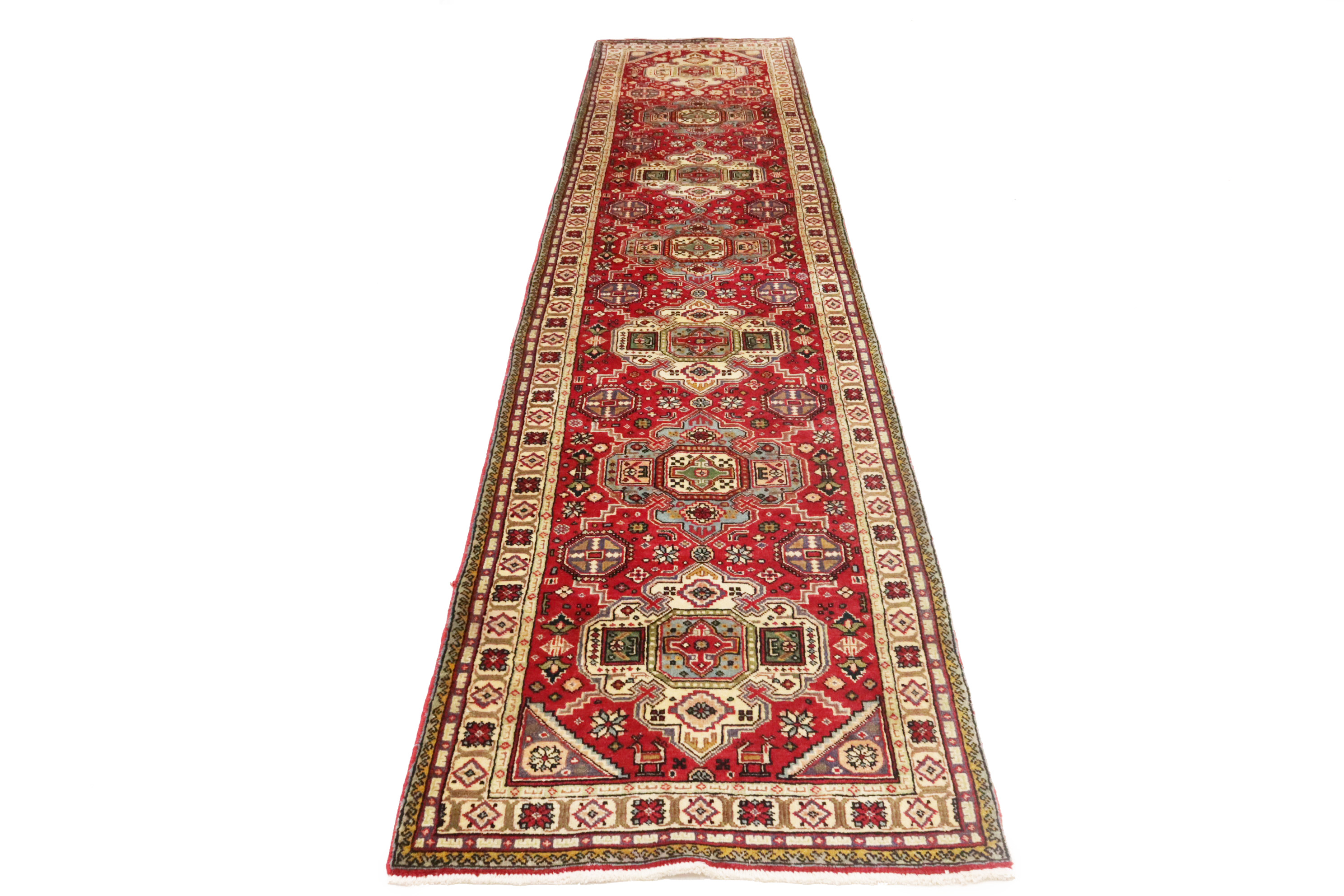 Hand Knotted vintage 3X12 red Persian runner made with vegetable dyes (fine wool pile and cotton foundation), exceptional knot count, and appealing ancient designs. This Oriental runner never will go out of style and would be among your most valuable treasures.