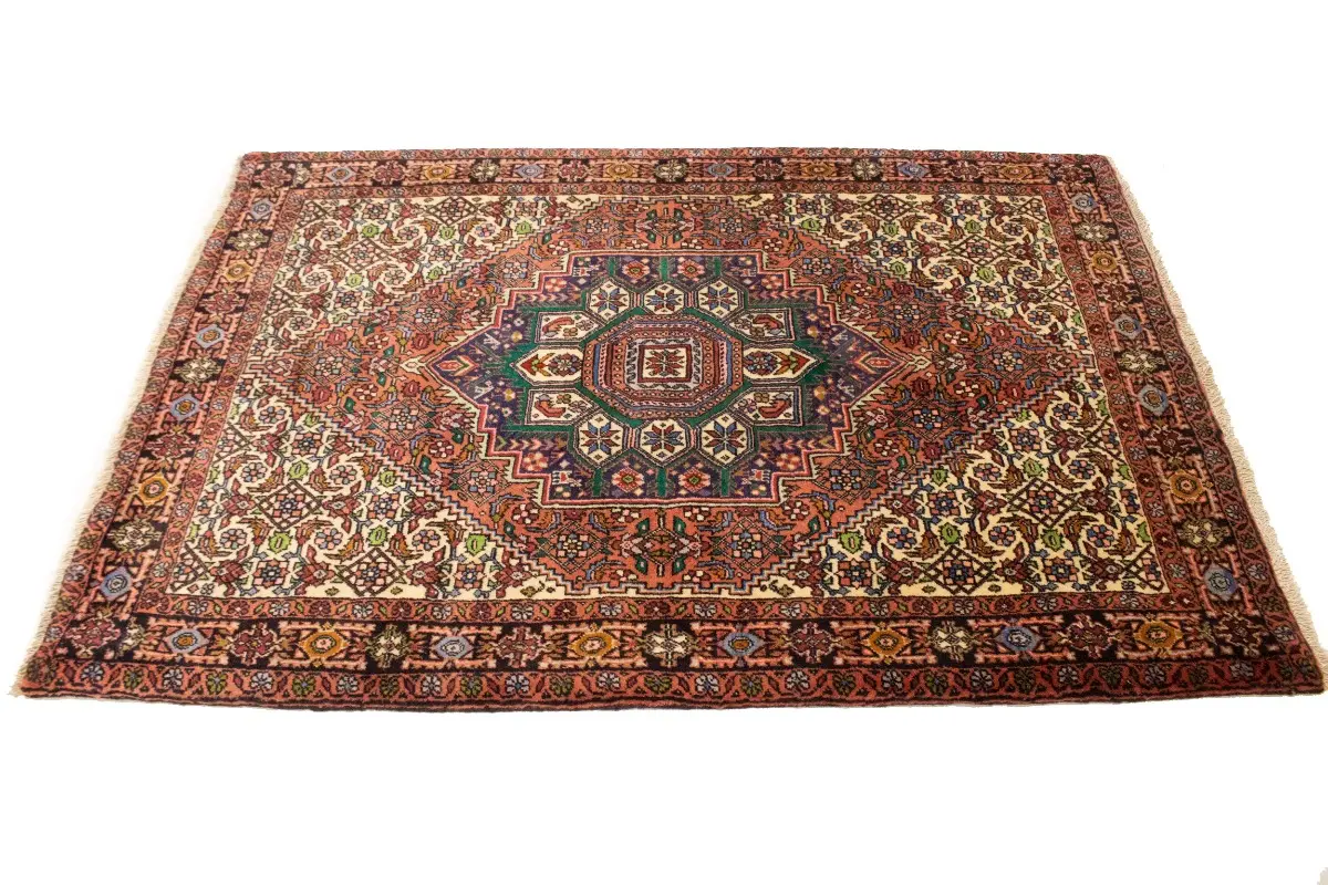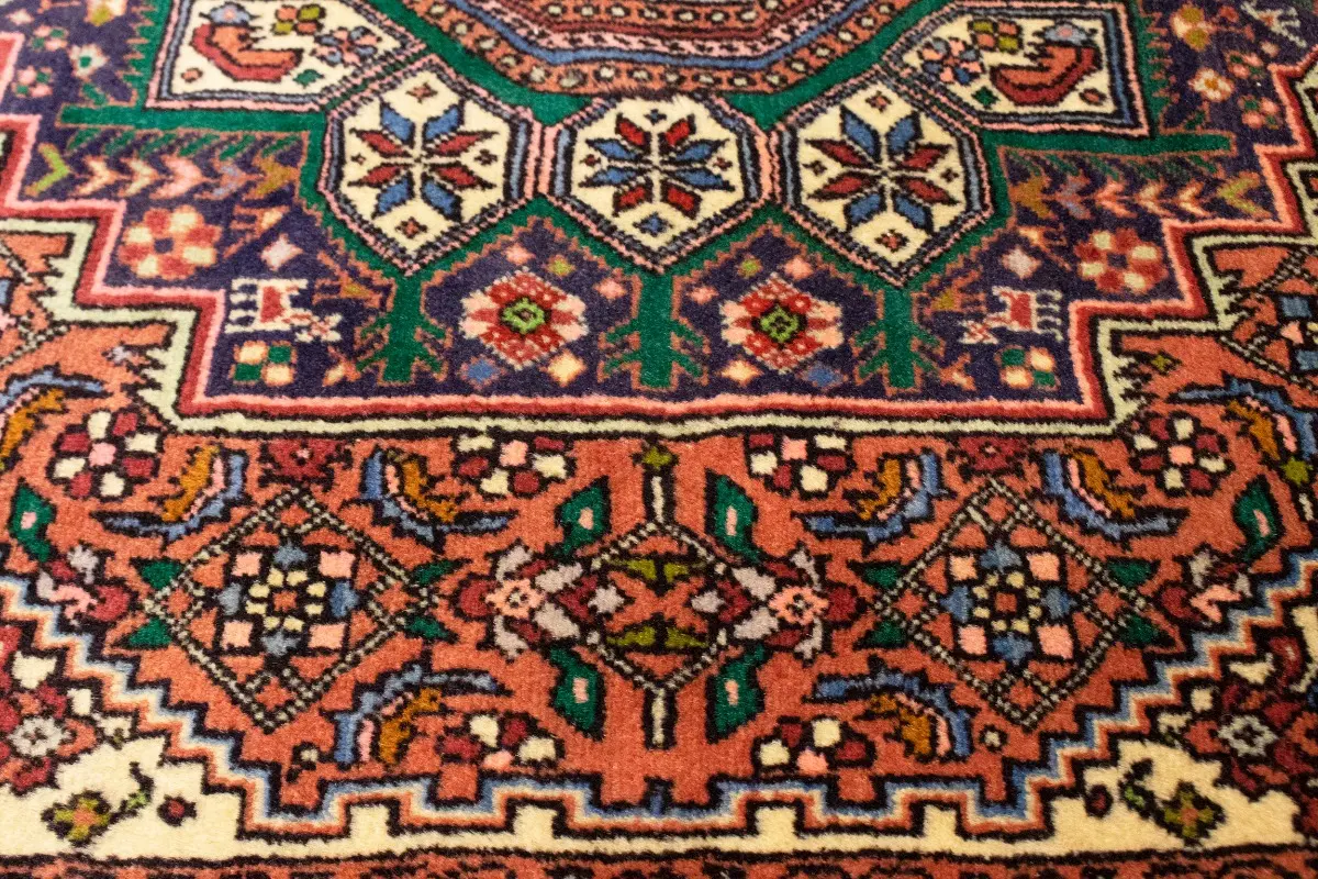 This genuine 3X4'5 orange vintage Persian rug was made by the hands of gifted weavers inspired by a variety of spectacular artistic designs, to recreate the aged look of the original piece with a richness of color and ornately patterned background field. What set this tribal Oriental area rug from the others are the material and dye used (wool pile and cotton foundation), knot count, ancient designs, fantastic grades, and its regional historical connection: it has deep roots, from the story of the people who produced it to the meaning of the symbols and colors displayed across its canvas that have been praised for centuries. This home décor carpet will be completely cozy and inviting that never will go out of style! Also, this Oriental rug would be among your most valuable treasures, it is a great investment that accrues value over time, and it will last for generations because was woven with high-quality, all-natural wool; it won’t rip, tear, or shed. Environmentally friendly, opulent yet affordable; this Persian rug will give you a thorough amount of character to help define your living space with elegance and warmth that will capture the eyes and attention of your audience (homeowners, designers, decorators, family and friends). EB-5454