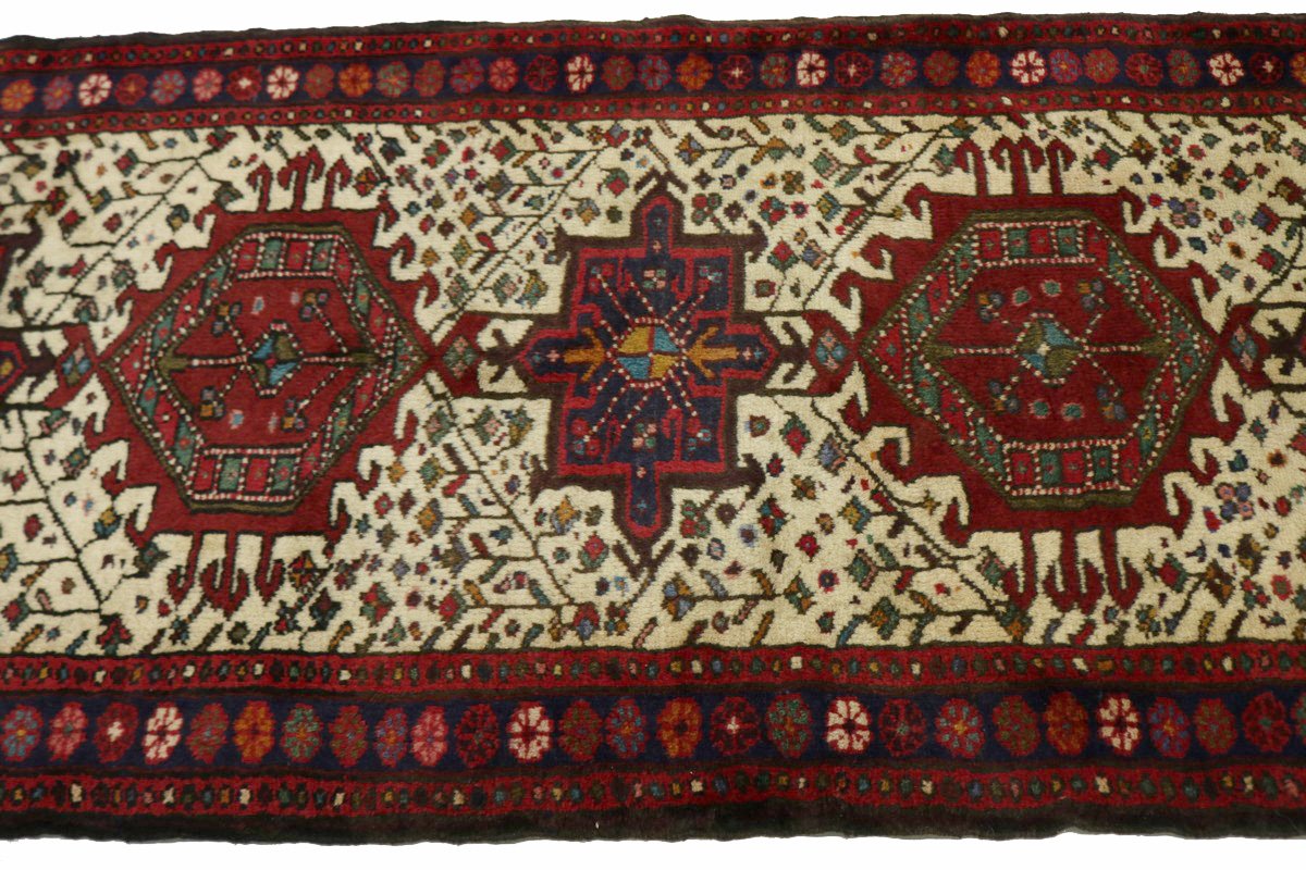Handmade vintage Persian runner made with vegetable dyes (fine wool pile and cotton foundation), superior knot count, and appealing ancient designs. This Oriental runner never will go out of style and would be among your most valuable treasures.