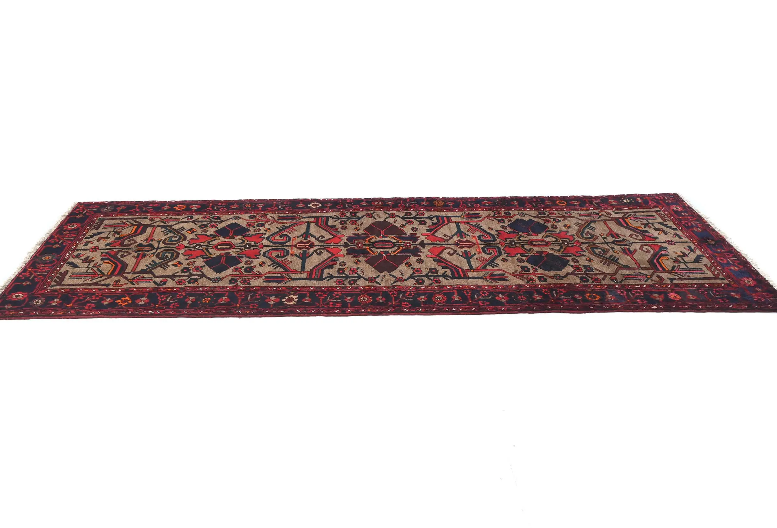 Hand Knotted 3'7X9'5 Khaki vintage Persian runner made with vegetable dyes (fine wool pile and cotton foundation), superior knot count, and appealing ancient designs. This Oriental runner never will go out of style and would be among your most valuable treasures.