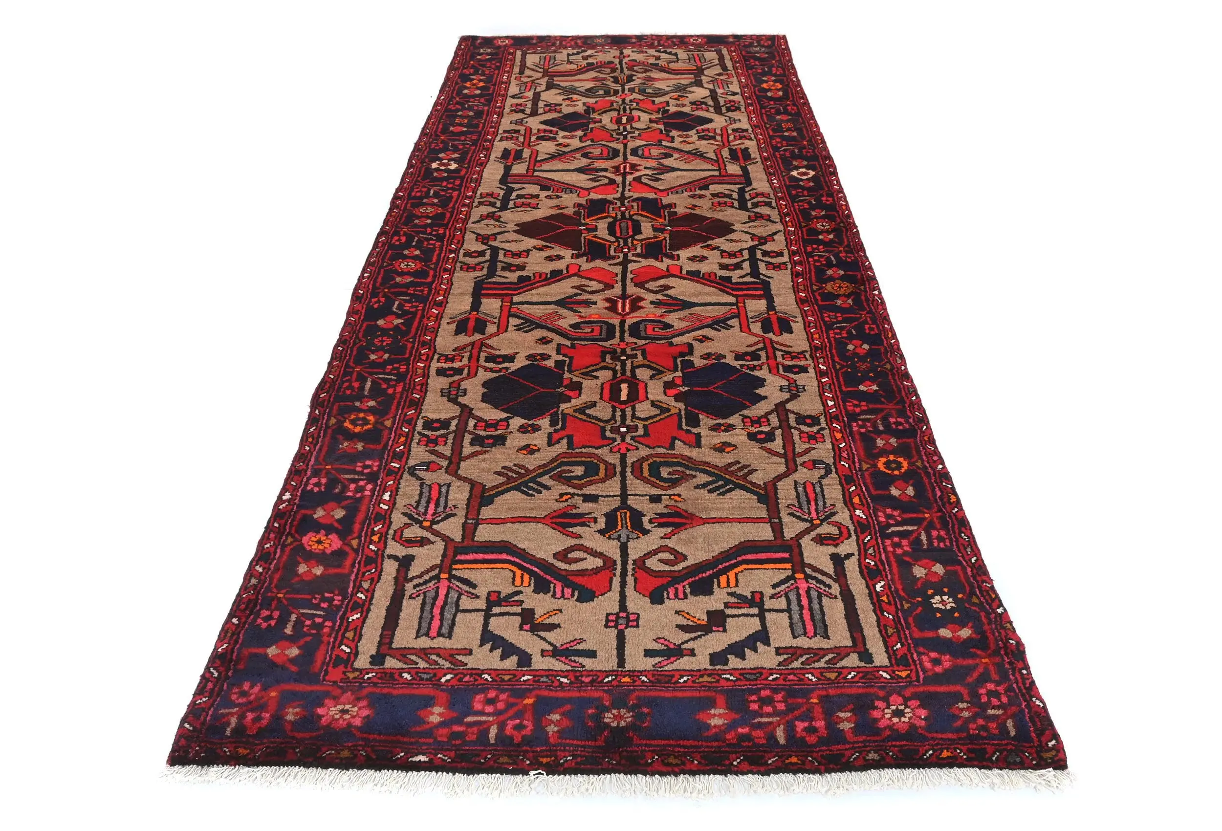 This genuine 3'7X9'5 khaki vintage Persian runner was made by the hands of gifted weavers inspired by a variety of spectacular artistic designs, to recreate the aged look of the original piece with a richness of color and ornately patterned background field. What set this tribal Oriental area runner from the others are the material and dye used (wool pile and cotton foundation), knot count, ancient designs, fantastic grades, and its regional historical connection: it has deep roots, from the story of the people who produced it to the meaning of the symbols and colors displayed across its canvas that have been praised for centuries. This home décor carpet will be completely cozy and inviting that never will go out of style! Also, this Oriental runner would be among your most valuable treasures, it is a great investment that accrues value over time, and it will last for generations because was woven with high-quality, all-natural wool; it won’t rip, tear, or shed. Environmentally friendly, opulent yet affordable; this Persian rug will give you a thorough amount of character to help define your living space with elegance and warmth that will capture the eyes and attention of your audience (homeowners, designers, decorators, family and friends). EB-7366