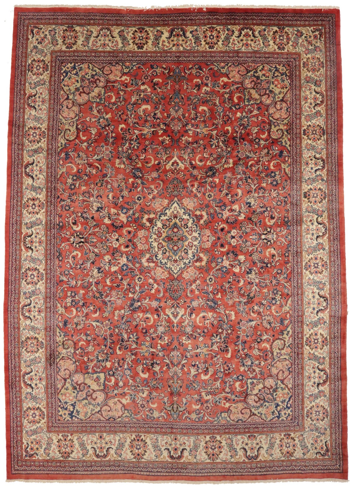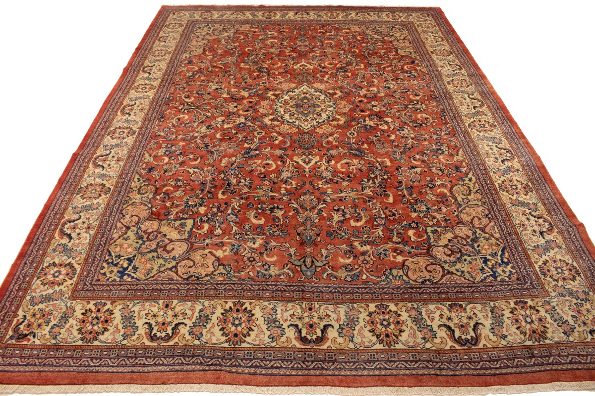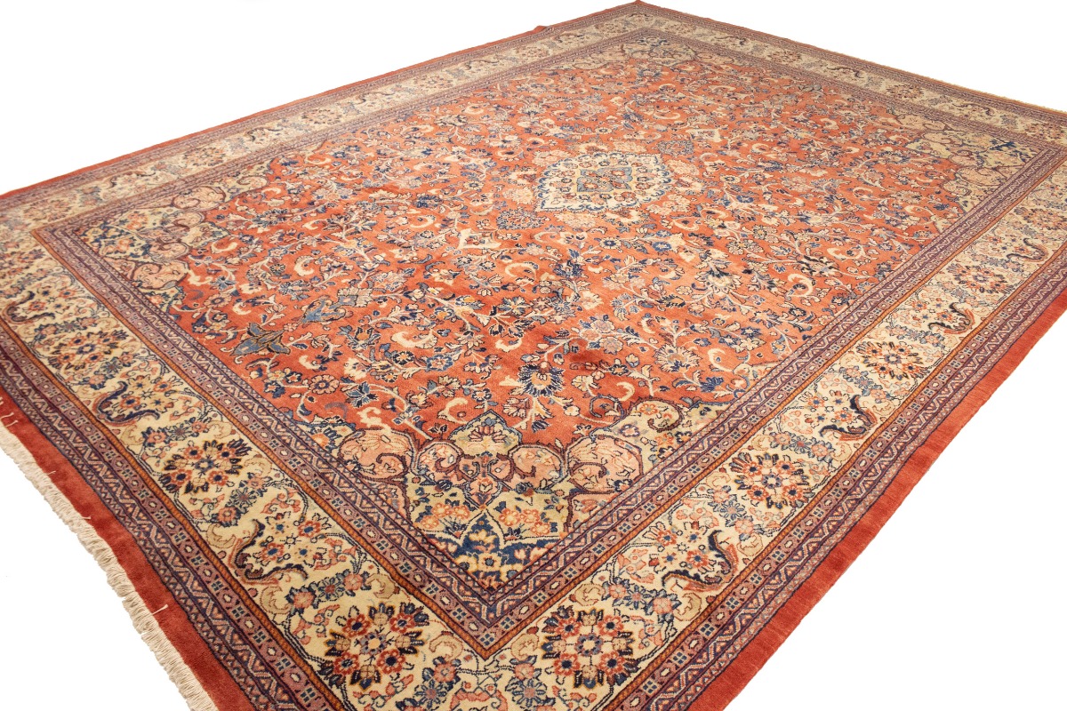 This authentic 11X15 orange-red vintage Persian rug was masterly knotted by the hands of weavers inspired by a variety of wonderful artistic designs, to recreate the aged look of the original piece with a richness of color and intricate patterned floral background field. What set this traditional Oriental area rug from the others are the material and dye used (wool pile and cotton foundation), knot count, antique designs, fantastic grades, and its regional historical connection: it has deep roots, from the story of the people who produced it to the meaning of the symbols and colors displayed across its canvas that have been praised for centuries. This classic home décor carpet will be completely cozy and inviting that never will go out of style! Also, this Oriental rug would be among your most valuable treasures, it is a great investment that accrues value over time, and it will last for generations because was woven with high-quality, all-natural wool; it won’t rip, tear, or shed. Environmentally friendly, opulent yet affordable; this Persian rug will give you a thorough amount of character to help define your living space with luxury and warmth that will capture the eyes and attention of your audience (homeowners, designers, decorators, family and friends). EB-5758