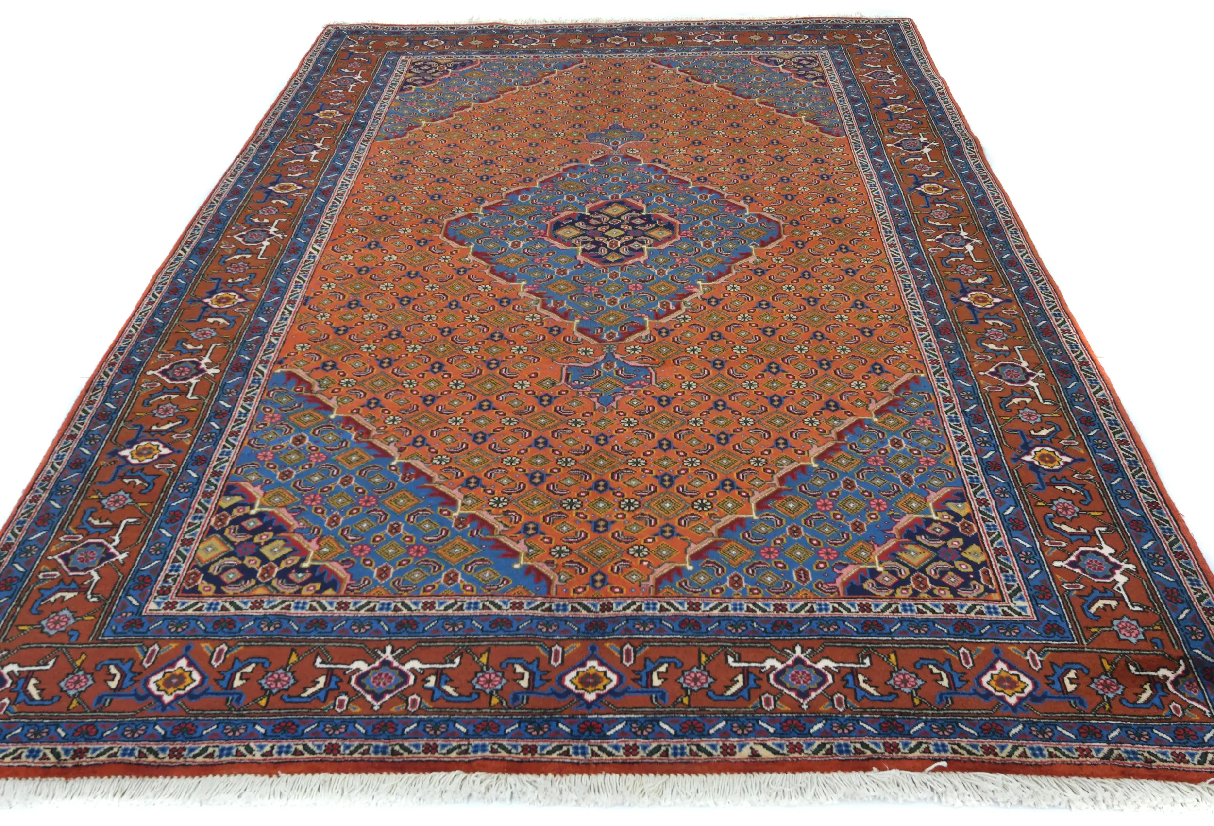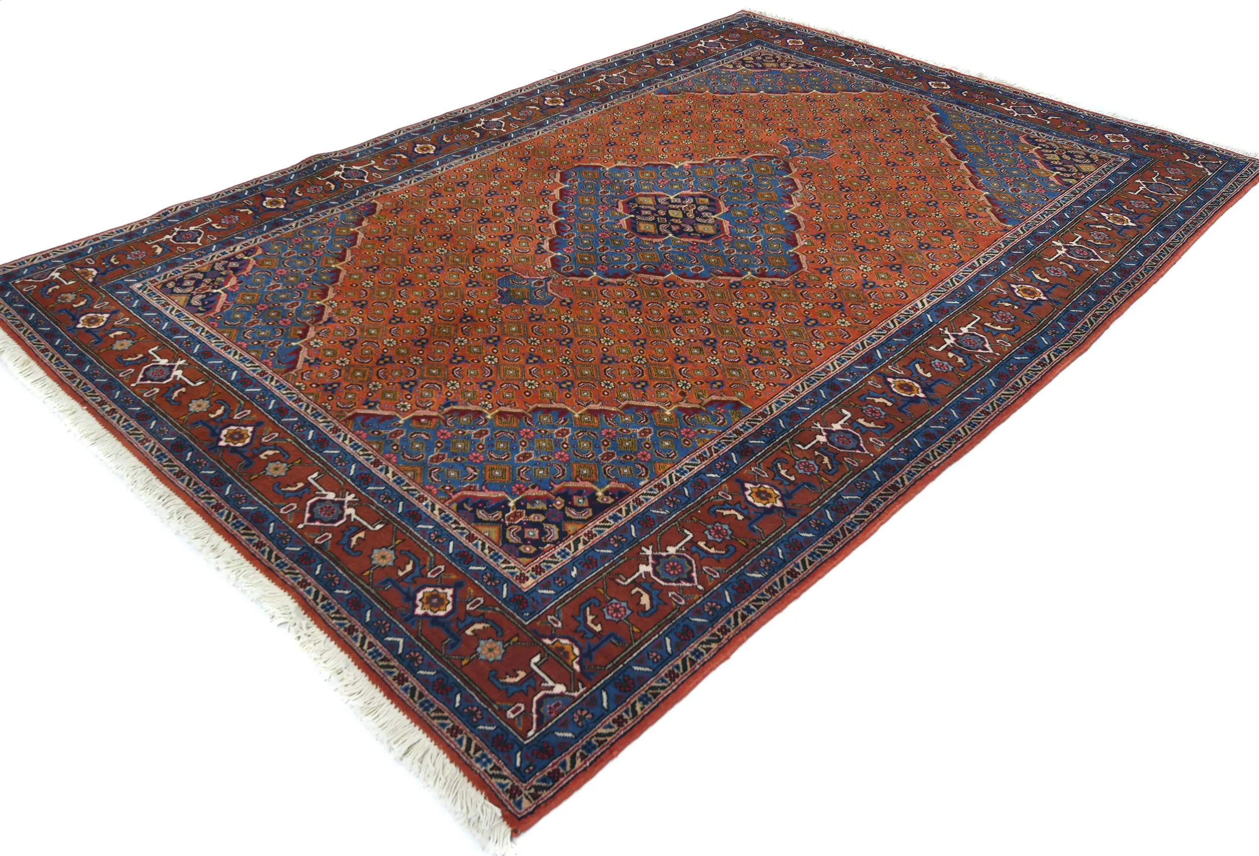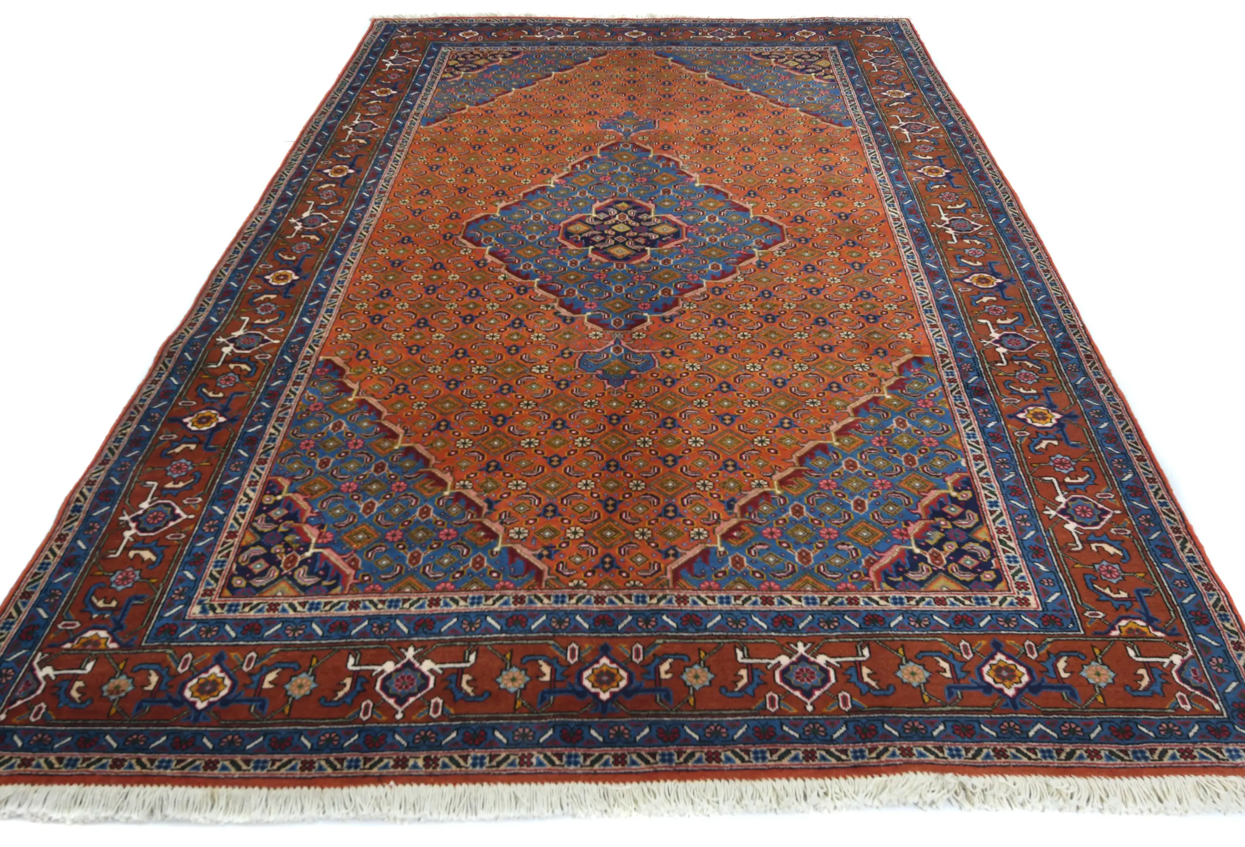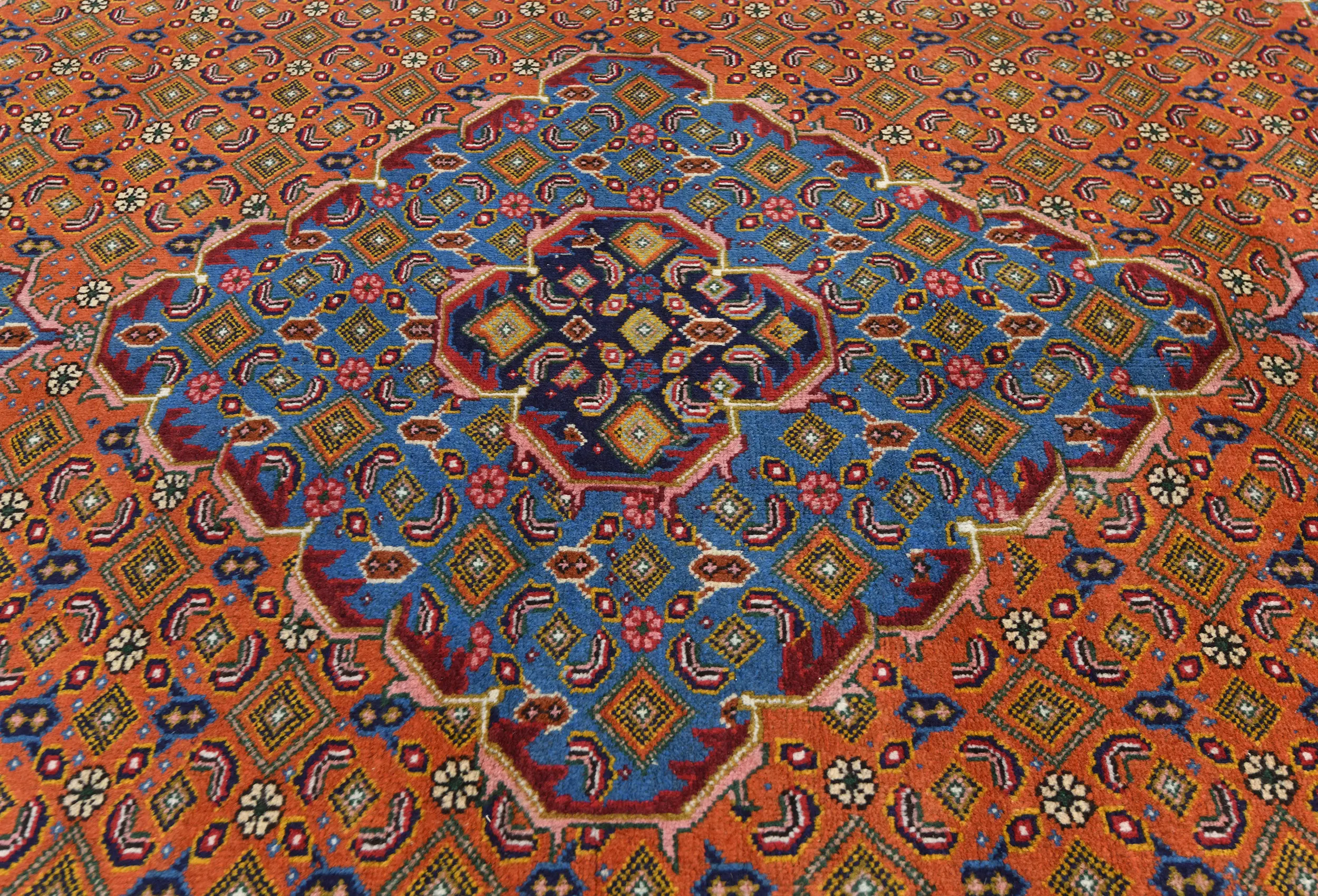 This original 6'7X9'4 orange vintage Persian rug was well-constructed by the hands of master weavers motivated by a variety of stunning artistic designs, to recreate the aged look of the exceptional piece with a richness of color and developed decorative floral background field. What set this traditional Oriental area rug from the others are the material and dye used (wool pile and cotton foundation), knot count, ancient designs, fantastic grades, and its regional historical connection: it has deep roots, from the story of the people who produced it to the meaning of the symbols and colors displayed across its canvas that have been praised for centuries. This classic home décor carpet will be completely cozy and inviting that never will go out of style! Also, this Oriental rug would be among your most valuable treasures, it is a great investment that increase in value over time, and it will last a lifetime because was woven with high-quality, all-natural wool; it won’t rip, tear, or shed. Eco-friendly, opulent yet affordable; this Persian rug will give you an extra pop of character to help define your home environment with elegance and warmth that will capture the eyes and attention of your audience (homeowners, designers, decorators, family and friends). EB-7863