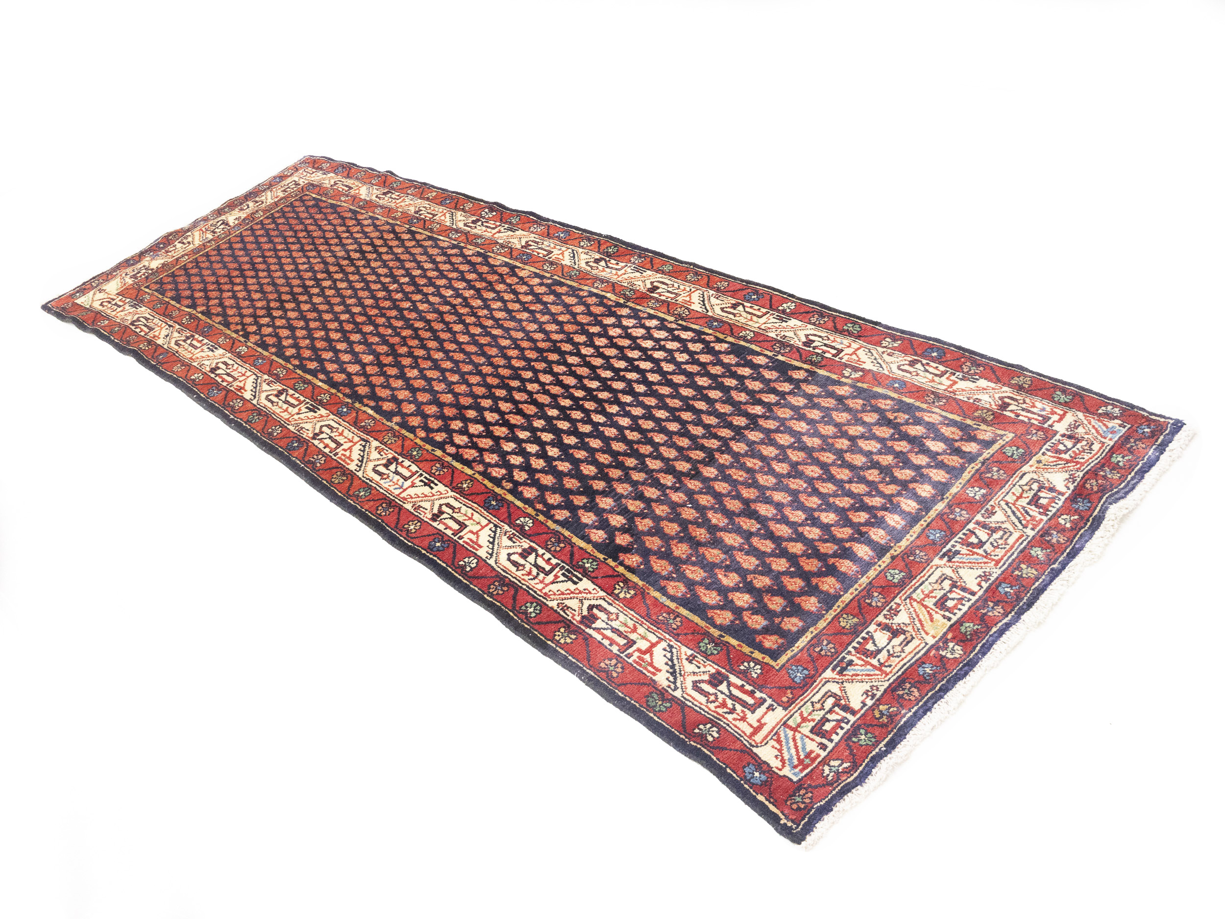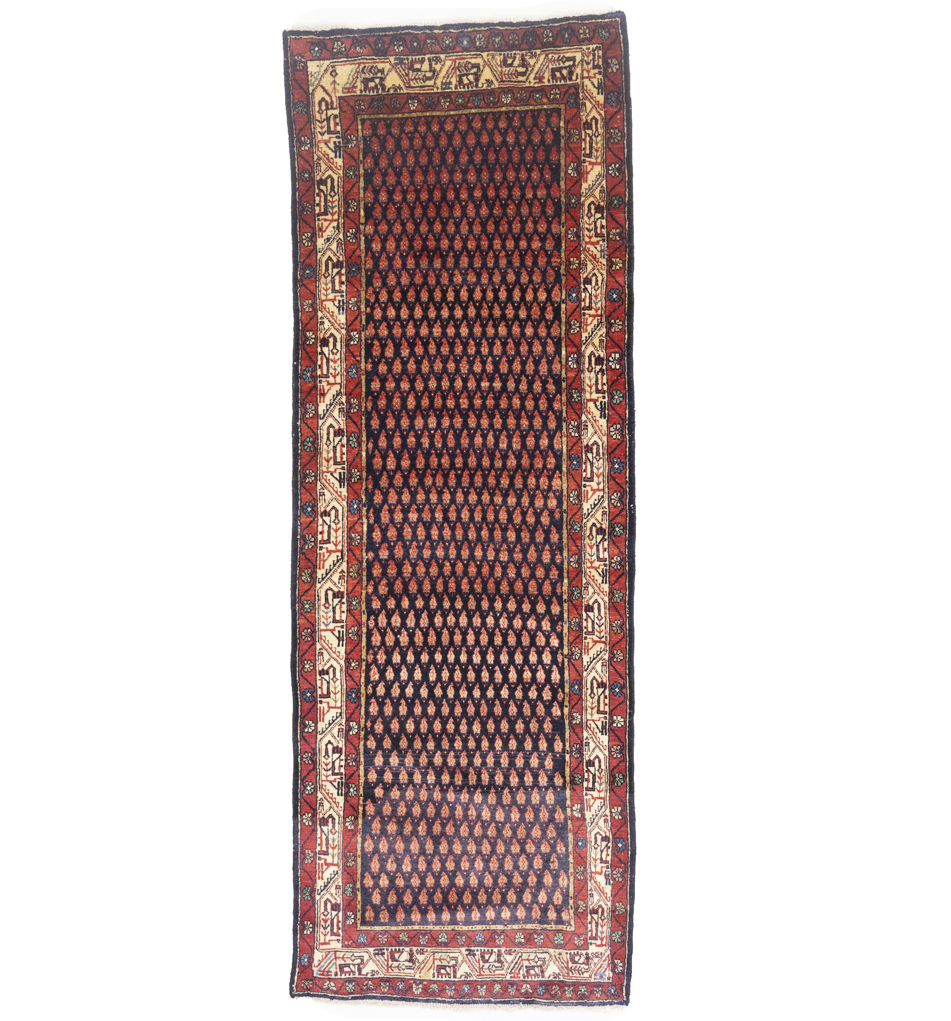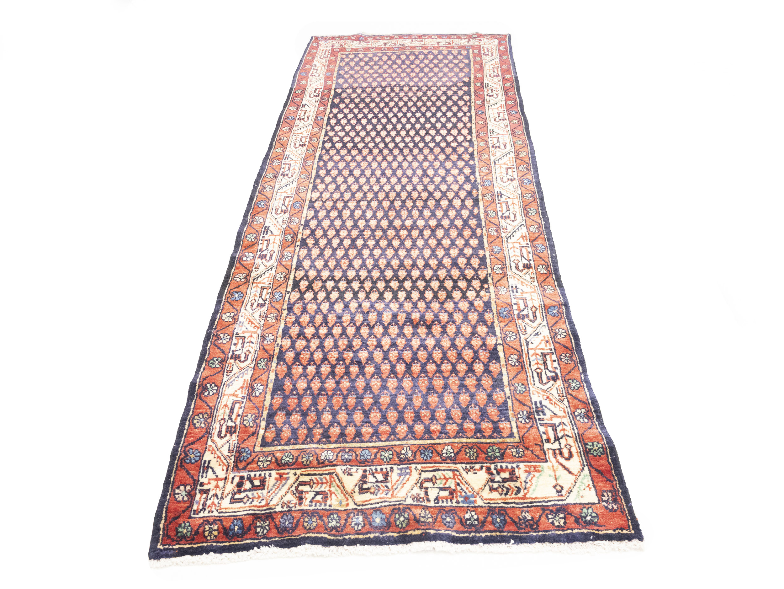 Hand Knotted vintage 3'6X10 Purple-navy Persian runner made with vegetable dyes (fine wool pile and cotton foundation), exceptional knot count, and appealing ancient designs. This Oriental runner never will go out of style and would be among your most valuable treasures.