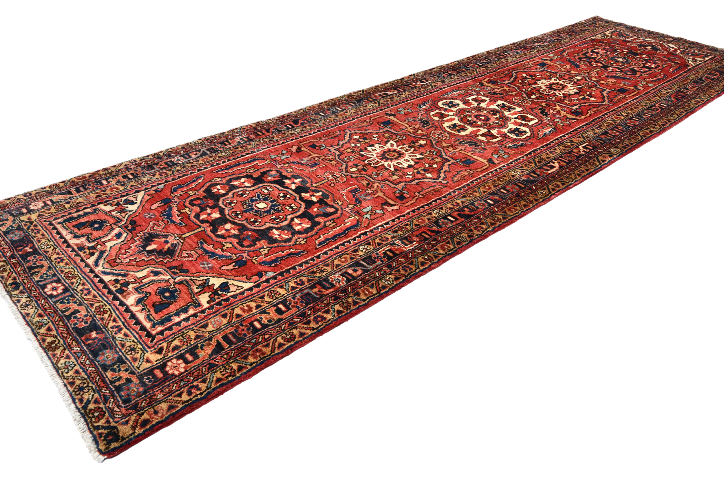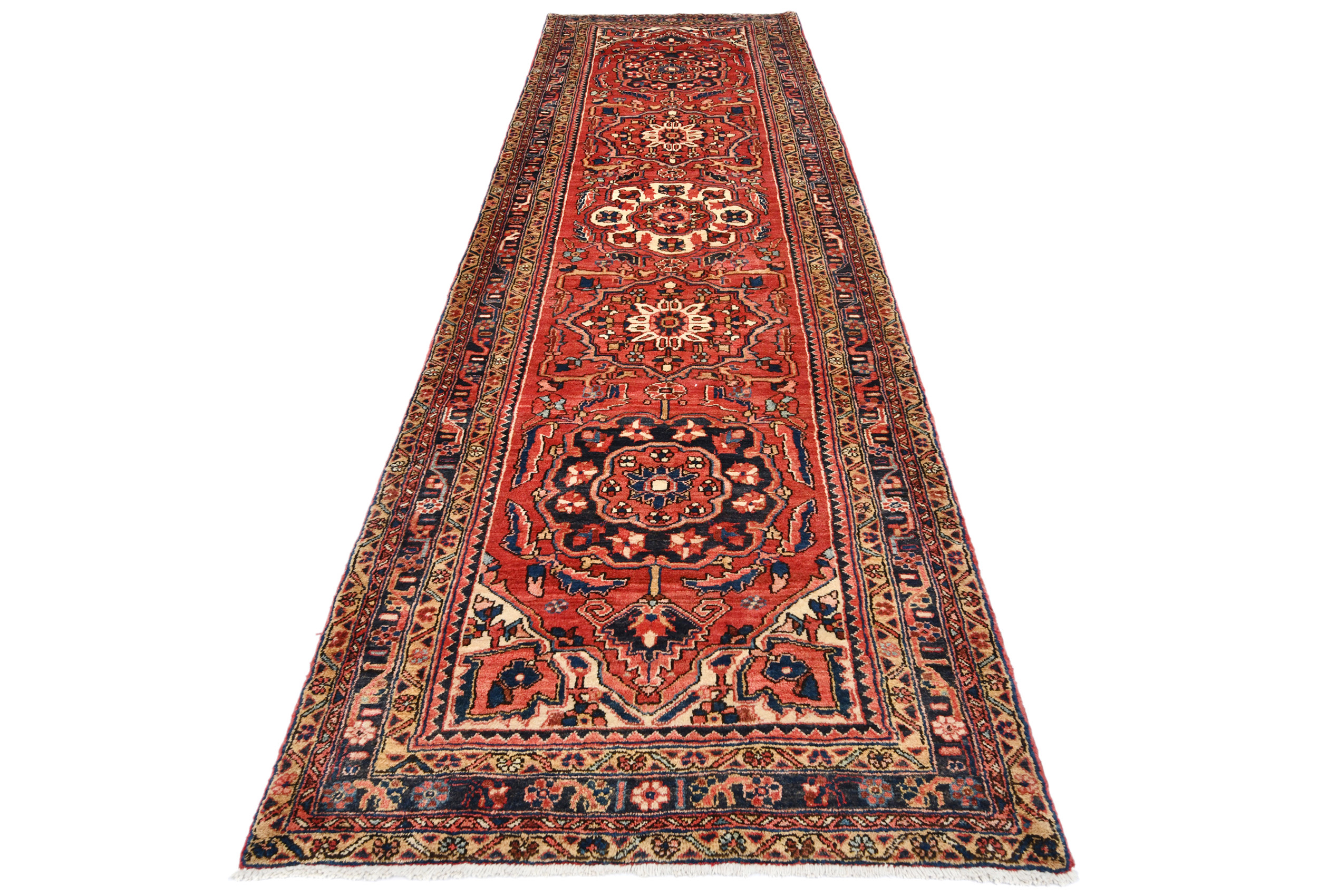 Handmade vintage 3'6X11'9 red Persian runner made with vegetable dyes (fine wool pile and cotton foundation), superior knot count, and alluring ancient designs. This Oriental runner never will go out of style and would be among your most valuable treasures.