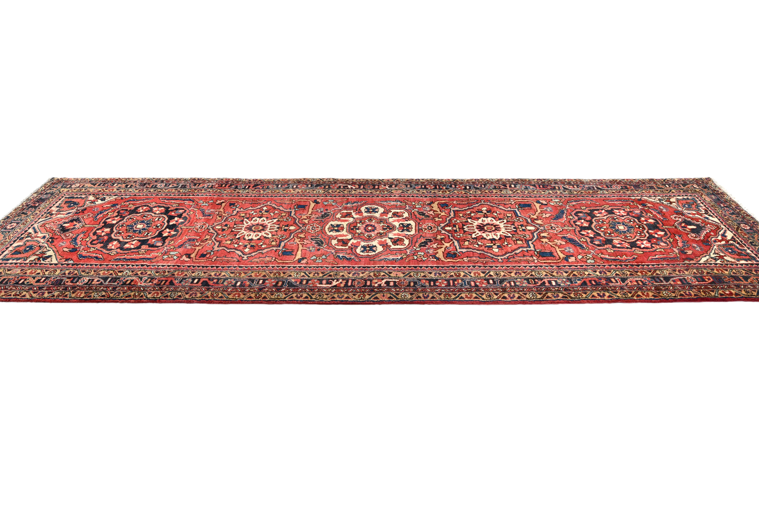 Vintage Red Floral 3'6X11'9 Heriz Persian Runner Rug