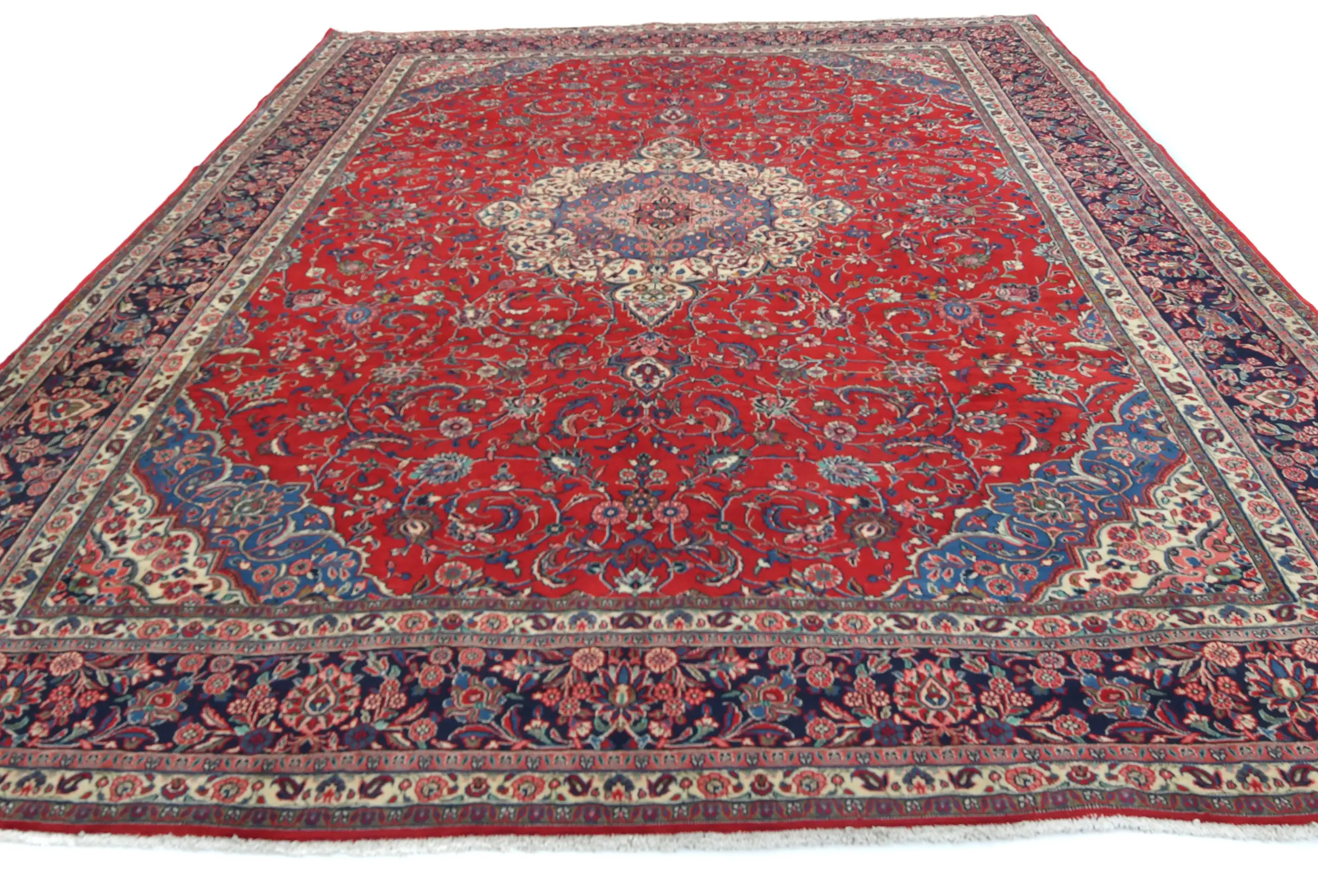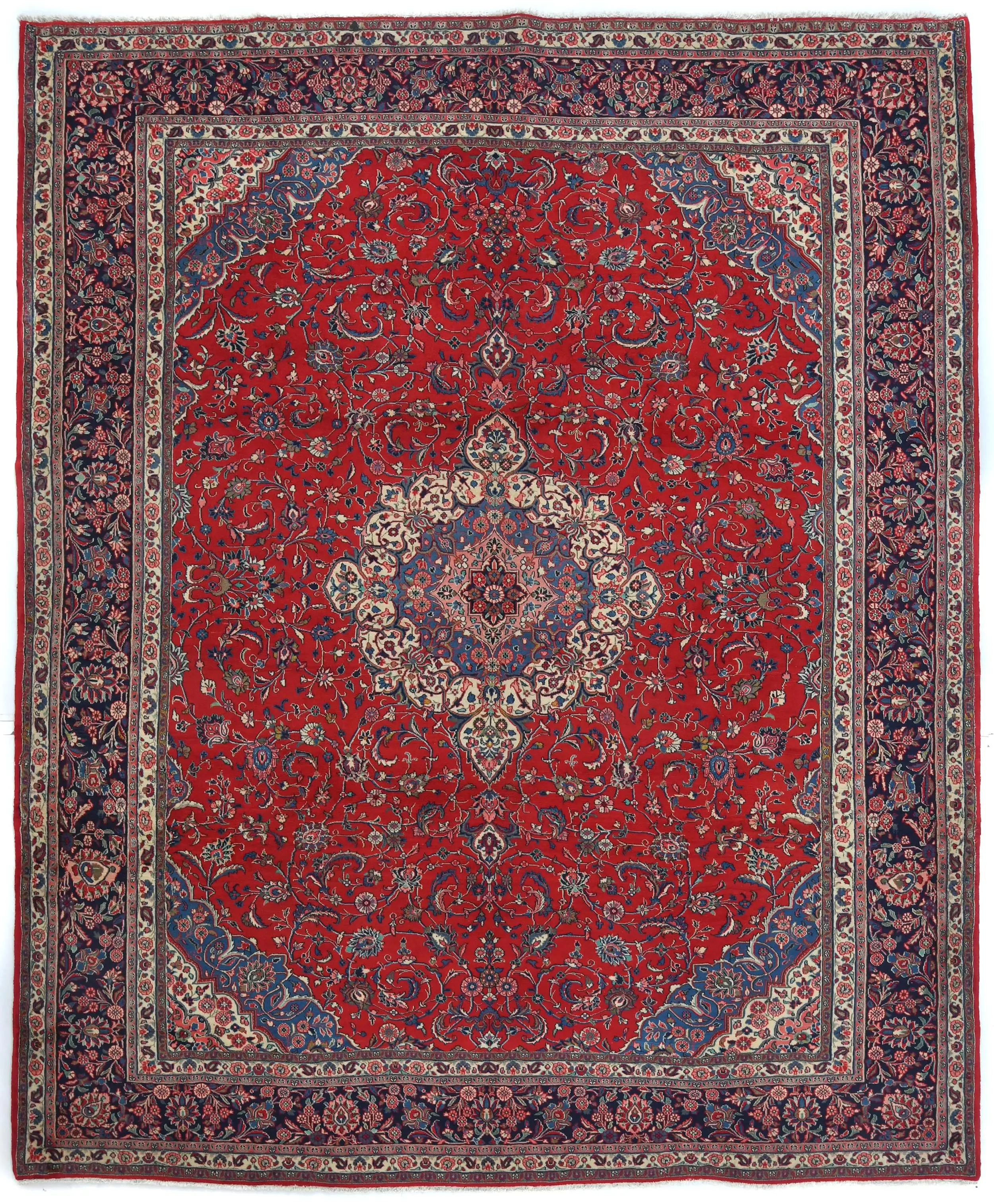 Handmade vintage 10X12 Red Persian rug made with vegetable dyes (fine wool pile and cotton foundation), exceptional knot count, and appealing ancient designs. This Oriental rug never will go out of style and would be among your most valuable treasures.
