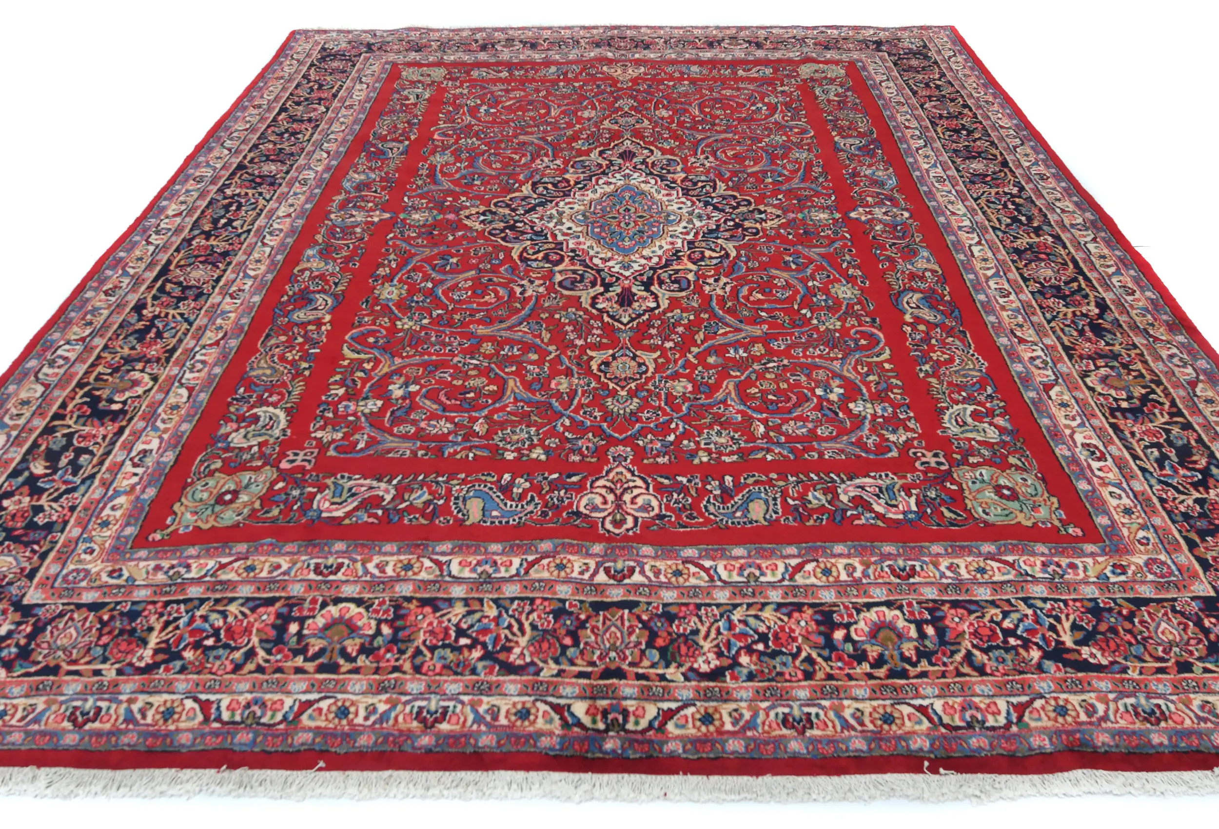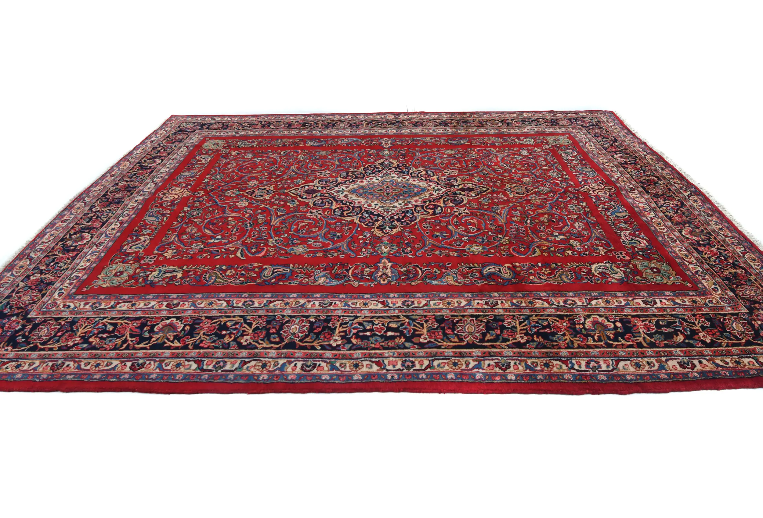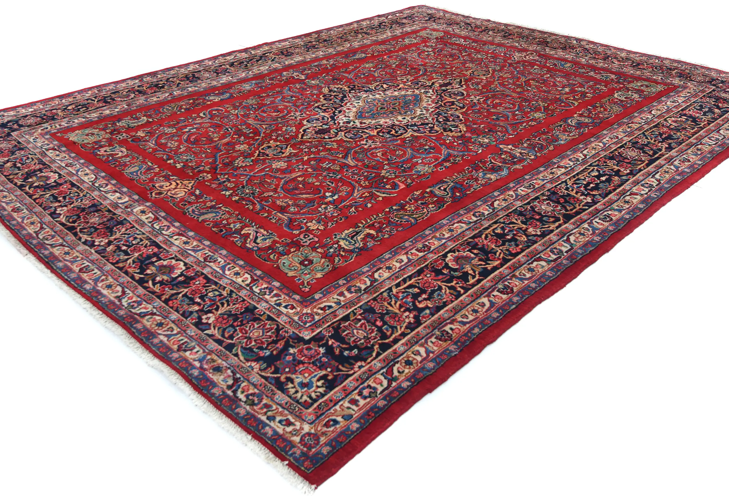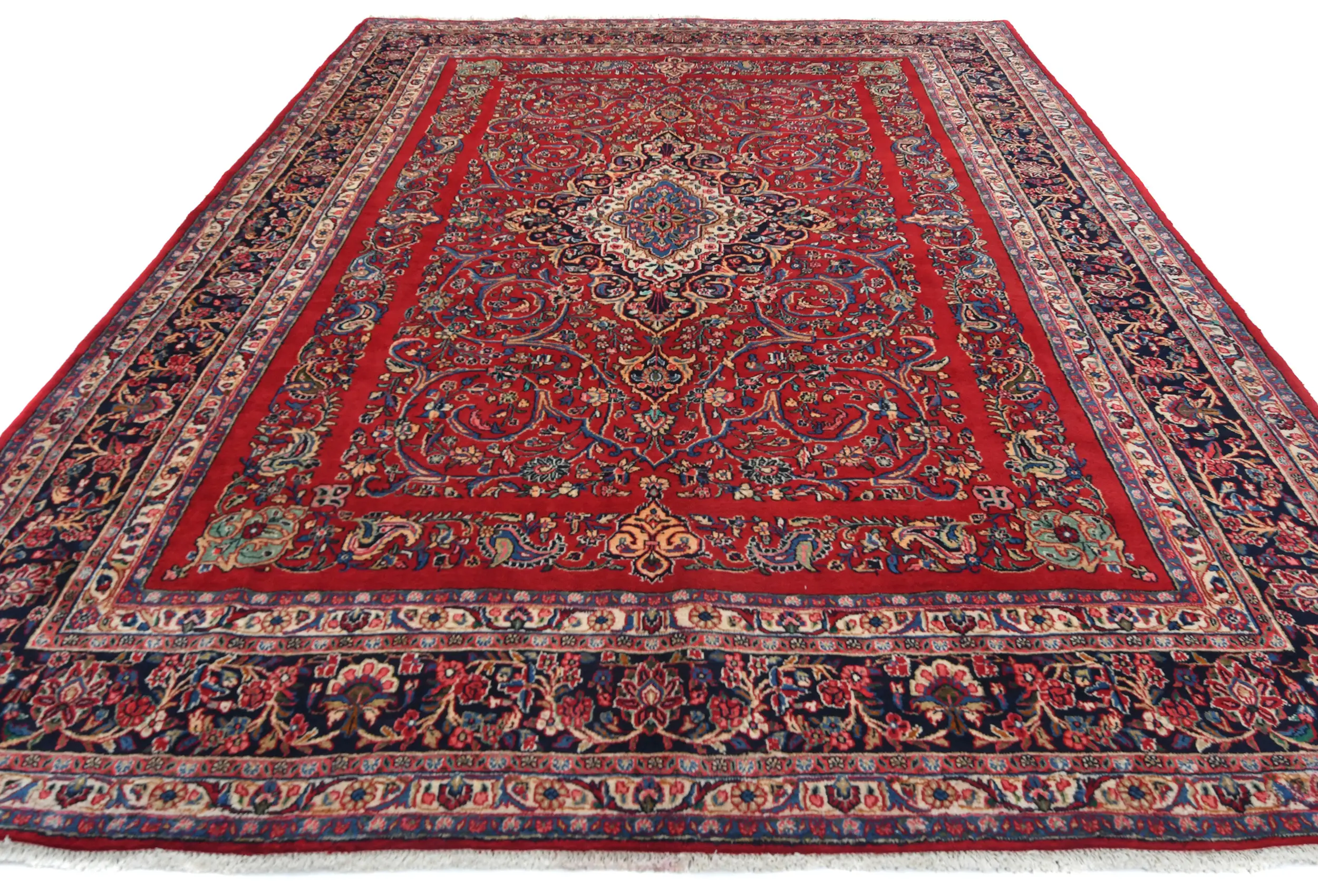 Handmade vintage 9X12 Red Persian rug made with vegetable dyes (fine wool pile and cotton foundation), exceptional knot count, and appealing ancient designs. This Oriental rug never will go out of style and would be among your most valuable treasures.
