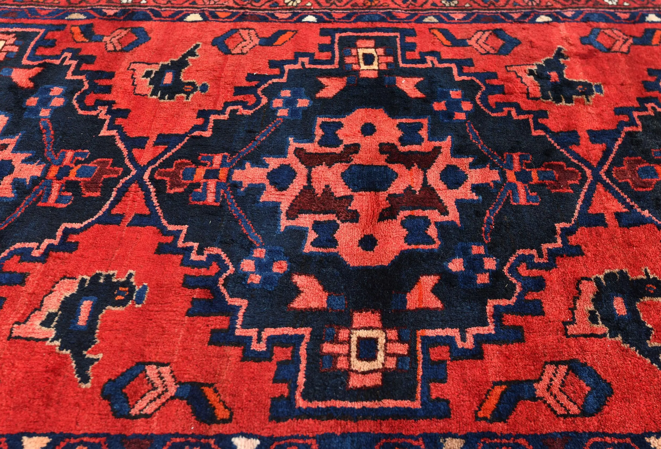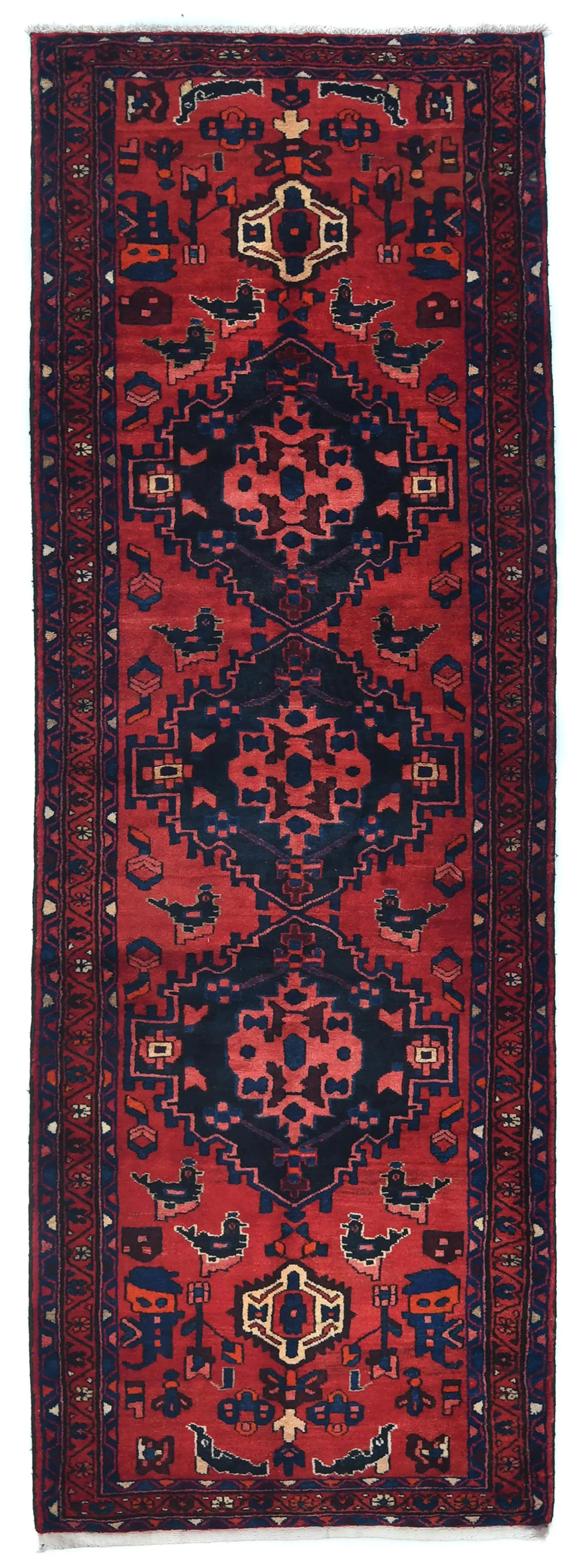 Handmade vintage 3'6X10'2 Red Persian rug made with vegetable dyes (fine wool pile and cotton foundation), exceptional knot count, and appealing ancient designs. This Oriental rug never will go out of style and would be among your most valuable treasures.