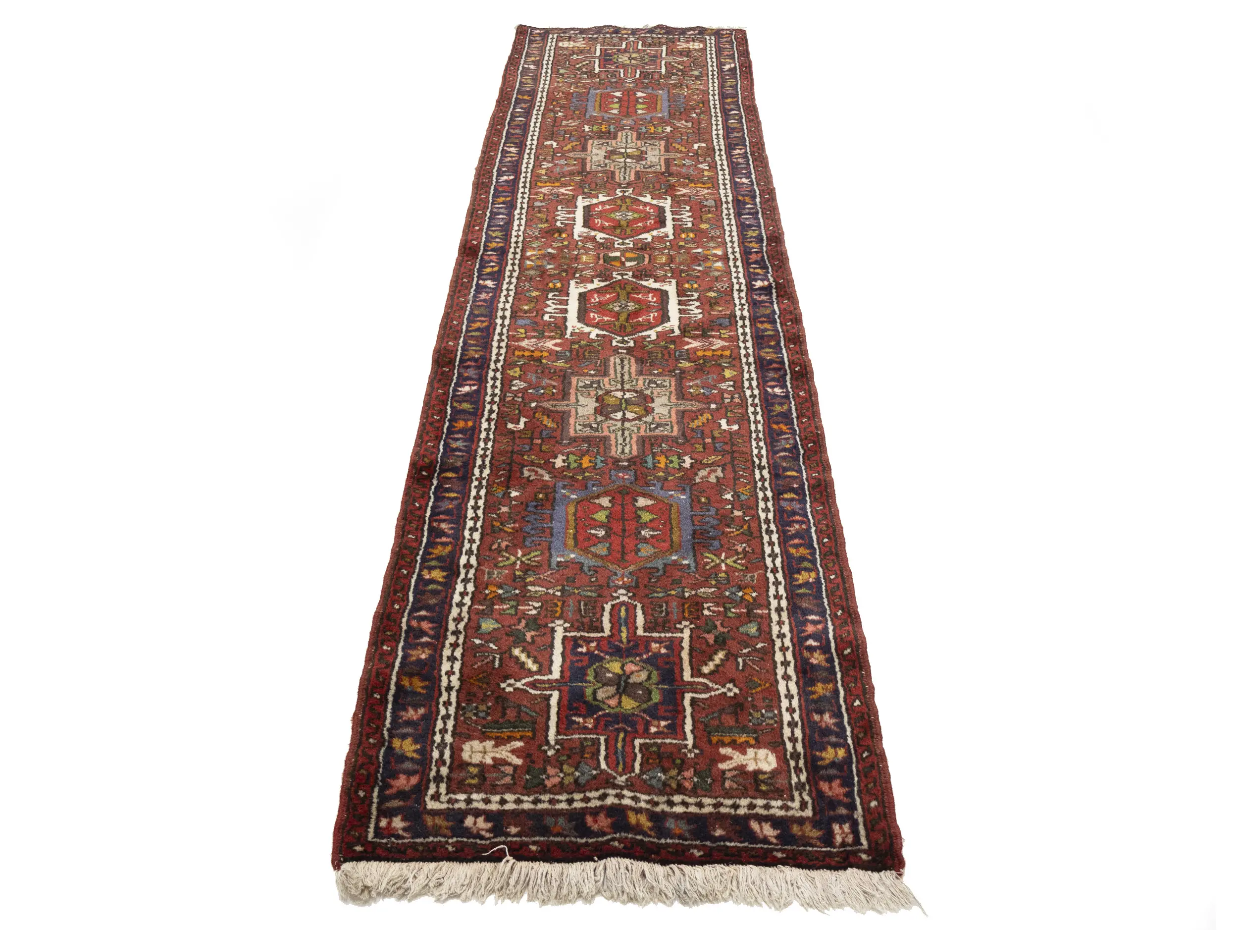 Hand Knotted 2'4X9'5 red Persian runner made with vegetable dyes (fine wool pile and cotton foundation), exceptional knot count, and appealing ancient designs. This Oriental runner never will go out of style and would be among your most valuable treasures.