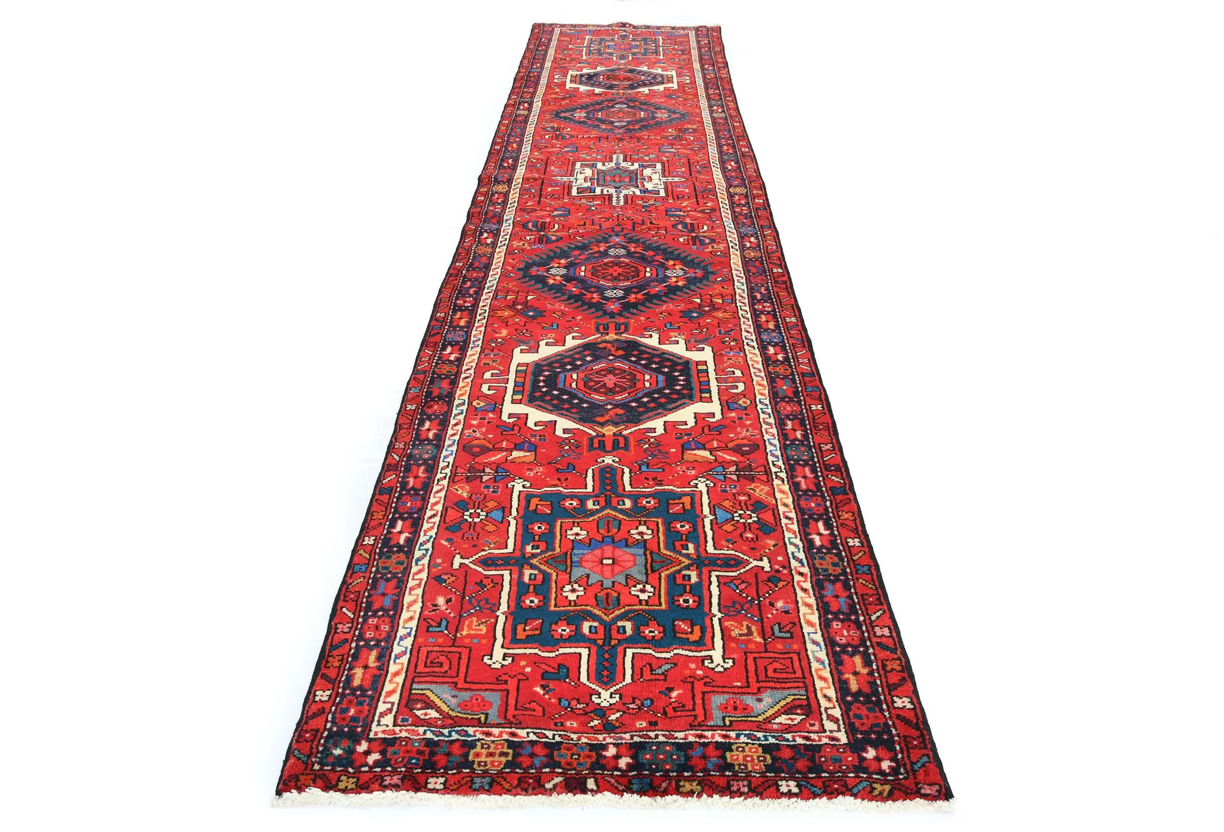 Hand Knotted 3'1X12'7 Red Persian runner made with vegetable dyes (fine wool pile and cotton foundation), exceptional knot count, and appealing ancient designs. This Oriental runner never will go out of style and would be among your most valuable treasures.