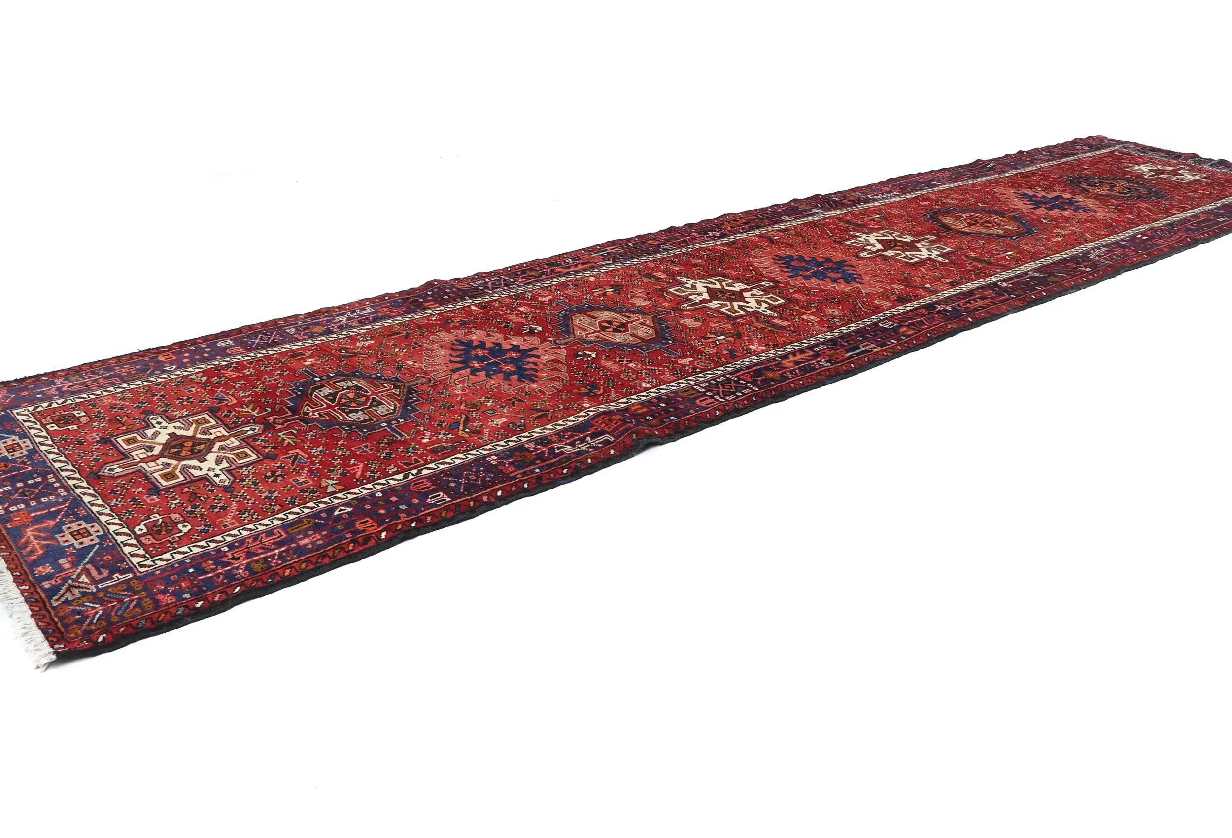 Hand Knotted vintage 3'6X14'7 Red Persian runner made with vegetable dyes (fine wool pile and cotton foundation), superior knot count, and appealing ancient designs. This Oriental runner never will go out of style and would be among your most valuable treasures.