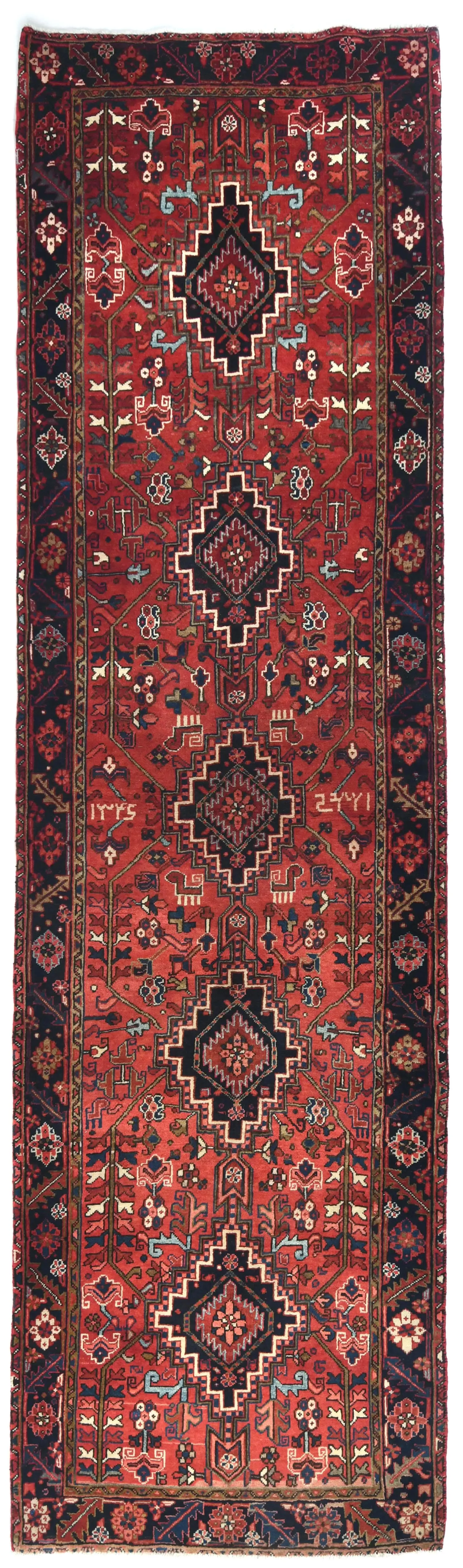 This original 3'8X11'5 red vintage Persian runner was crafted by the hands of skilled weavers enthused by a variety of lovely artistic designs, to recreate the aged look of the unique piece with a richness of color and beautifully elaborated background field. What set this geometric Oriental area runner from the others are the material and dye used (wool pile and cotton foundation), knot count, ancient designs, fantastic grades, and its regional historical connection: it has deep roots, from the story of the people who produced it to the meaning of the symbols and colors displayed across its canvas that have been praised for centuries. This home décor carpet will be completely cozy and inviting that never will go out of style! Also, this Oriental runner would be among your most valuable treasures, it is a great investment that increase in value over time, and it will last for generations because was woven with high-quality, all-natural wool; it won’t rip, tear, or shed. Environmentally friendly, opulent yet affordable; this Persian rug will give you a thorough amount of character to help define your living space with sophistication and warmth that will capture the eyes and attention of your audience (homeowners, designers, decorators, family and friends). EB-7480