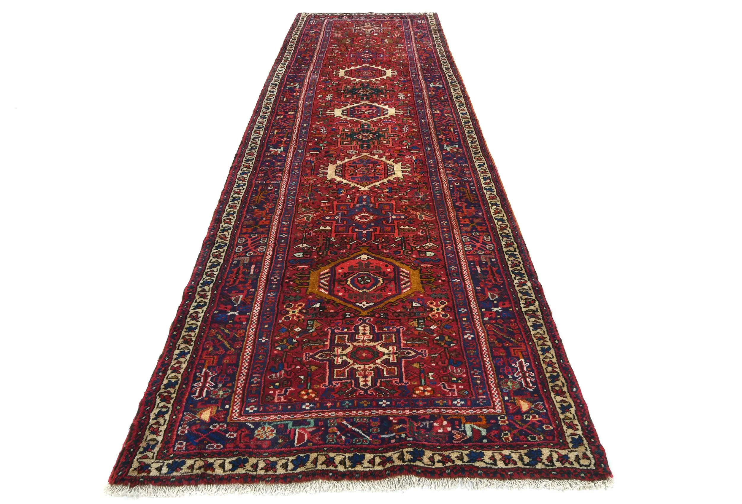 Hand Knotted vintage 4X12 Red Persian runner made with vegetable dyes (fine wool pile and cotton foundation), superior knot count, and appealing ancient designs. This Oriental runner never will go out of style and would be among your most valuable treasures.