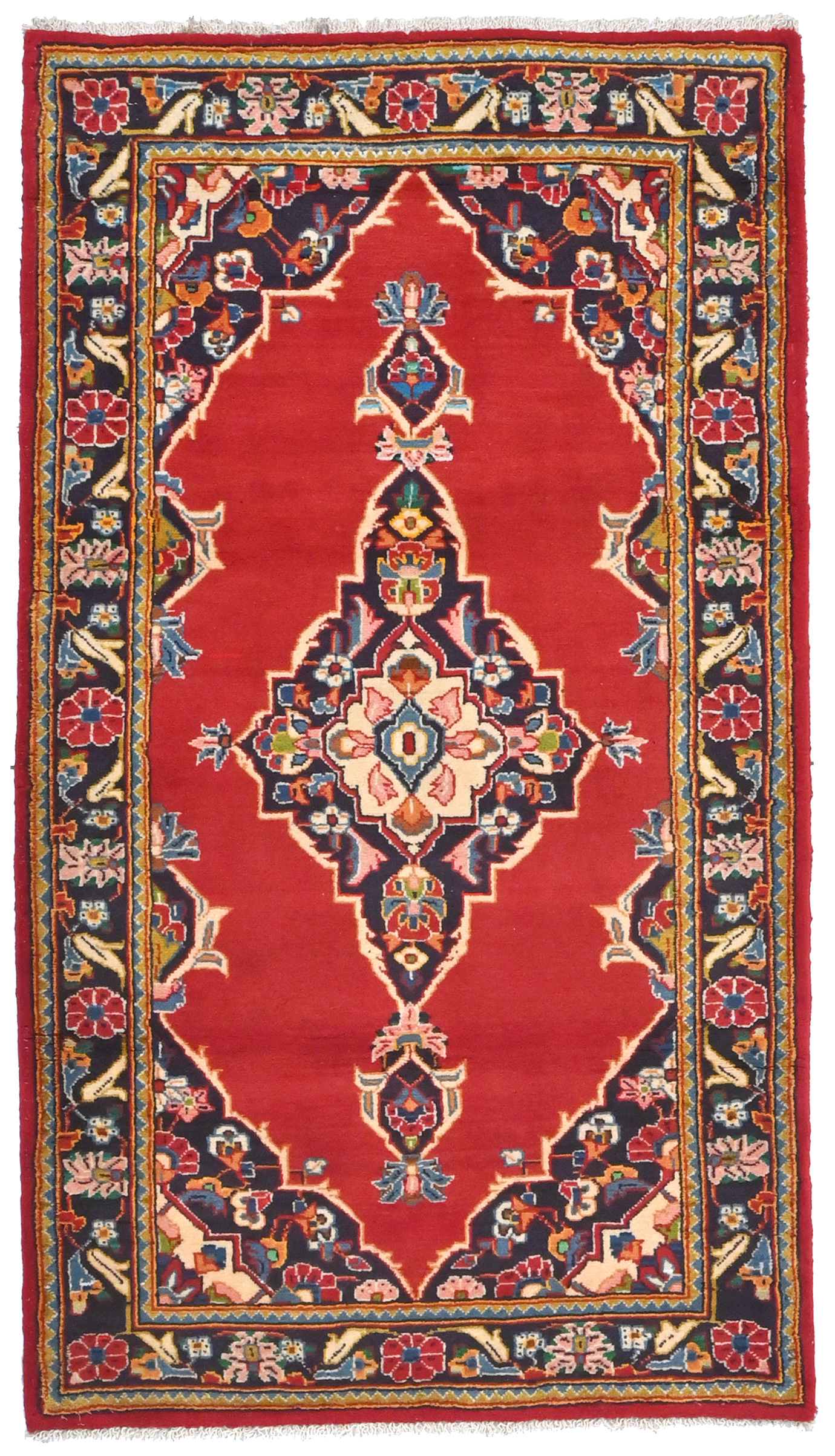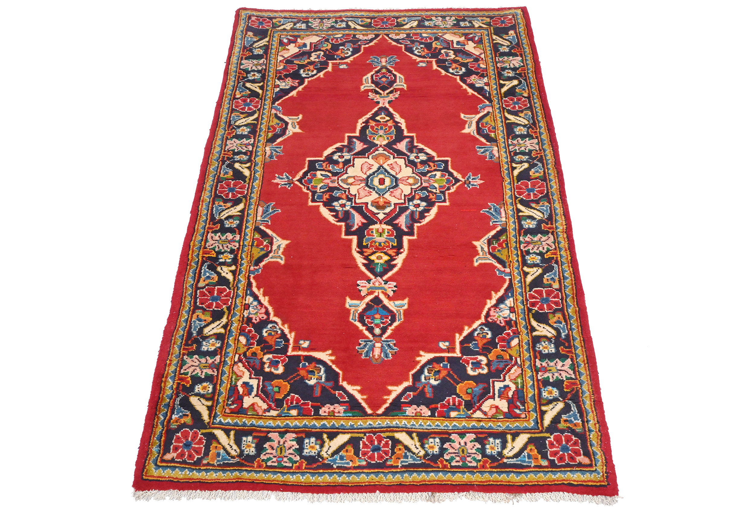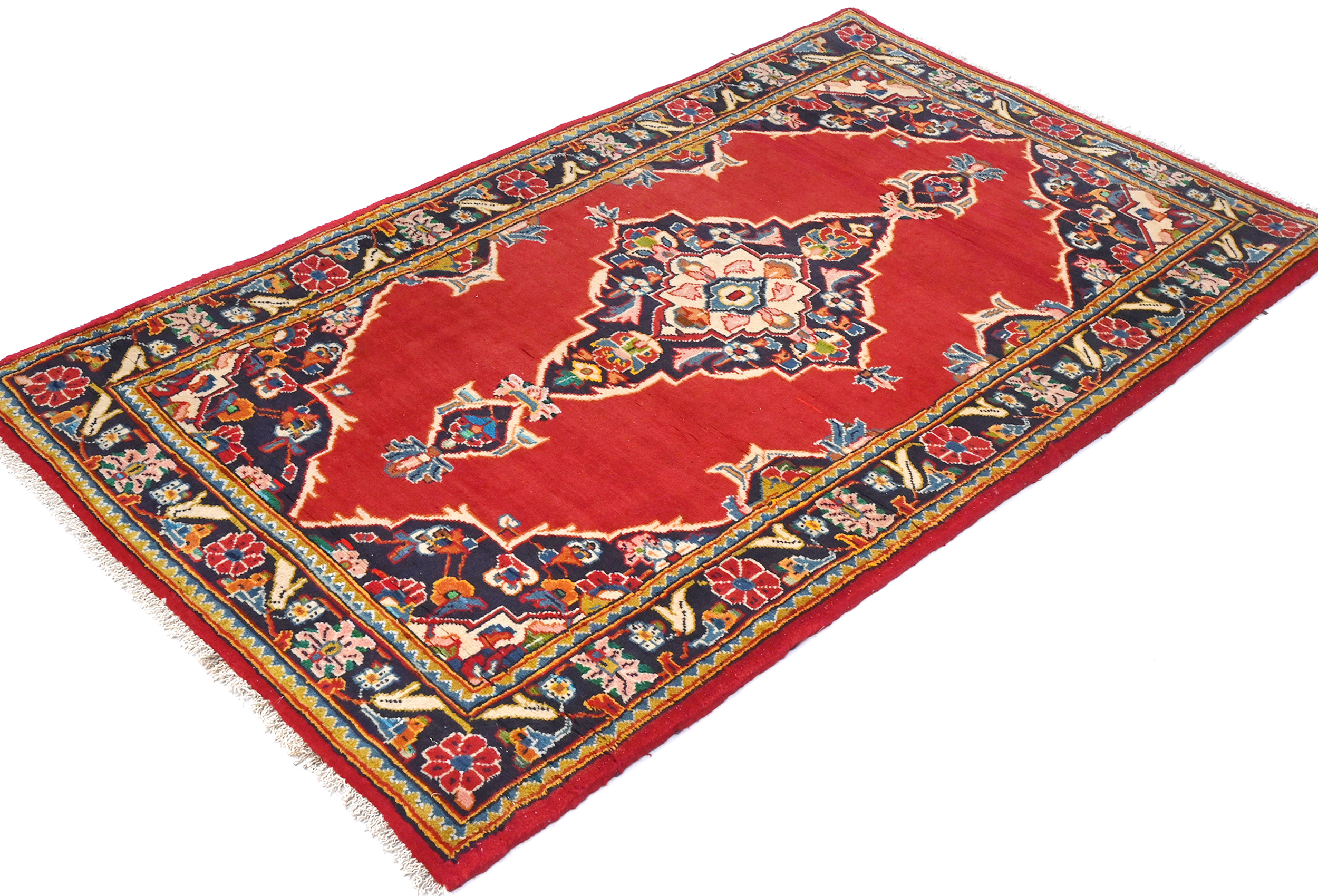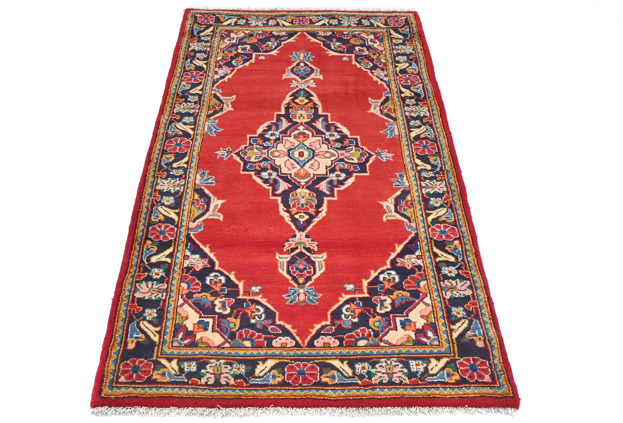 Handmade vintage 2'7X4'5 red Persian rug made with vegetable dyes (fine wool pile and cotton foundation), superior knot count, and alluring ancient designs. This Oriental rug/runner never will go out of style and would be among your most valuable treasures.
