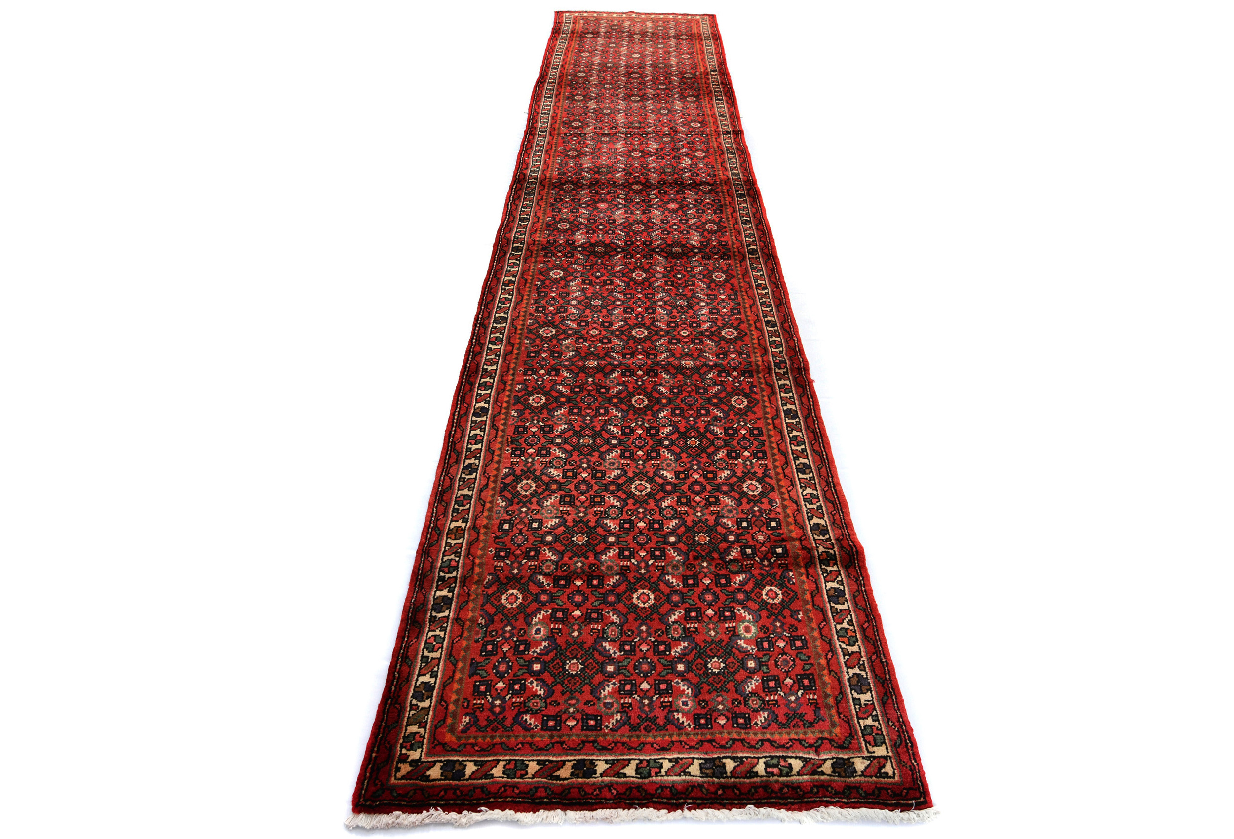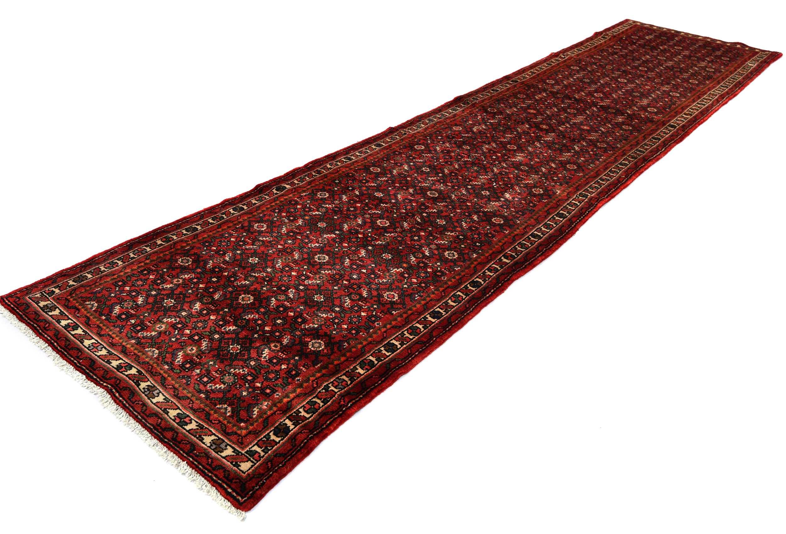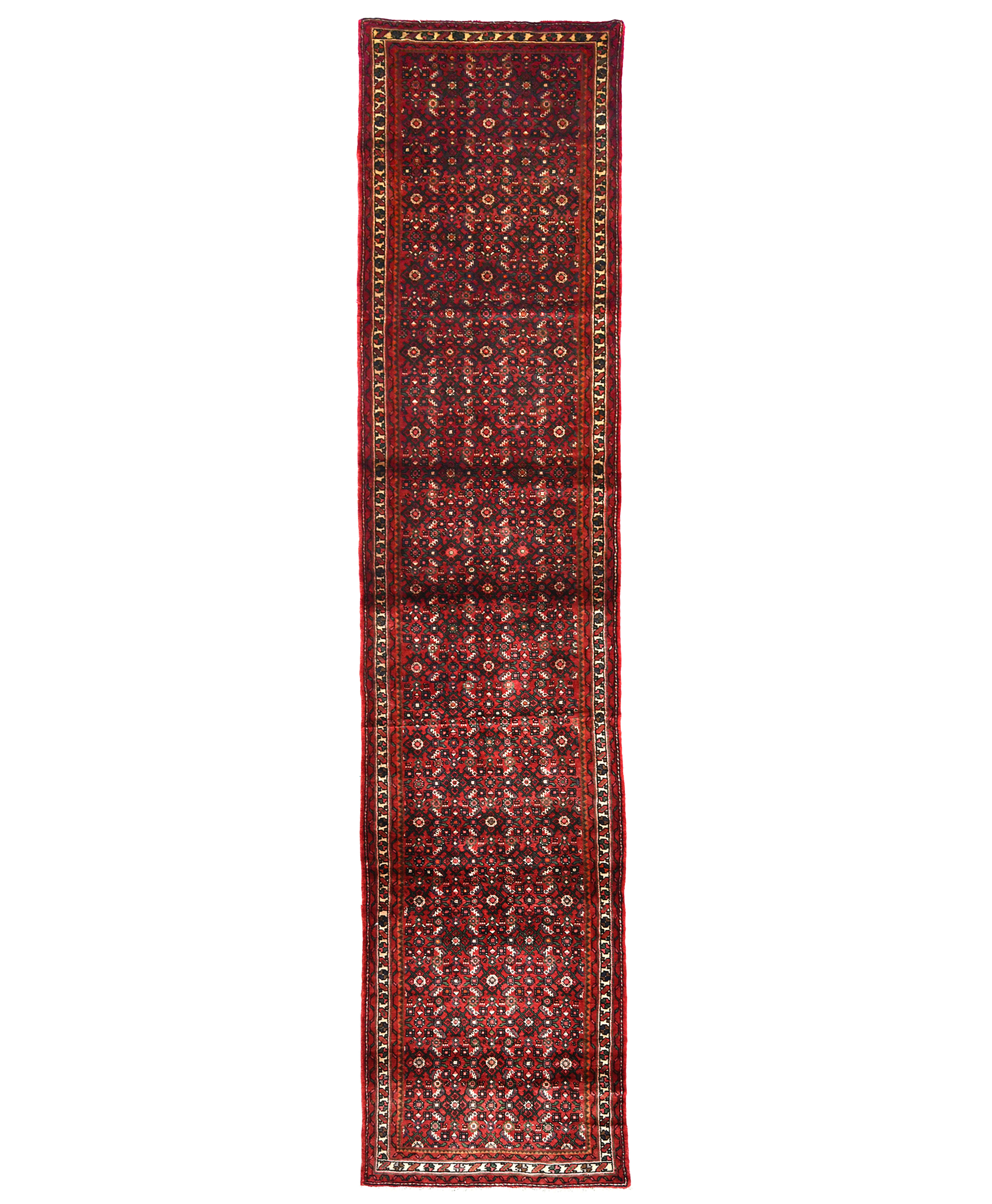 Handmade vintage 2'9X12'5 red Persian runner made with vegetable dyes (fine wool pile and cotton foundation), superior knot count, and alluring ancient designs. This Oriental runner never will go out of style and would be among your most valuable treasures.