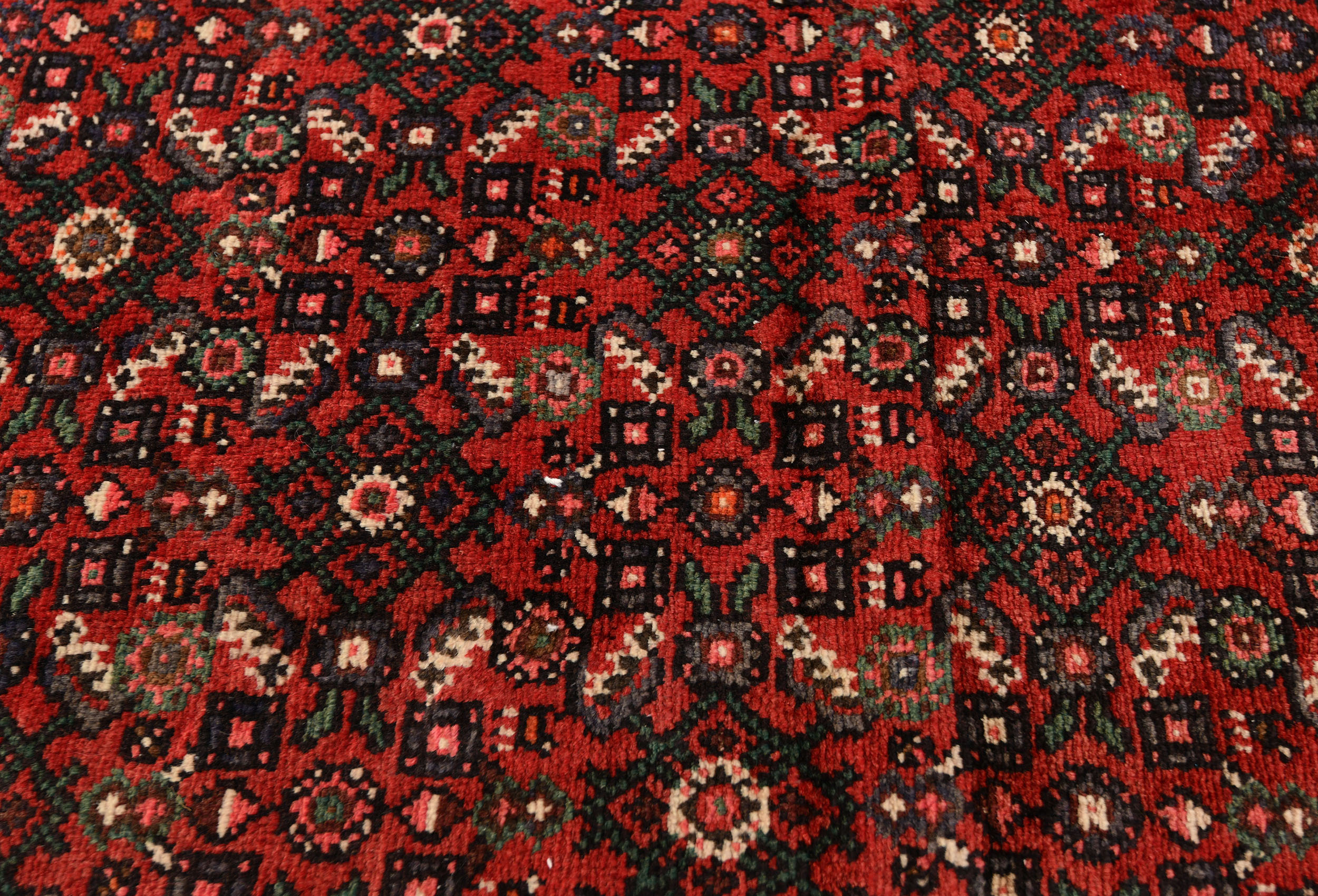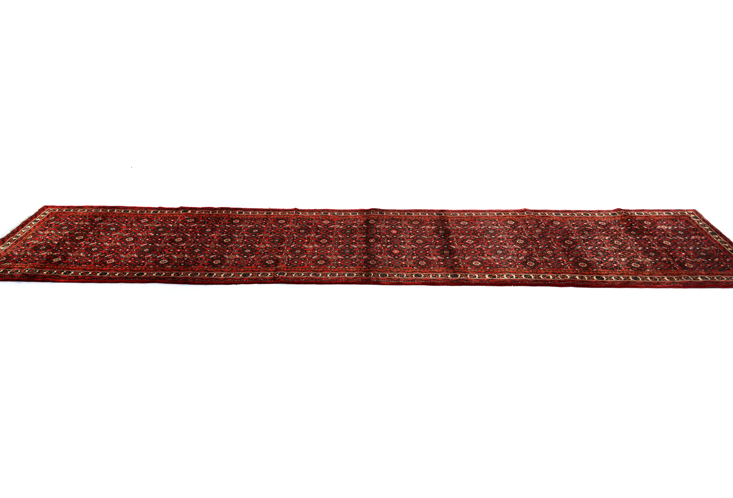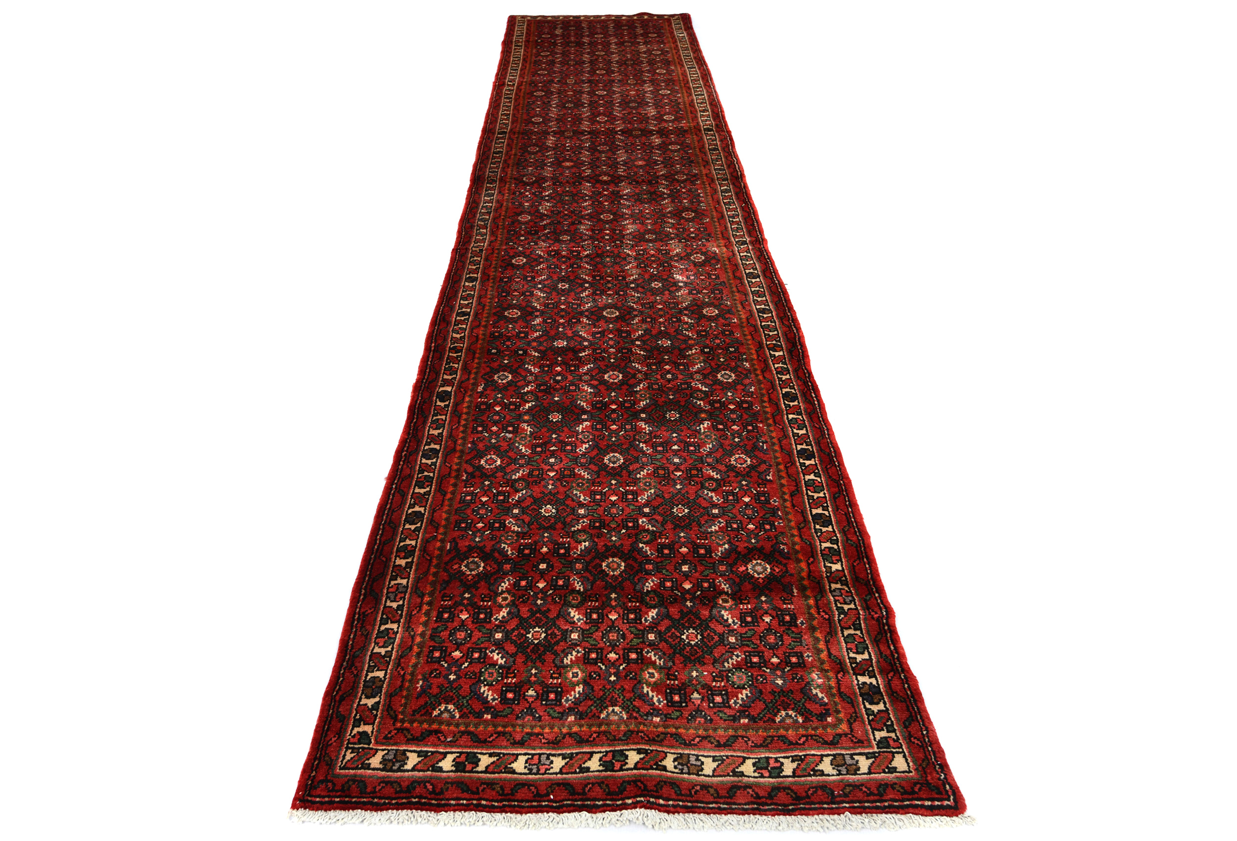 Handmade vintage 2'9X12'5 red Persian runner made with vegetable dyes (fine wool pile and cotton foundation), superior knot count, and alluring ancient designs. This Oriental runner never will go out of style and would be among your most valuable treasures.