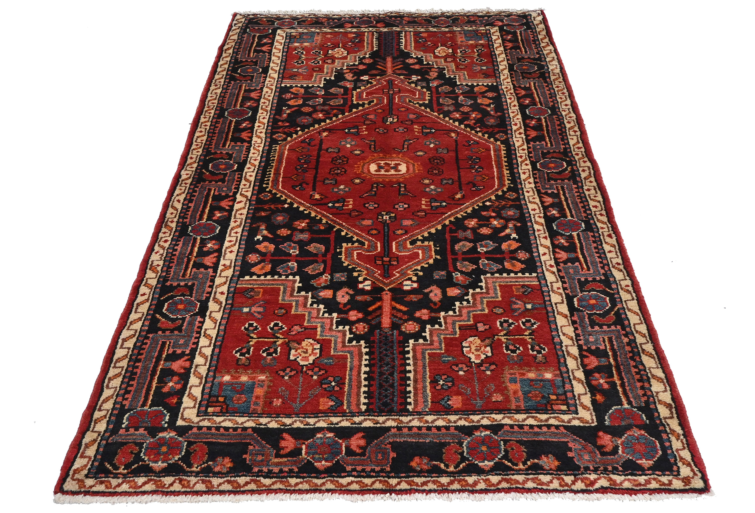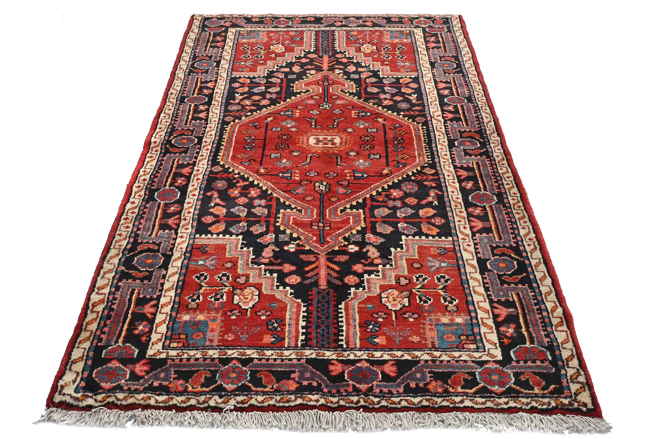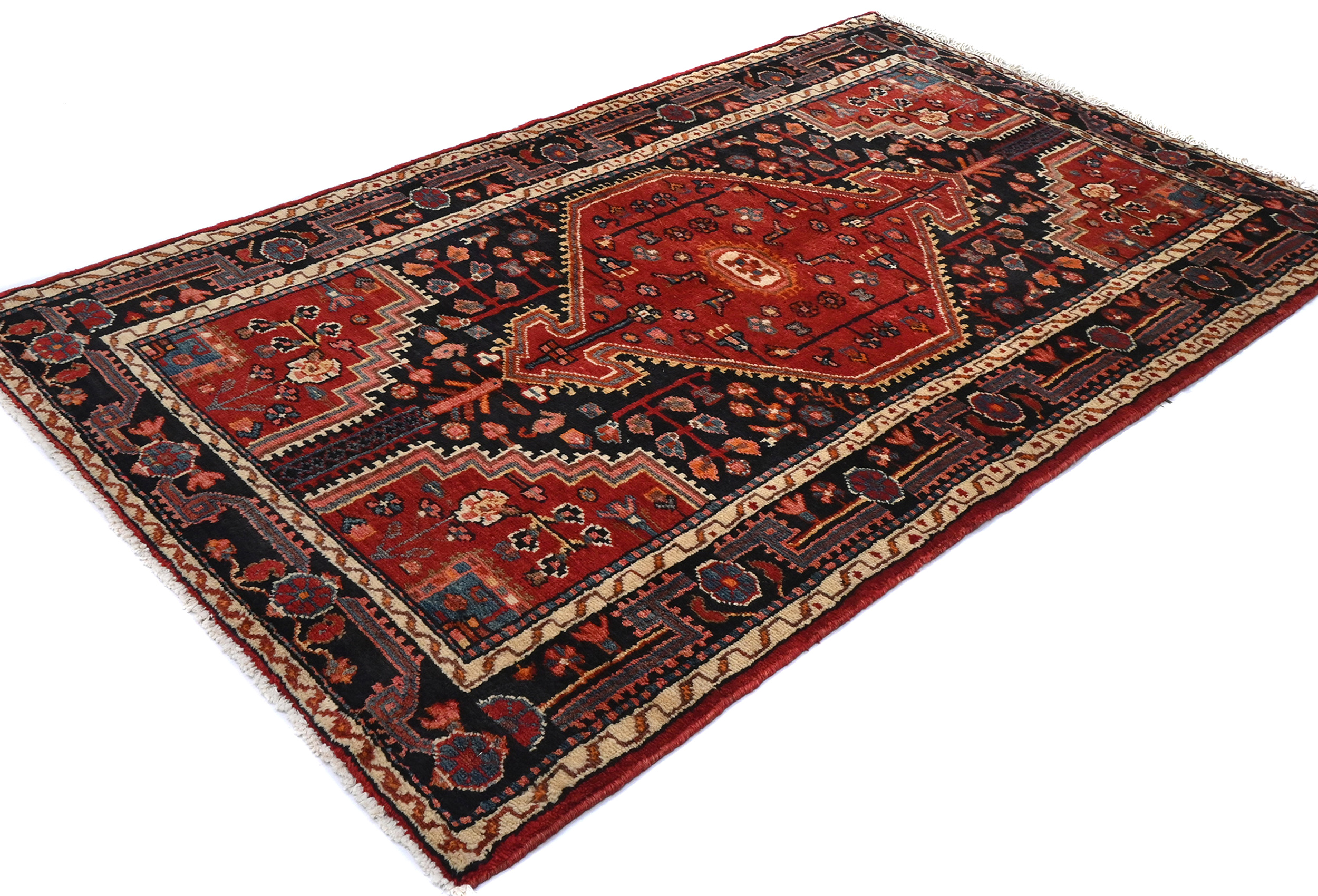 Handmade vintage 3'7X6 red Persian rug made with vegetable dyes (fine wool pile and cotton foundation), superior knot count, and alluring ancient designs. This Oriental rug never will go out of style and would be among your most valuable treasures.