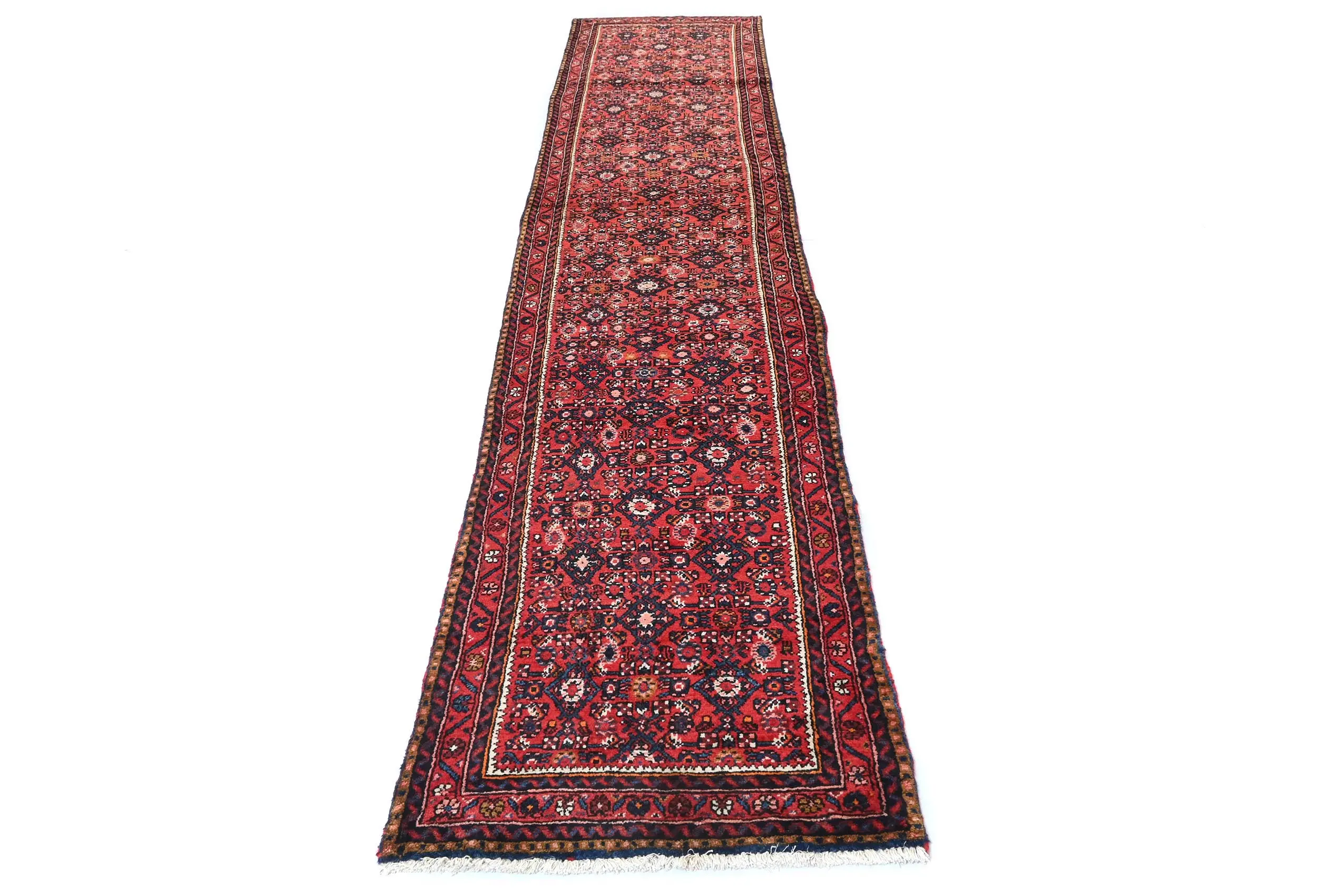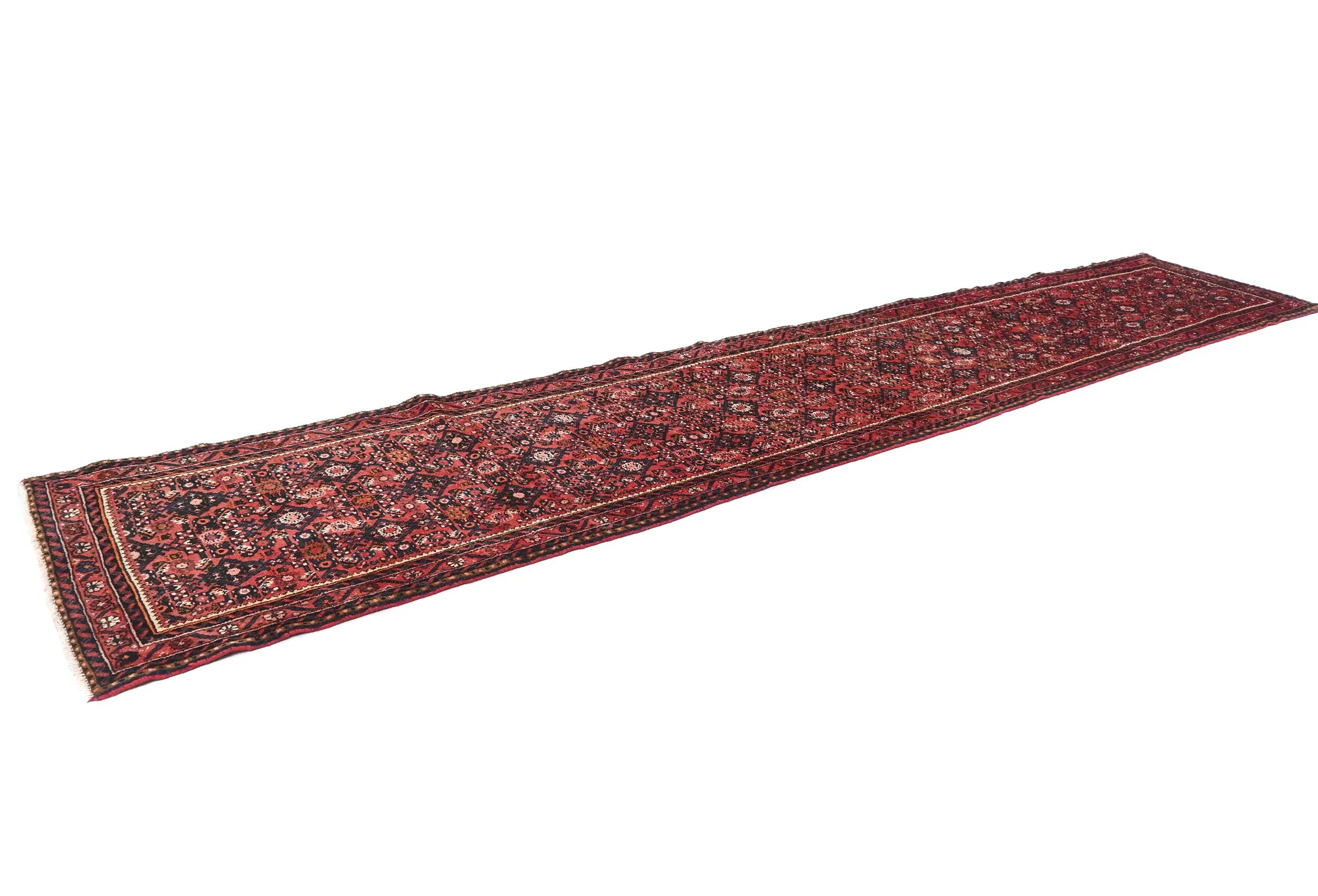 Handmade vintage 3X13 Red Persian runner made with vegetable dyes (fine wool pile and cotton foundation), superior knot count, and alluring ancient designs. This Oriental runner never will go out of style and would be among your most valuable treasures.