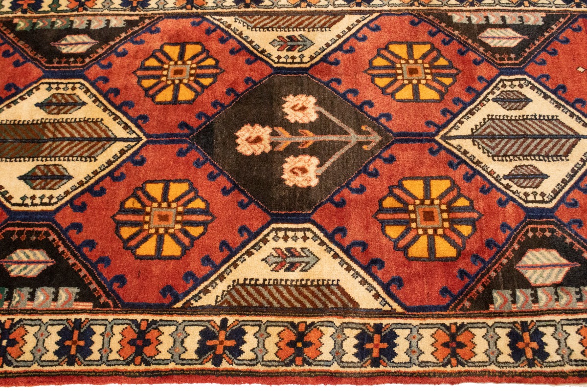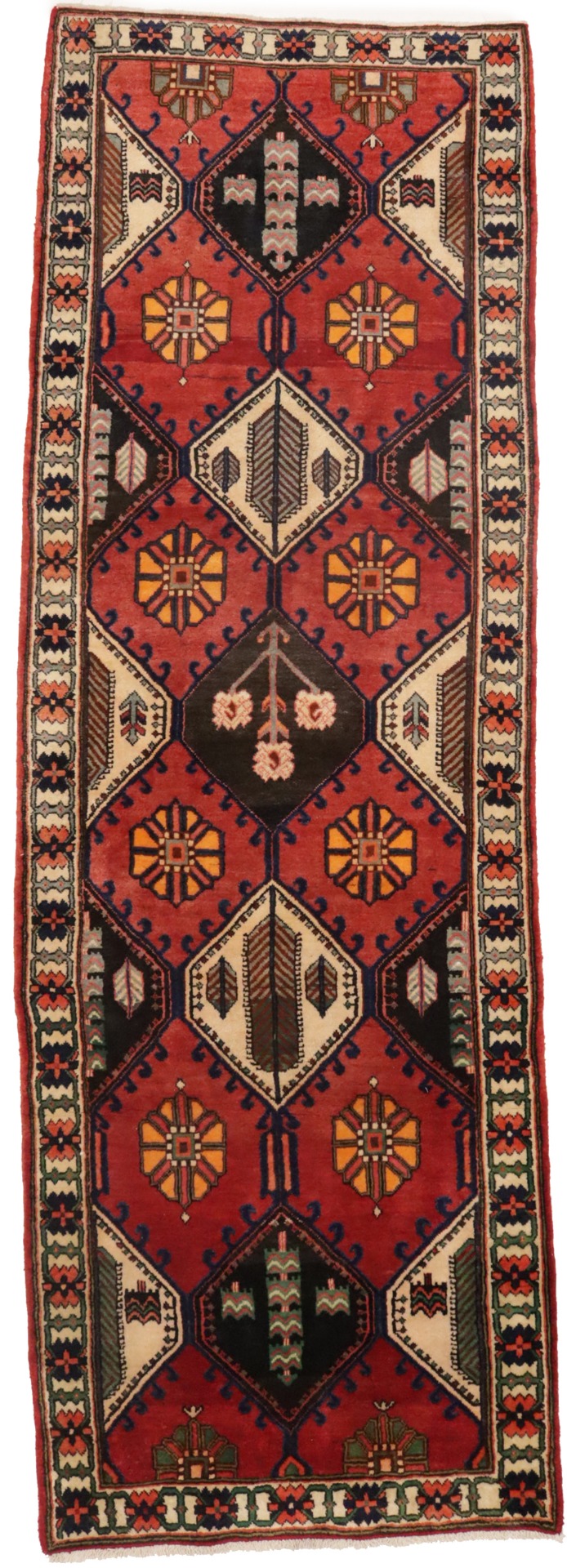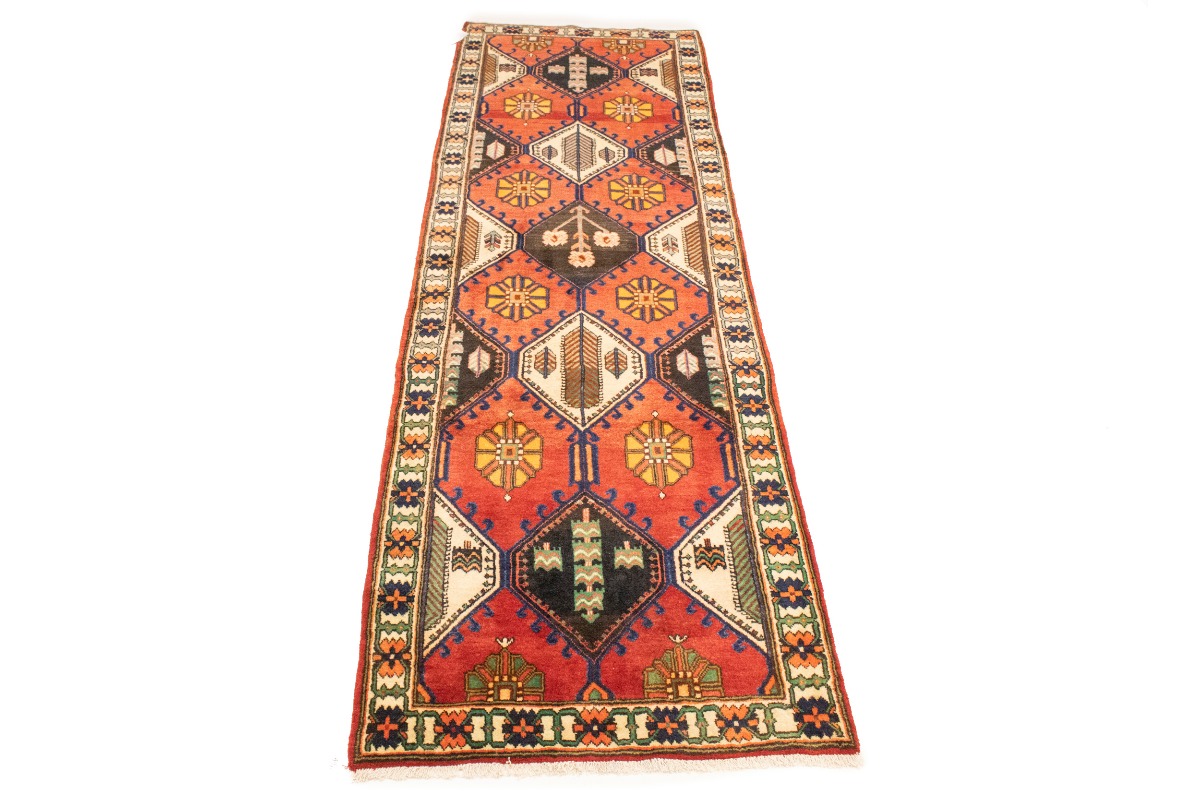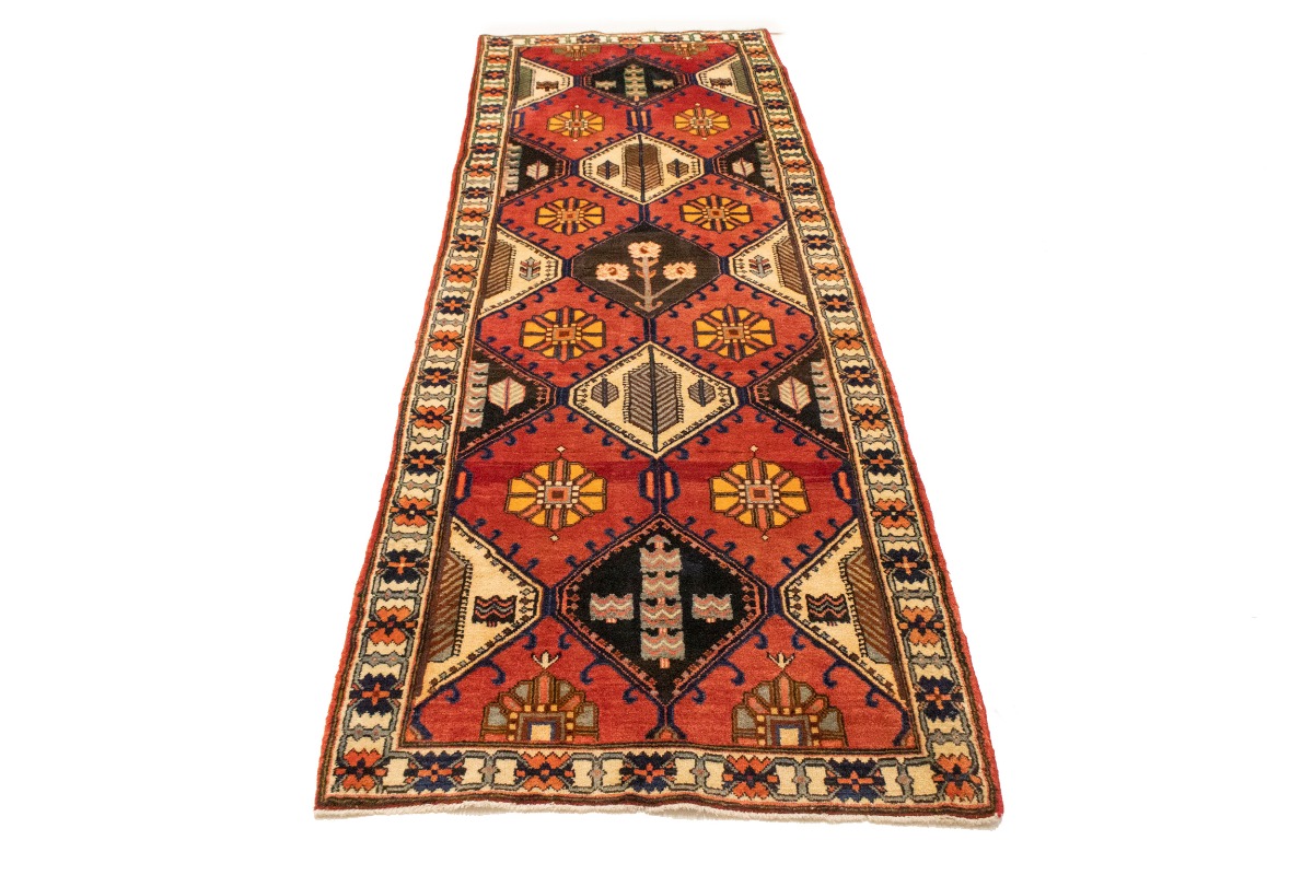 Hand Knotted vintage 3'5X10'3 rusty red Persian runner made with vegetable dyes (fine wool pile and cotton foundation), exceptional knot count, and alluring ancient designs. This Oriental runner never will go out of style and would be among your most valuable treasures.