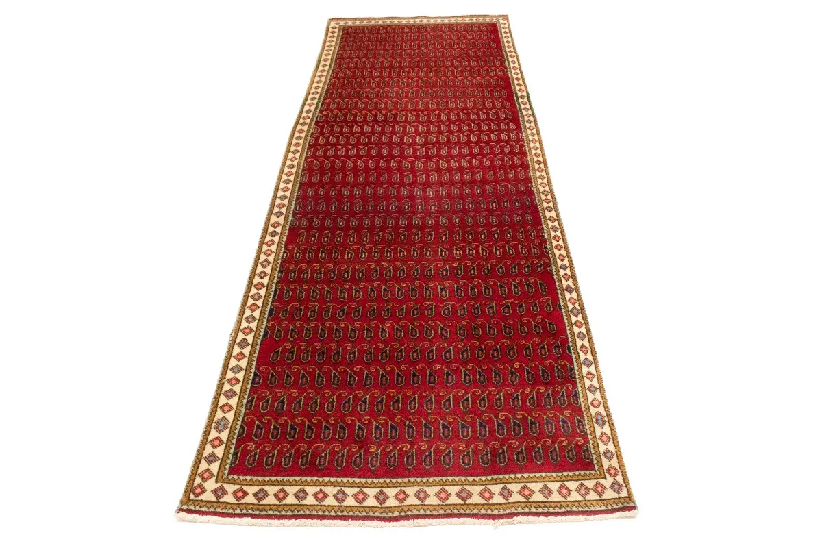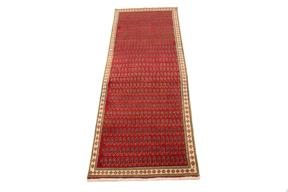 Hand Knotted vintage 3'4X9'7 red Persian runner made with vegetable dyes (fine wool pile and cotton foundation), exceptional knot count, and appealing ancient designs. This Oriental runner never will go out of style and would be among your most valuable treasures.