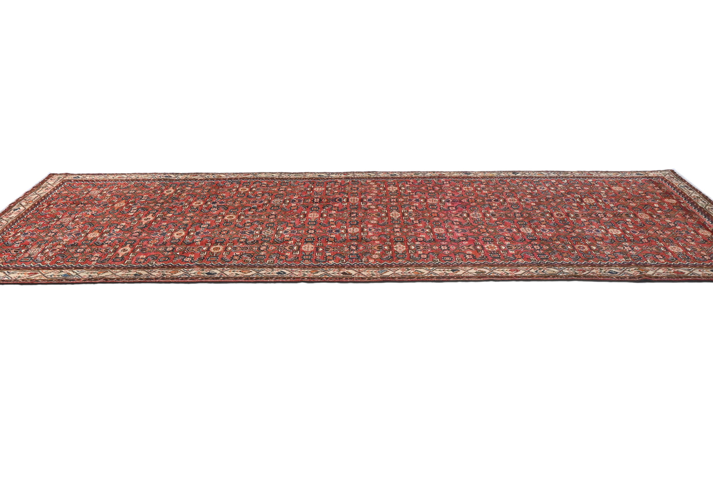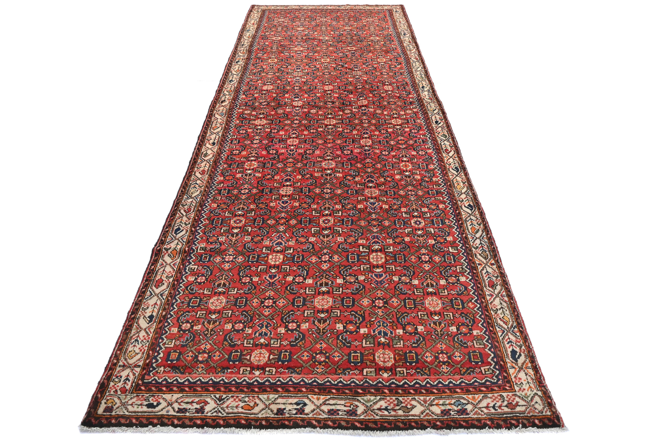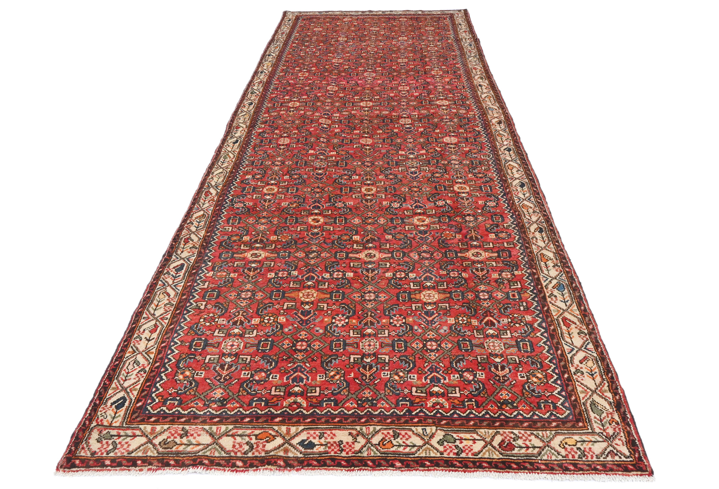 Handmade vintage 5X13 red Persian runner made with vegetable dyes (fine wool pile and cotton foundation), superior knot count, and alluring ancient designs. This Oriental runner never will go out of style and would be among your most valuable treasures.
