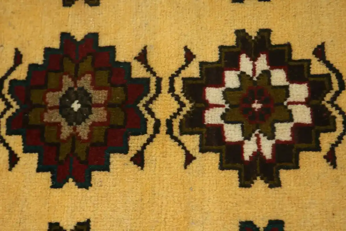 This genuine 3X6 Ivory vintage Persian rug was made by the hands of gifted weavers inspired by a variety of spectacular artistic designs, to recreate the aged look of the original piece with a richness of color and ornately patterned background field. What set this tribal Oriental area rug from the others are the material and dye used (wool pile and cotton foundation), knot count, ancient designs, fantastic grades, and its regional historical connection: it has deep roots, from the story of the people who produced it to the meaning of the symbols and colors displayed across its canvas that have been praised for centuries. This home décor carpet will be completely cozy and inviting that never will go out of style! Also, this Oriental rug would be among your most valuable treasures, it is a great investment that accrues value over time, and it will last for generations because was woven with high-quality, all-natural wool; it won’t rip, tear, or shed. Environmentally friendly, opulent yet affordable; this Persian rug will give you a thorough amount of character to help define your living space with elegance and warmth that will capture the eyes and attention of your audience (homeowners, designers, decorators, family and friends). EB-1344